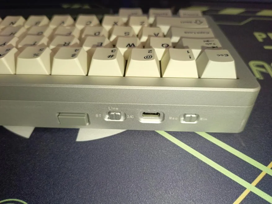 Внутри установлен аккумулятор с ёмкостью 4600mAh, который заряжается через современный type-c разъем. Клавиатура может работать в двух режимах: MAC или WIN. Для переключения между режимами установлен тумблер на задней стороне корпуса.