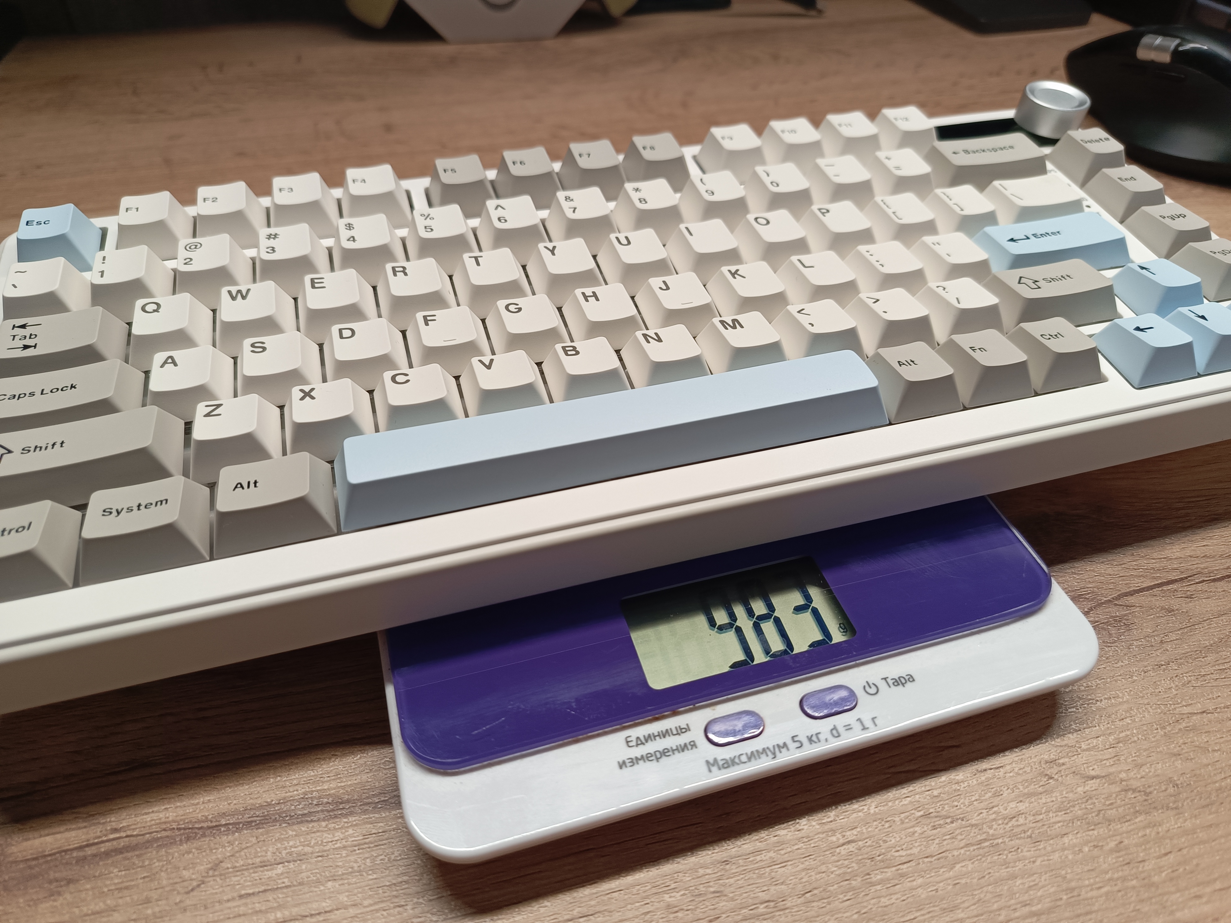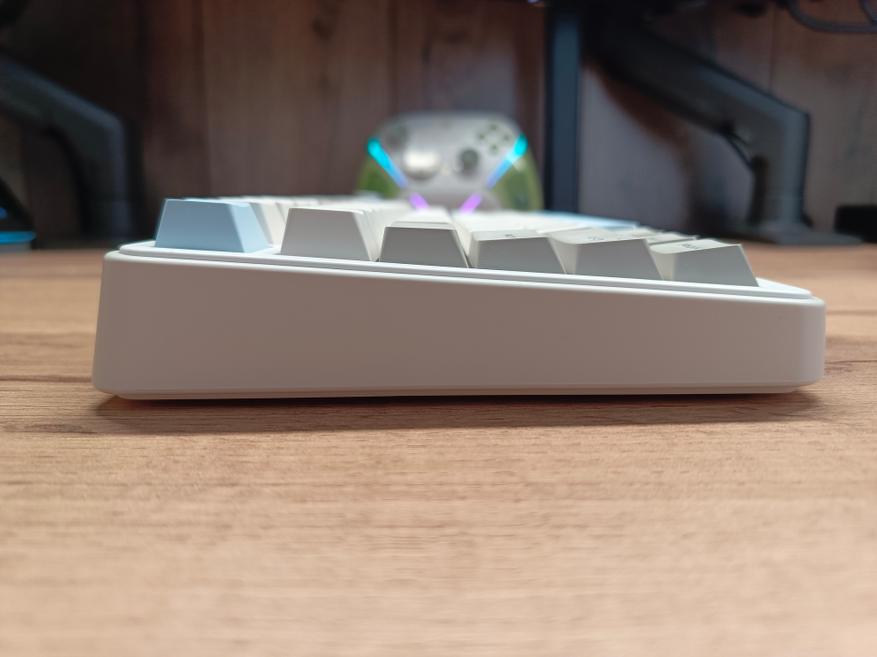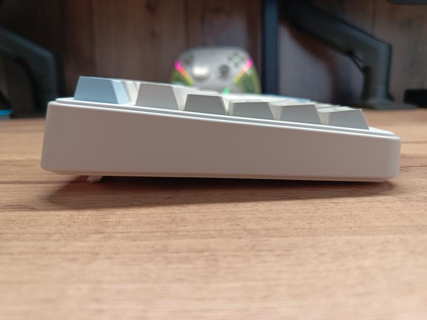 Провод белого цвета с фирменной липучкой. Он мягкий, но фильтрации от высокочастотных помех нет, а длина кабеля составляет 1,5 метра. Клавиатура весит достаточно ощутимо — 983 грамма, что для формата TKL довольно много. Благодаря этому устройство уверенно держится на столе и сдвинуть её случайно практически невозможно.
