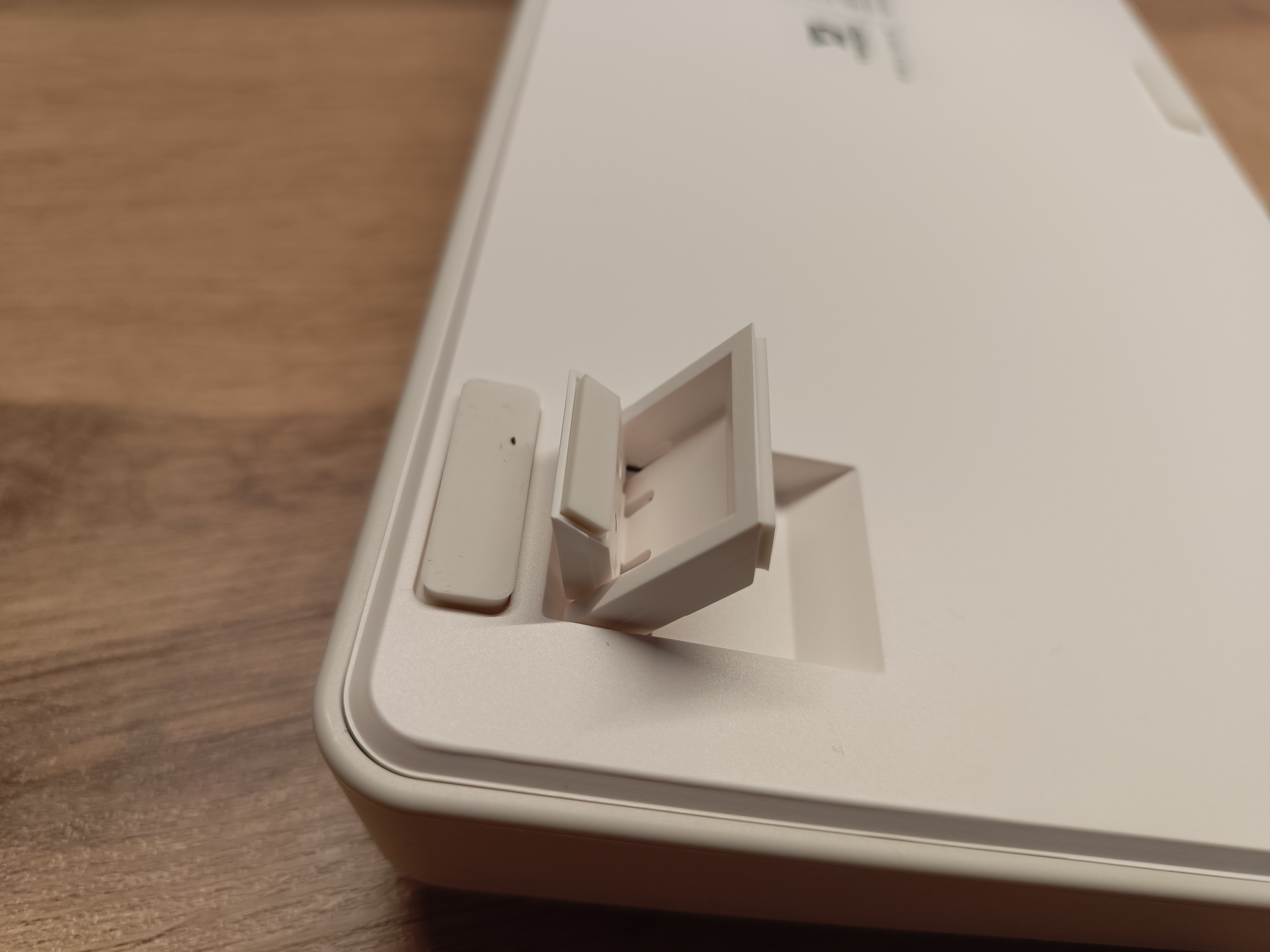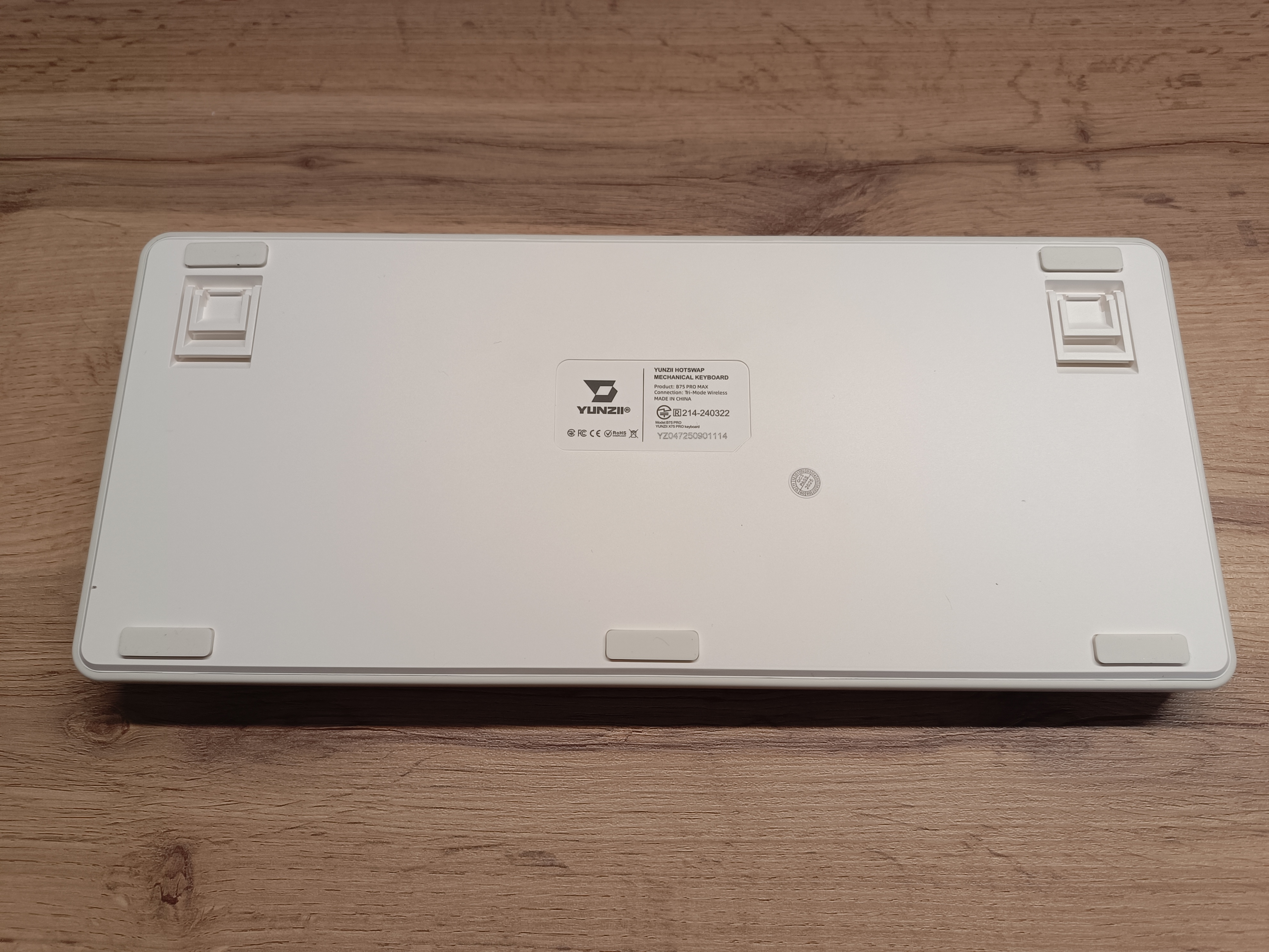 На обратной стороне клавиатуры расположен донгл для подключения по радиоканалу. У разных моделей этого бренда донгл фиксируется по-разному: в некоторых он прячется под логотипом, в других — в специальном отсеке с магнитом или на механической кнопке. В модели B75 PRO MAX донгл просто вставляется в корпус.