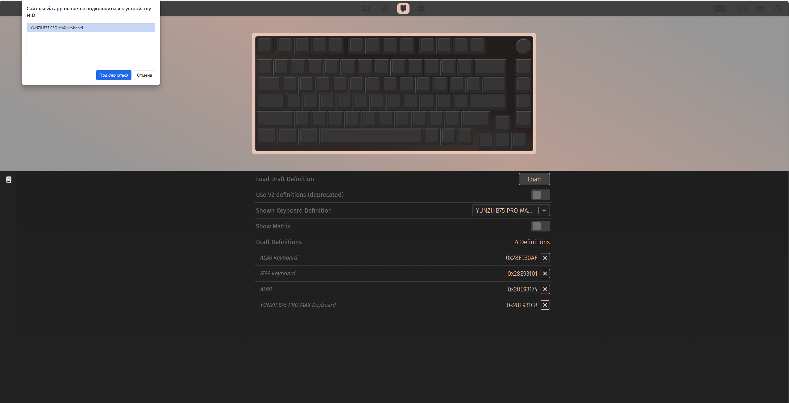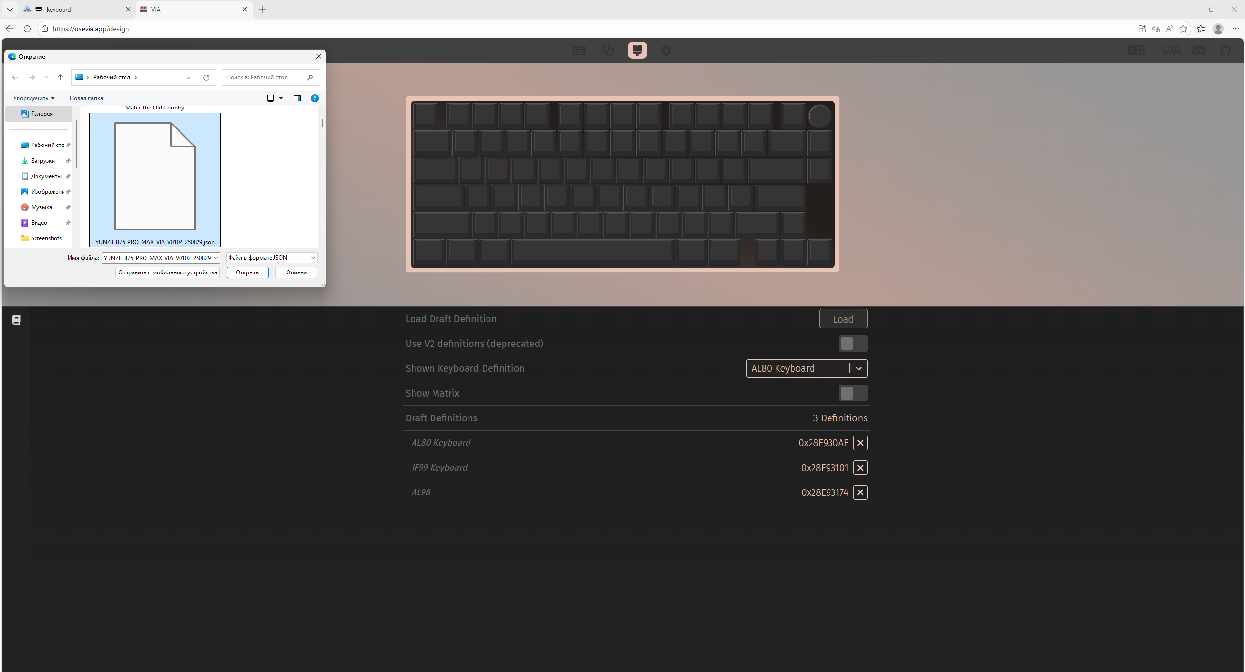 Для настройки клавиатуры с сайта YUNZII необходимо скачать файл конфигурации для конкретной модели и загрузить его в открывшемся окне браузера. Фирменного программного обеспечения нет, используется только VIA-профиль, который работает прямо через браузер. Лично я отмечаю, что наиболее стабильно это работает через встроенный браузер Windows Edge.