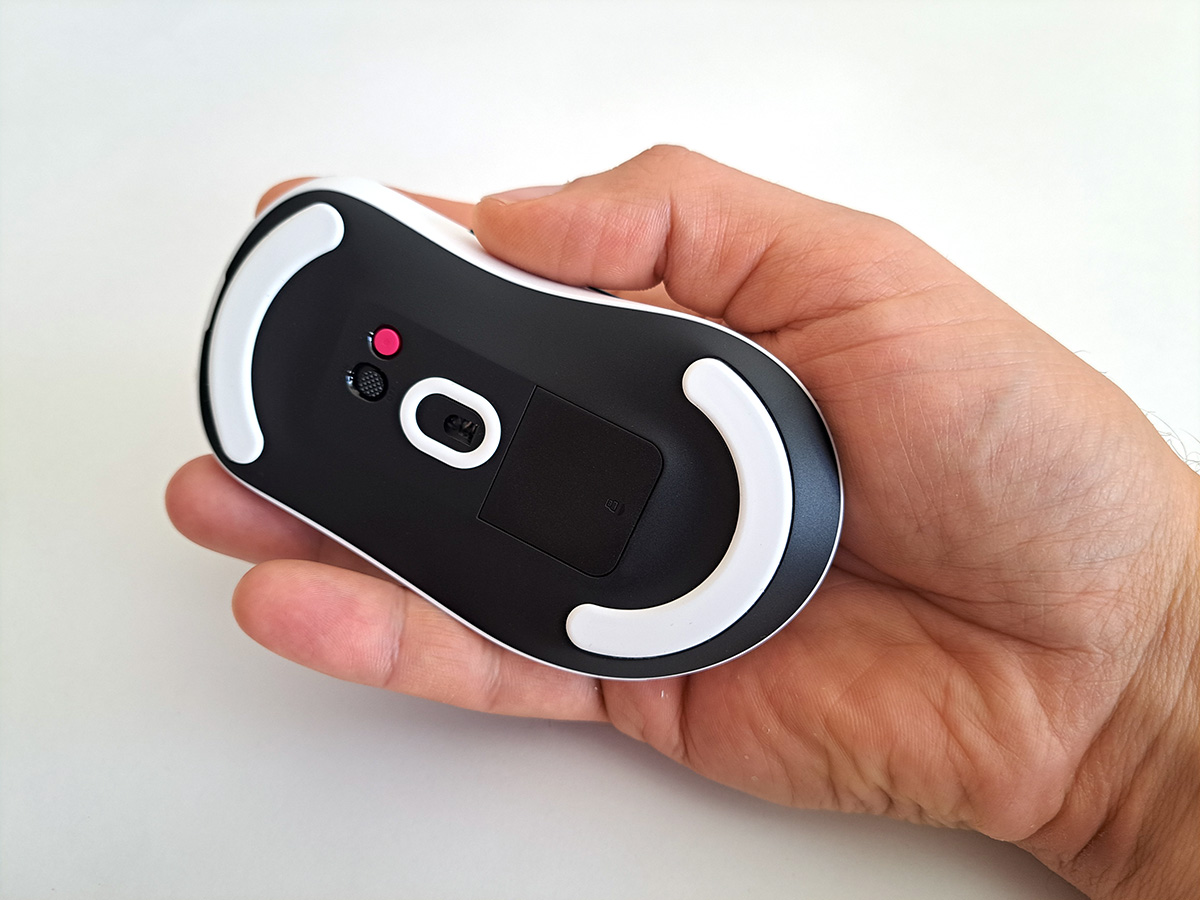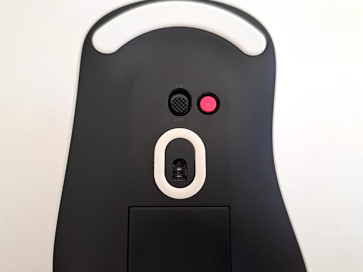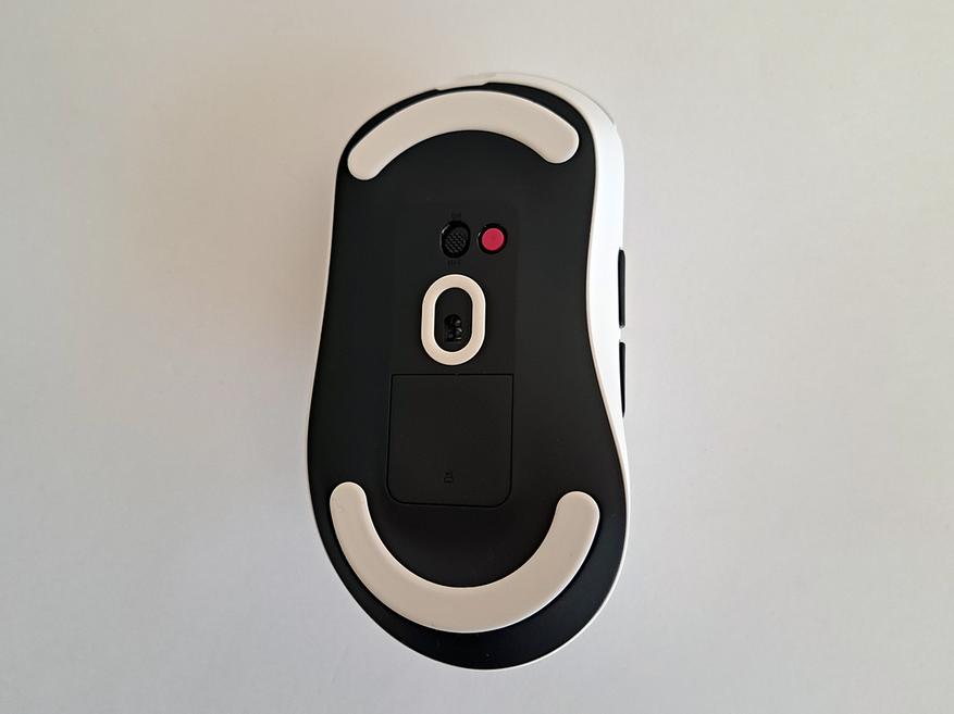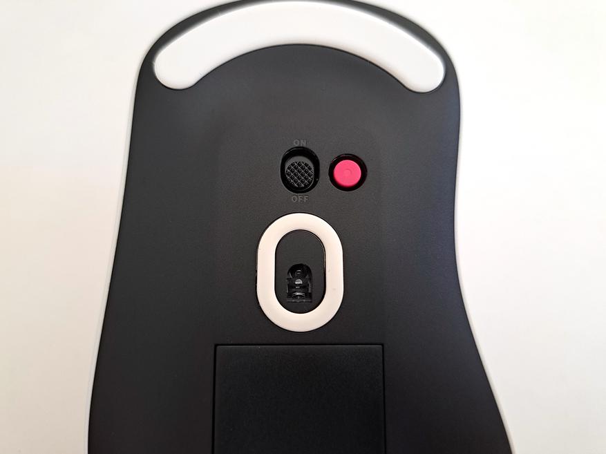 На брюшке мыши расположен тумблер вкл/выкл, и кнопка переключения частоты опроса. Вокруг окошка сенсора, имеется дополнительная тефлоновая наклейка. Как правило, у неигровых мышей, такое не увидишь.