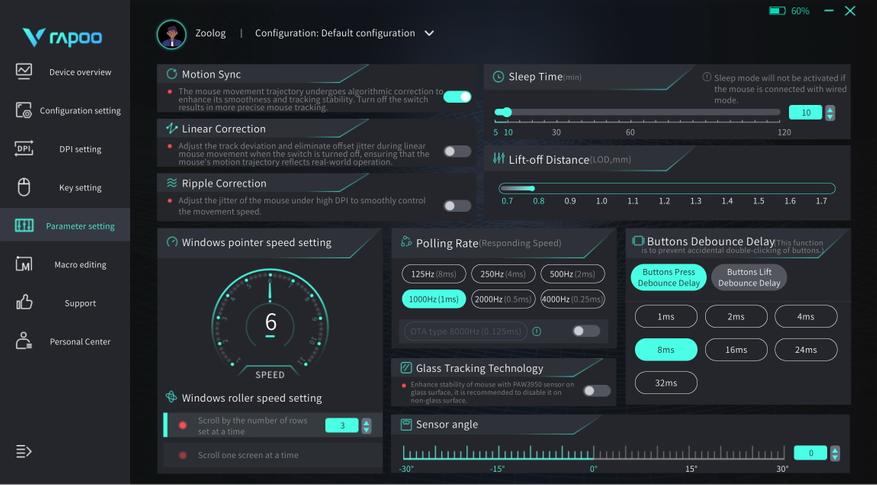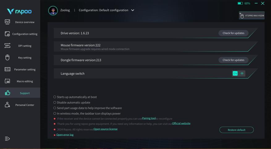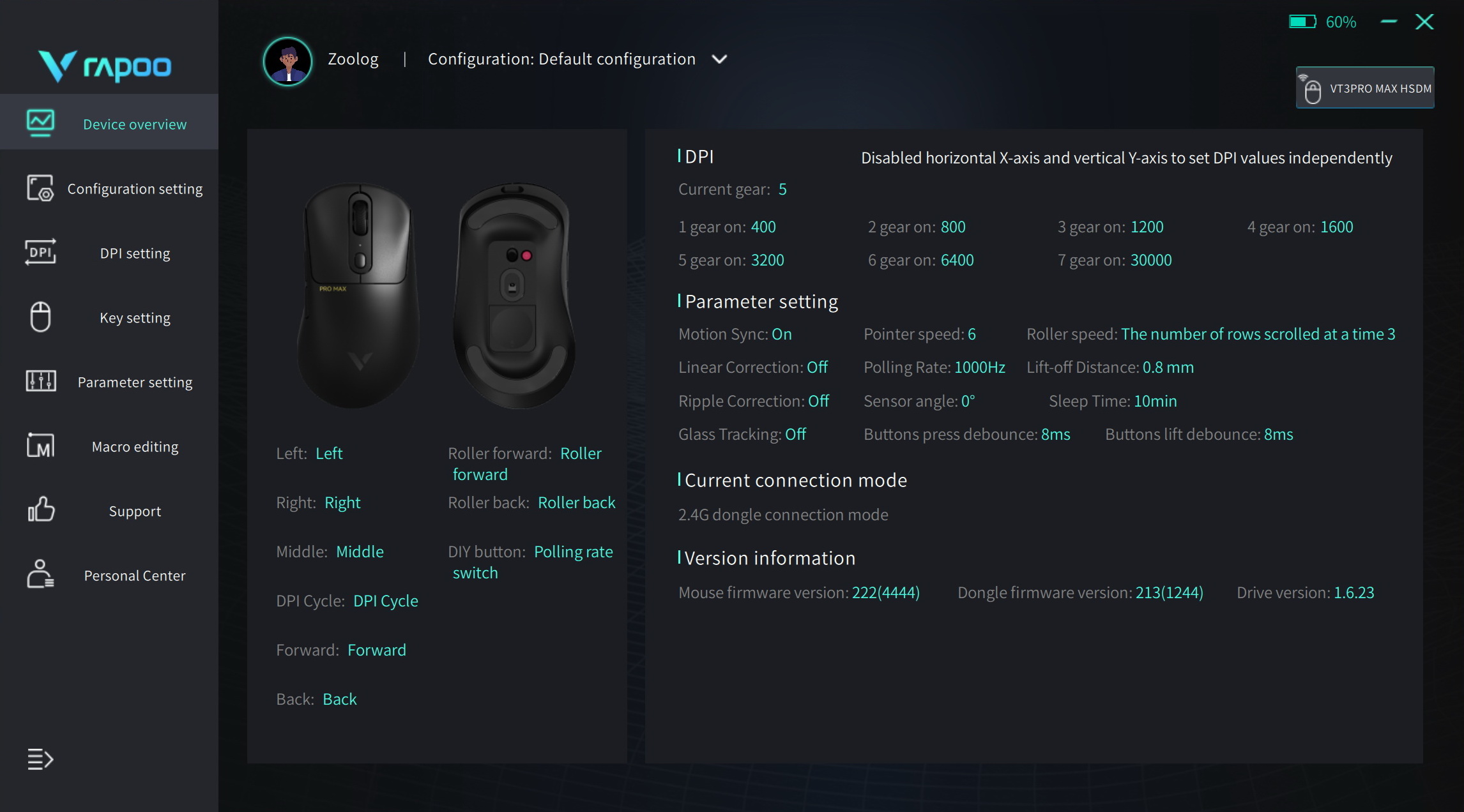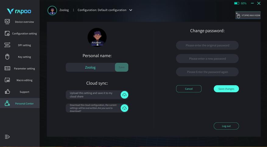 Ну и в конце, мы можем узнать данные о версии ПО и о профиле пользователя. Как я уже говорил выше, все настройки сохраняются в памяти мыши и (после регистрации) в облаке.