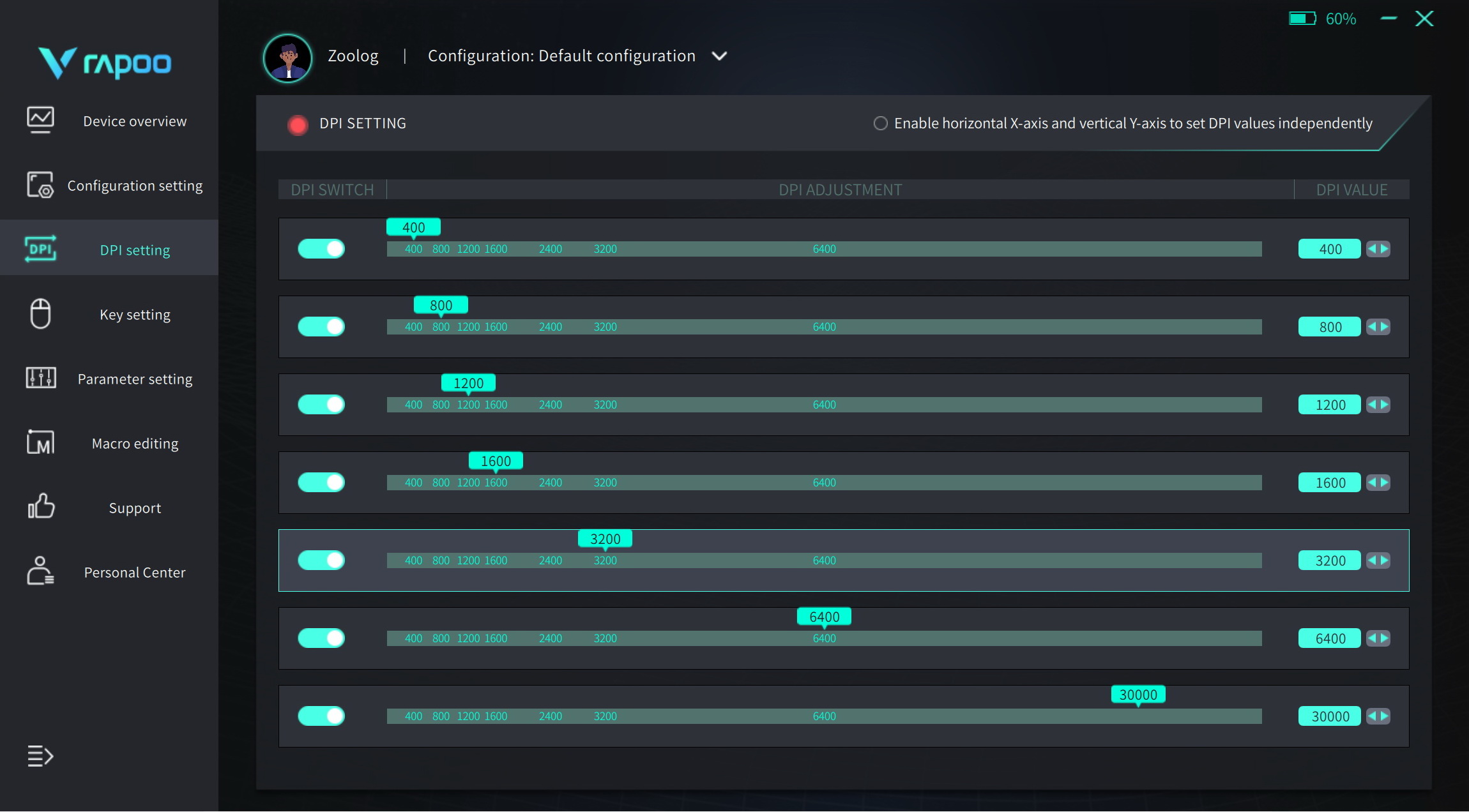 Доступно 7 ступеней переключения DPI. Значения для каждой из них настраиваются в произвольном порядке. Возможно, настроить разные DPI для X-оси и Y-оси.