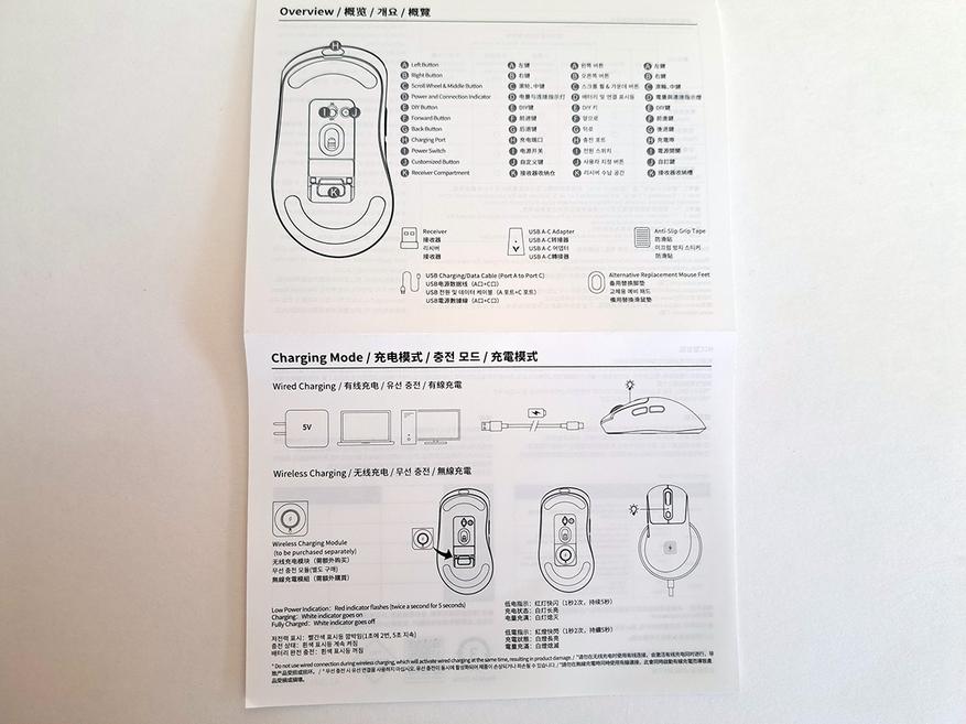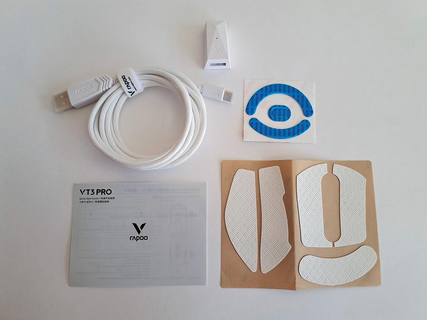 Комплект у мышки довольно богатый: руководство пользователя, кабель USB Type C, переходник с USB Type С на USB Type A, запасные тефлоновые накладки, так называемые глайды, а также противоскользящие наклейки для спинки мыши, так называемые грипсы.