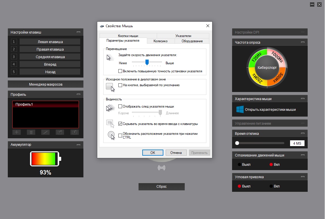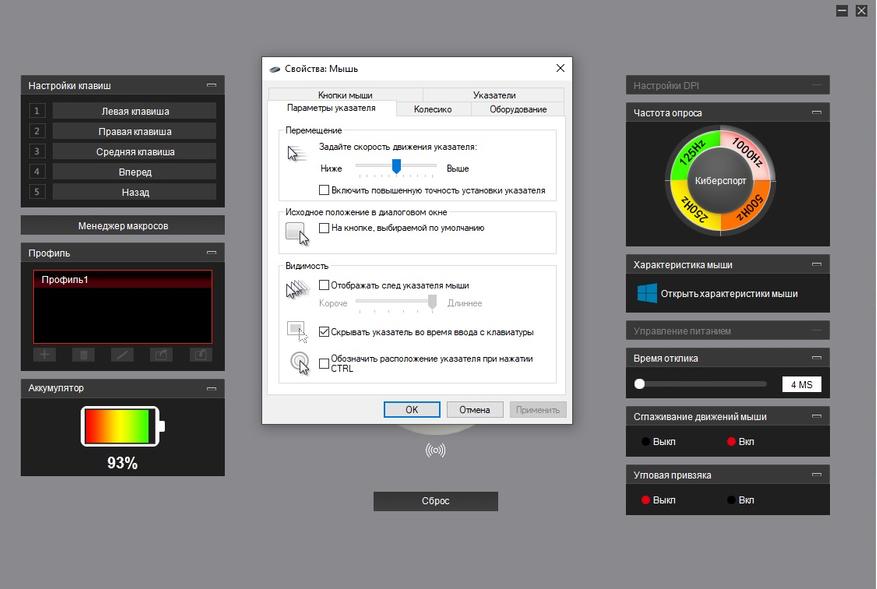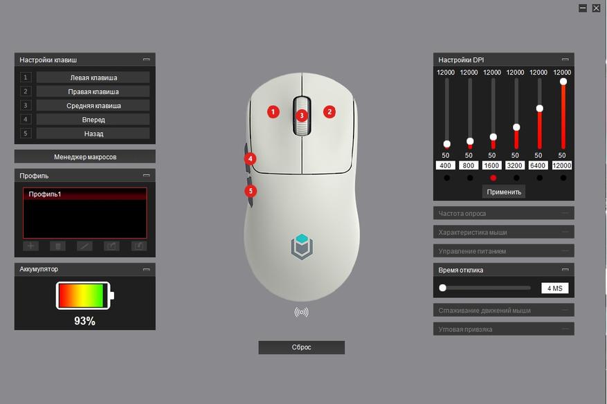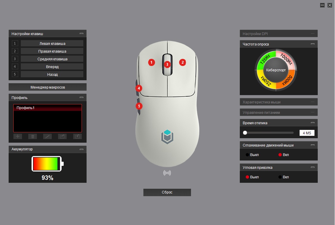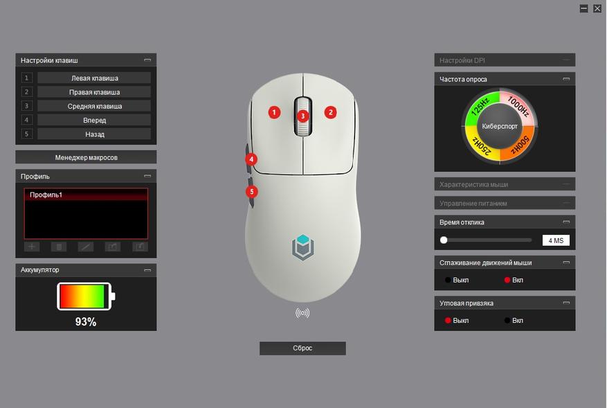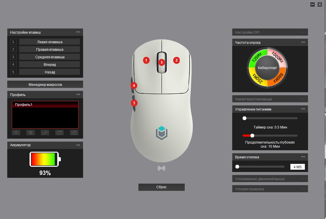 Мышка хоть и бюджетная, но также обладает программным обеспечением, которое без проблем можно скачать и установить на компьютер или ноутбук. ПО имеет всего одну страницу с настройками, но на самом деле, на этой странице есть все необходимое, а именно: имеется контроль за остаточным зарядом аккумулятора, имеется настройка таймера, а также мы можем включить угловую привязку, выставить время отклика, параметр DPI и частоты опроса. Всего доступно 4 предустановленных режима работы — 125 Гц — энергосбережение, 250 Гц — офисное использование, 500 Гц — игровой режим, 1000 Гц — киберспорт. Также в программном обеспечении мы можем переназначить все кнопки на выполнение нужной команды.