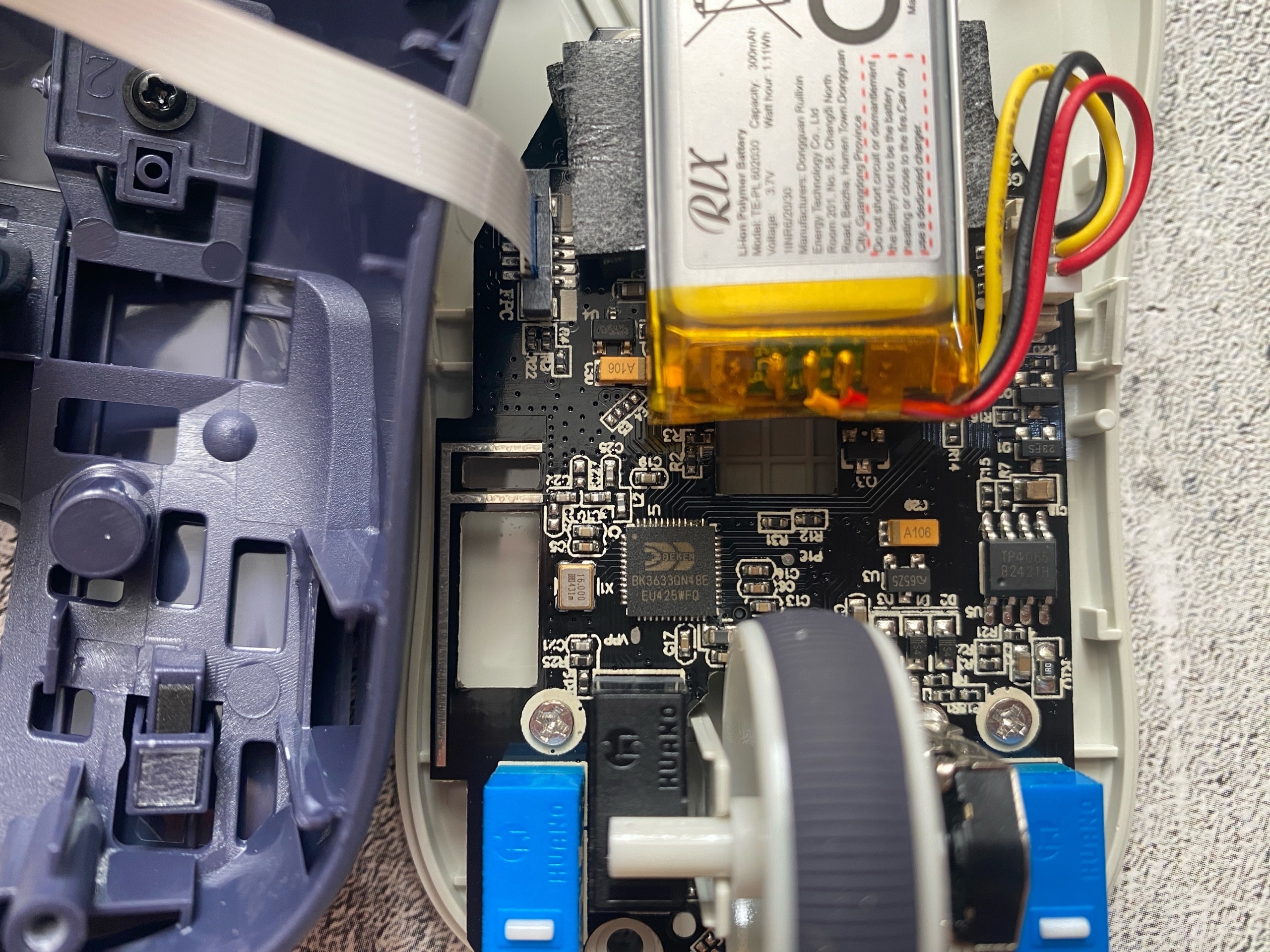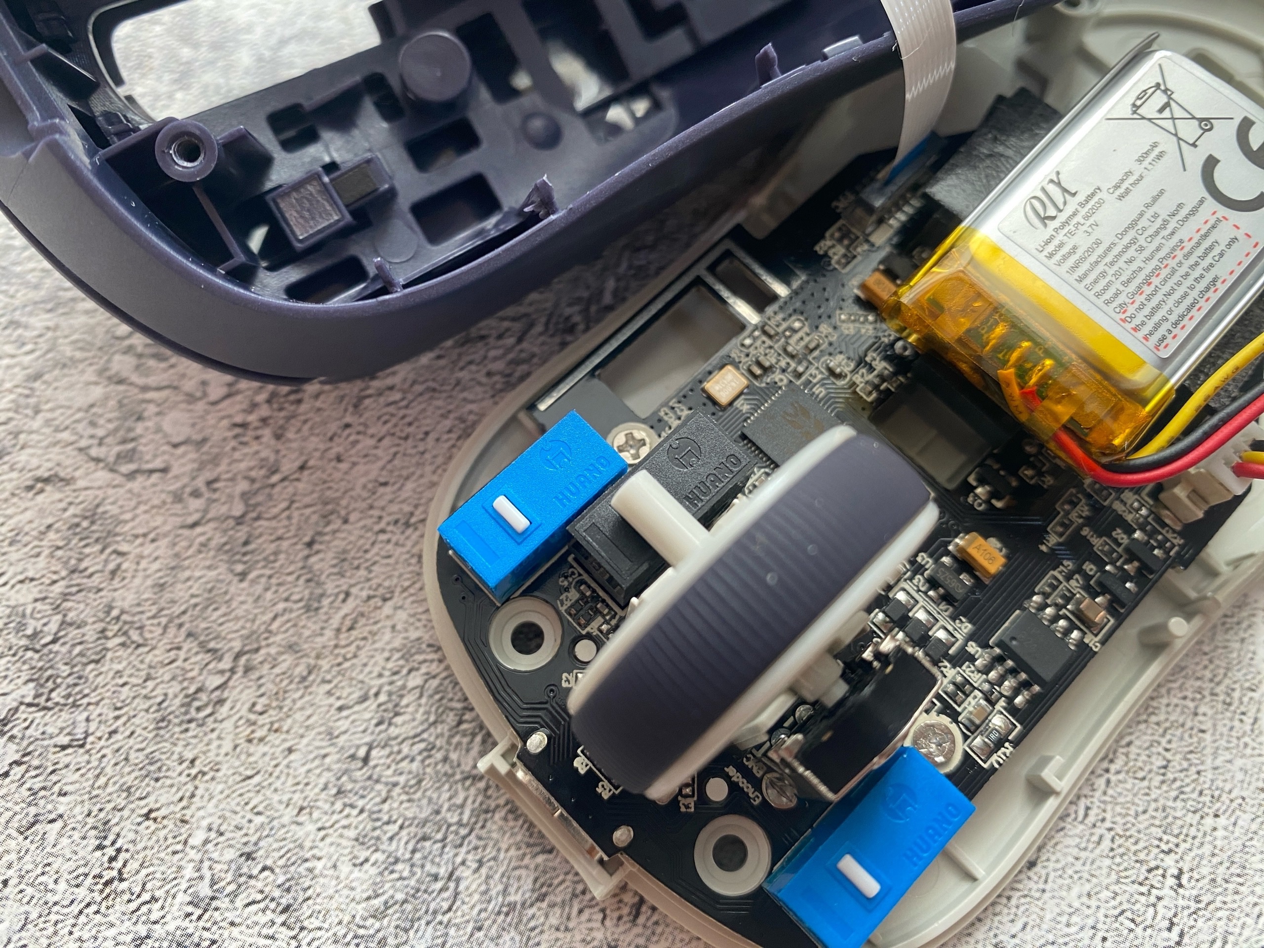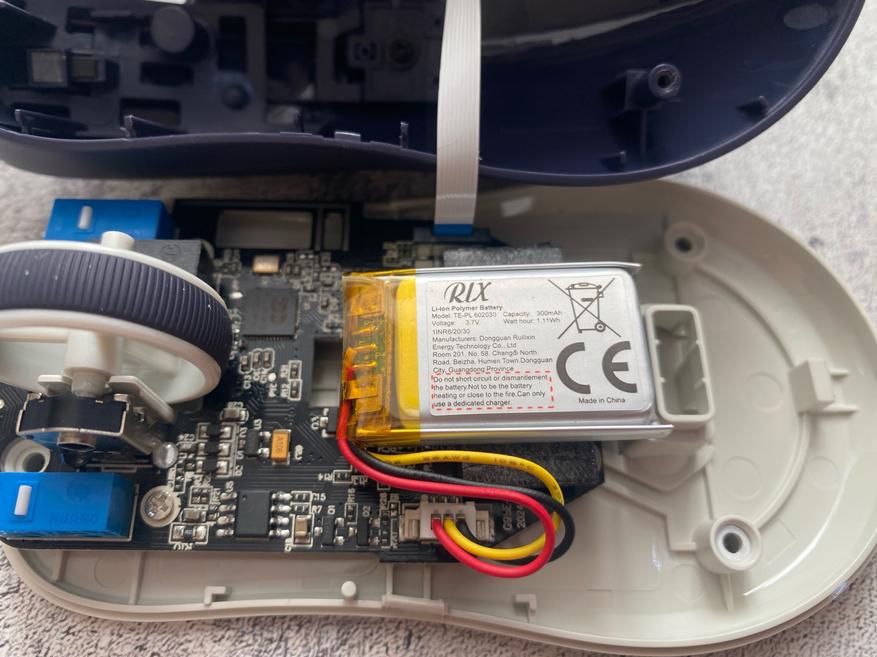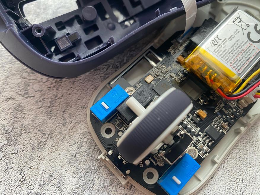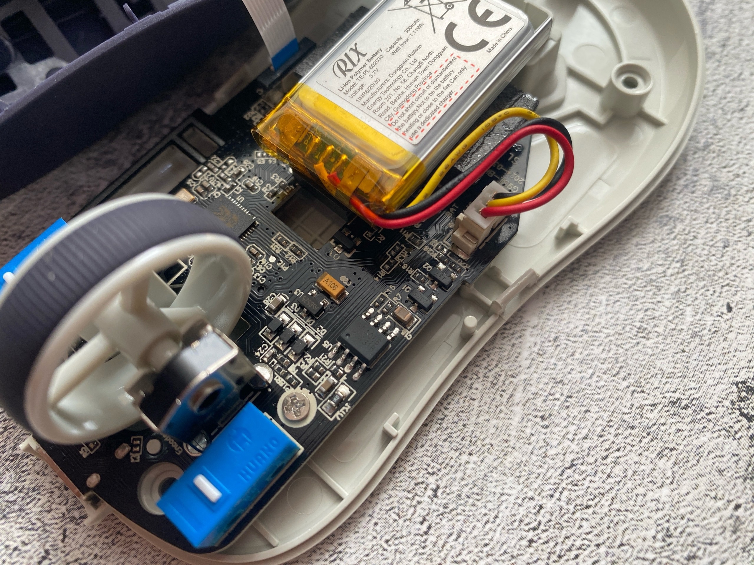 После разборки сразу бросается в глаза аккумулятор на 300 mAч, которого по заверению производителя, должно хватать на 50 часов непрерывной работы, но при условии выставленной частоте опроса 125 Гц. Но, а при частоте опроса 1000 Гц мышка сможет проработать до 5 дней, чего может показаться мало, но если поставить мышку на зарядку, то до 100 % аккумулятор заряжается всего за 1 час. И самое главное, что во время зарядки мышкой можно пользоваться и дальше, что безусловно можно отнести к плюсам.