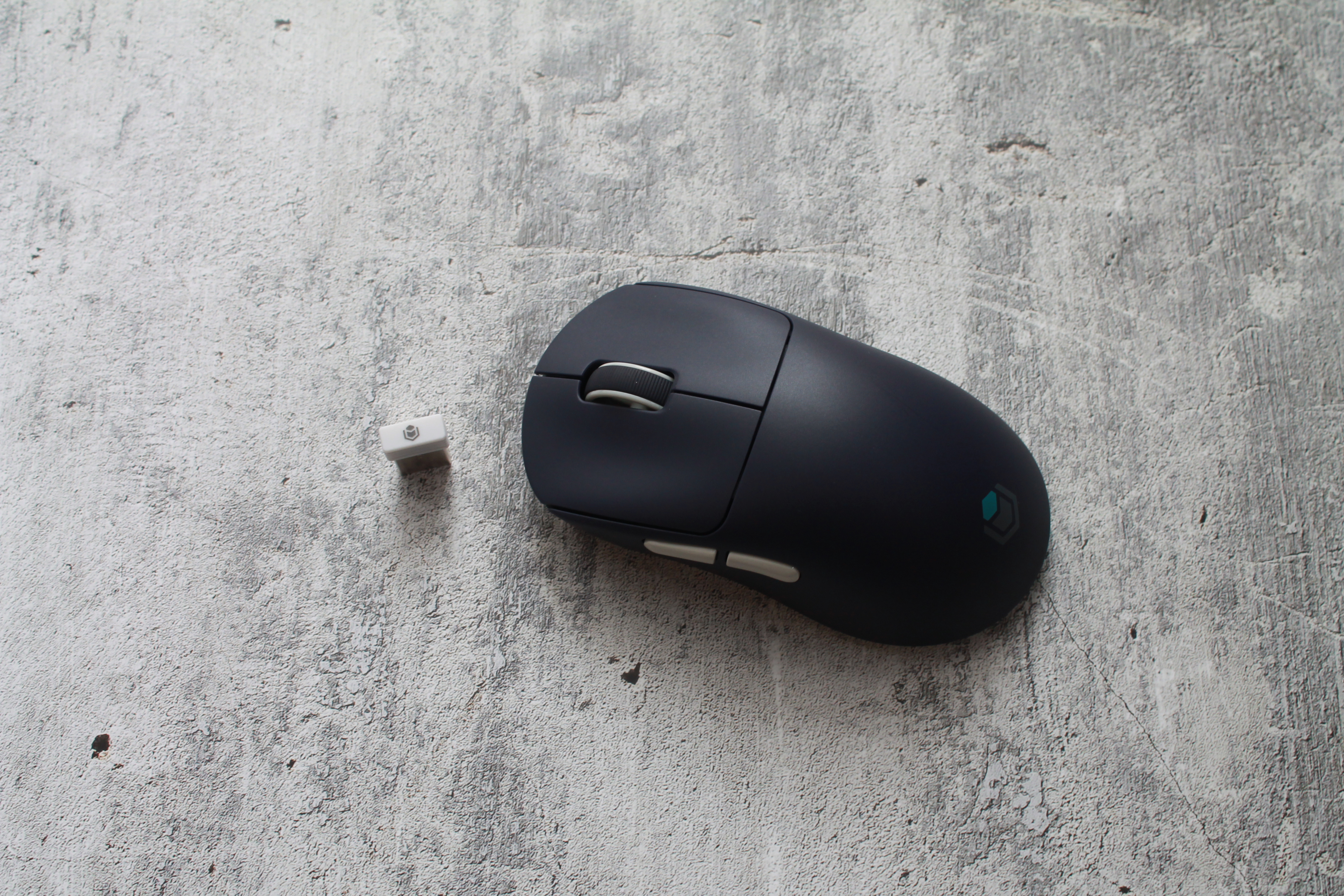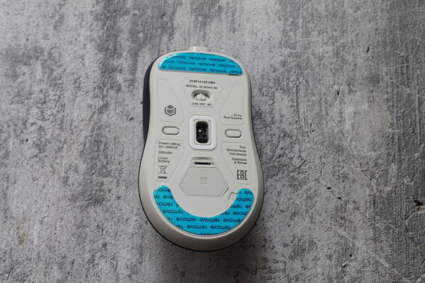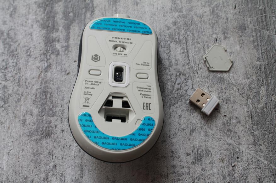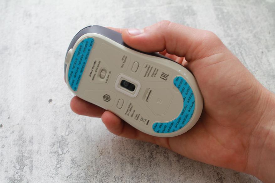 Если развернуть мышку и посмотреть на оборотную часть, то здесь мы увидим два больших глайда на передней и задней части, которые способствуют гладкому перемещению мышки по любой поверхности. По центру расположен сенсор PixArt PAW3311, по правую и левую сторону от сенсора имеется кнопка для переключения DPI и кнопка для сопряжения. На верхней части расположился переключатель режимов. Под сенсором имеется пластиковая крышка под которой имеется ниша для хранения беспроводного адаптера. Сразу скажу, что крышка открывается с некоторым усилием и я думаю, что постоянное открытие не пойдет ей на пользу.