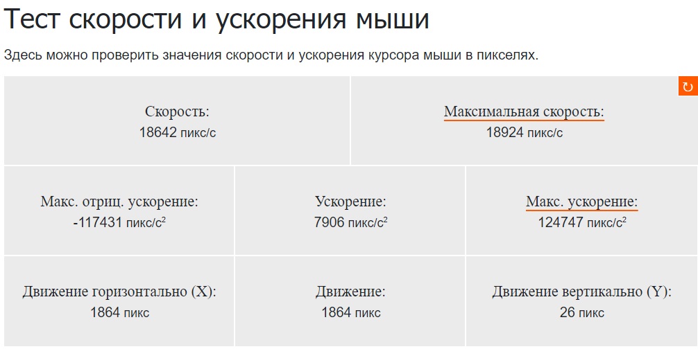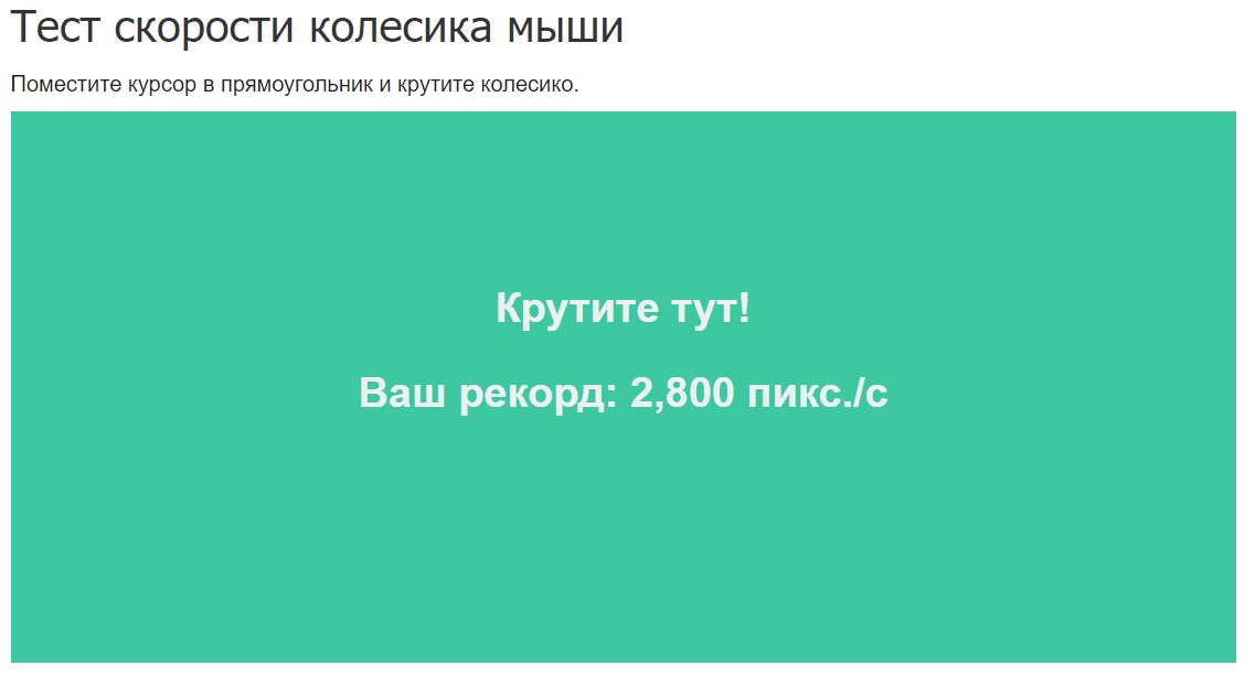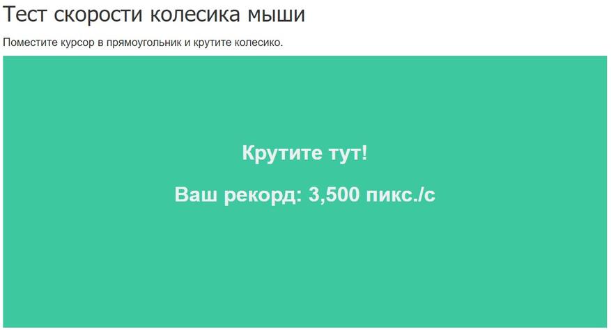 При тестировании колесико мыши получаем следующие результаты. Колесико от себя 3.500 пикс/с, колесико на себя 2.800 пикс/с.