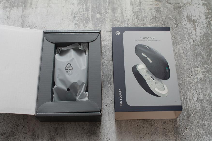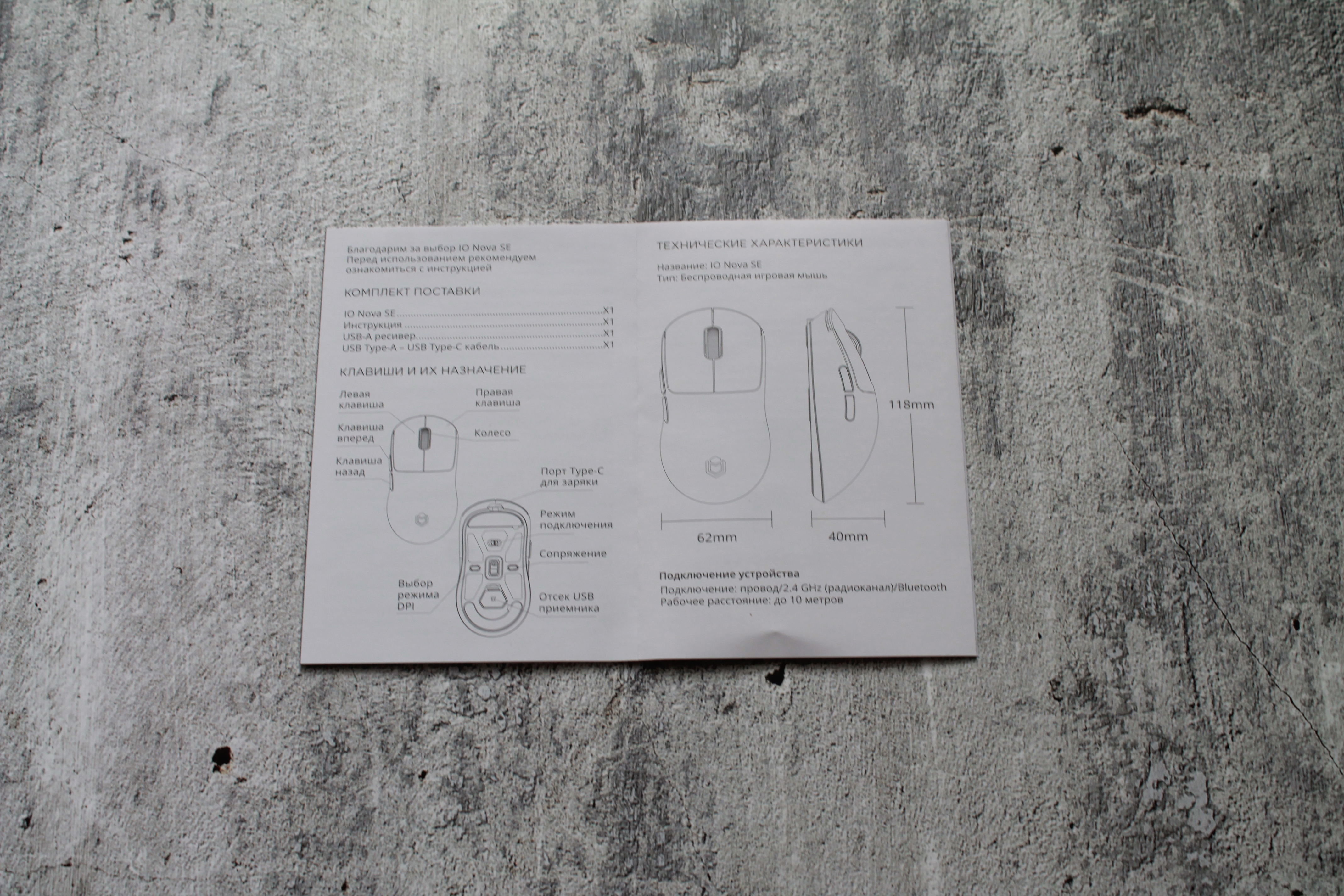 Поставляется игровая мышь IO Nova SE в весьма солидной, для данной стоимости, упаковке. Хоть компания и направляет все средства на создание хорошей и недорогой продукции, но на упаковке они точно не экономили. На лицевой части коробки имеется цветное изображение мыши, в том цвете, в котором и была приобретена. Данная модель имеет два цвета, светло-серый и темно-серый. На оборотной части коробки имеются технические характеристики данной модели. В комплектацию входит, только самое необходимое, а именно мышь IO Nova SE, руководство по использованию, беспроводной адаптер, кабель USB-C. Также хочу отметить, что компания планирует выпустить набор с аксессуарами, в который войдут: тефлоновые накладки, стикер IO, стеклянные накладки, грипсы для создания индивидуального дизайна.