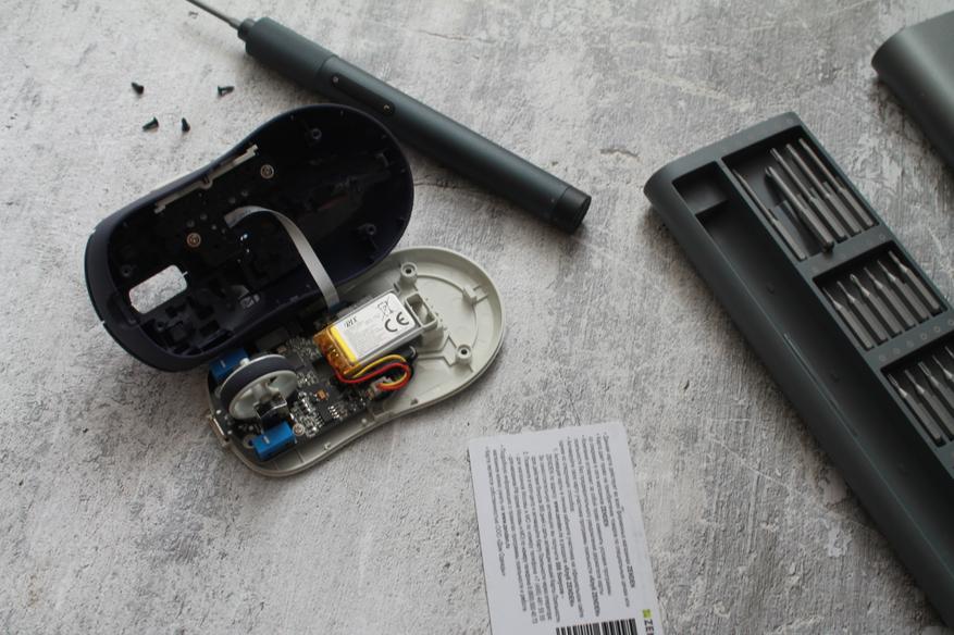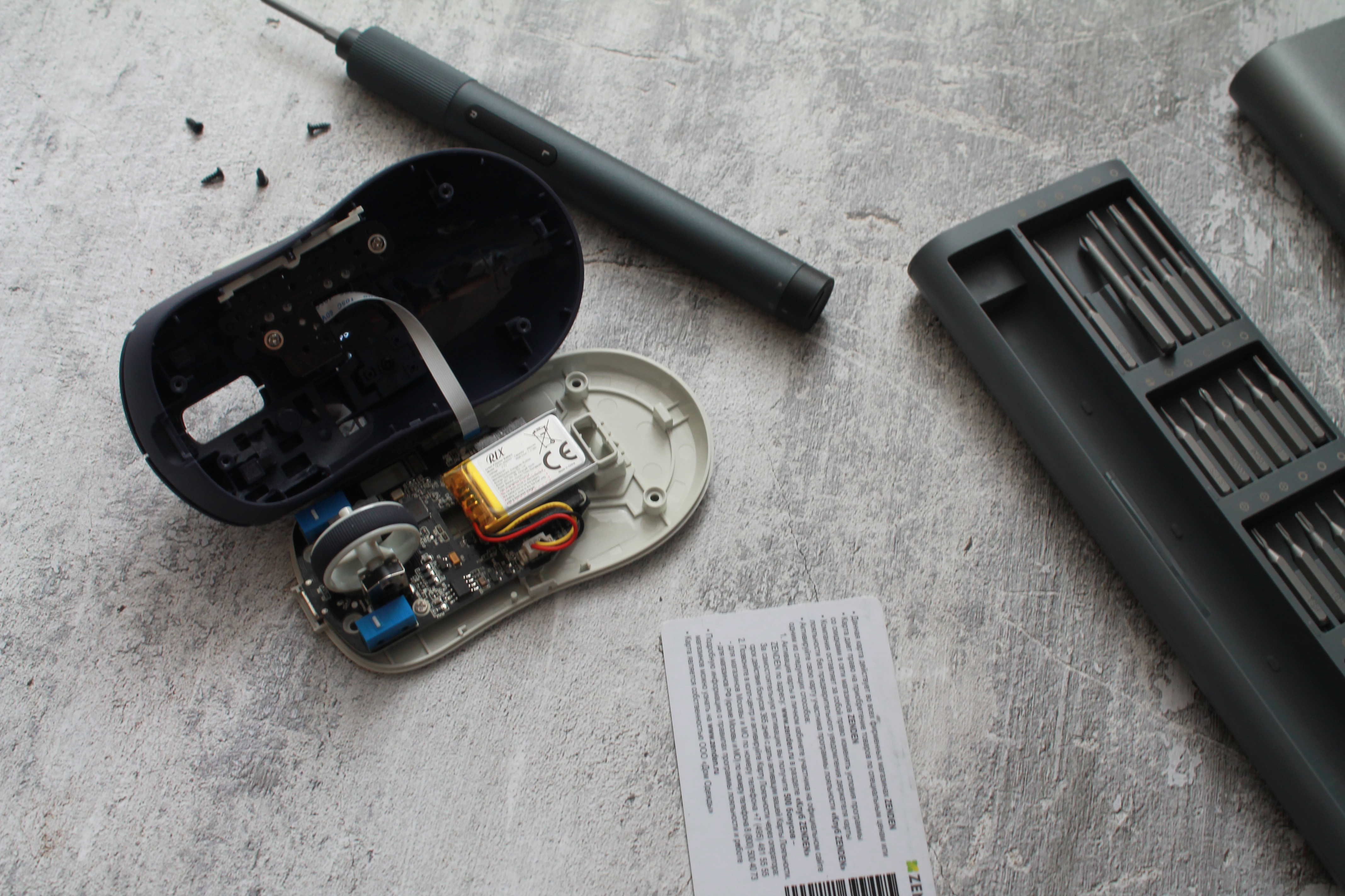 Для полного разбора мыши нам понадобится отклеить два глайда, открутить четыре винта и аккуратно отщелкнуть фиксаторы.