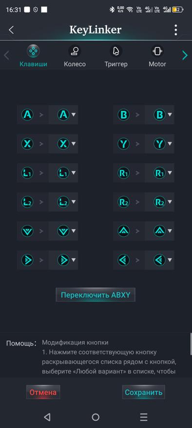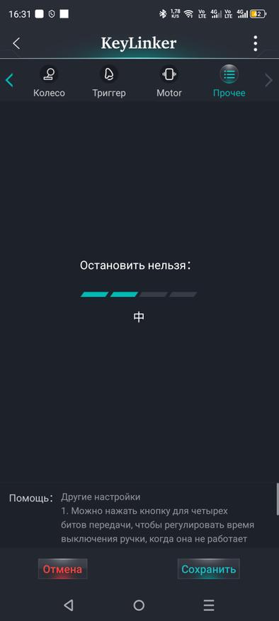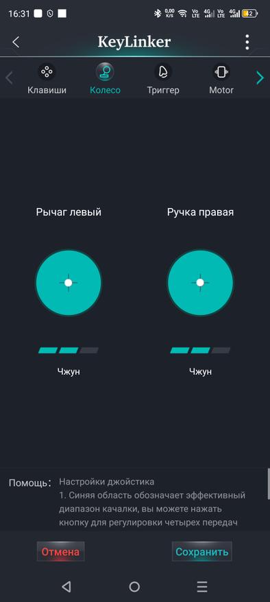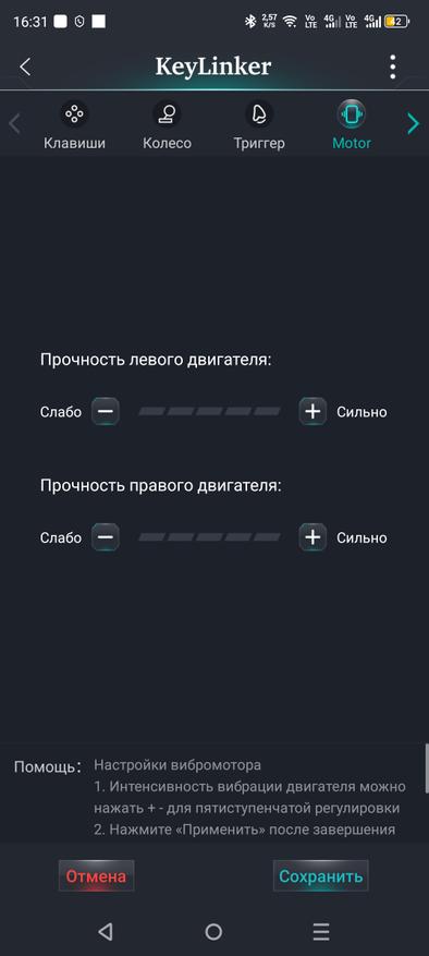 В этом приложении можно настроить чувствительность и отрегулировать мертвые зоны. Можно поменять кнопки местами. Также изменяется интенсивность вибромоторов, всего 5 уровней, и можно изменять для каждого двигателя по отдельности.
