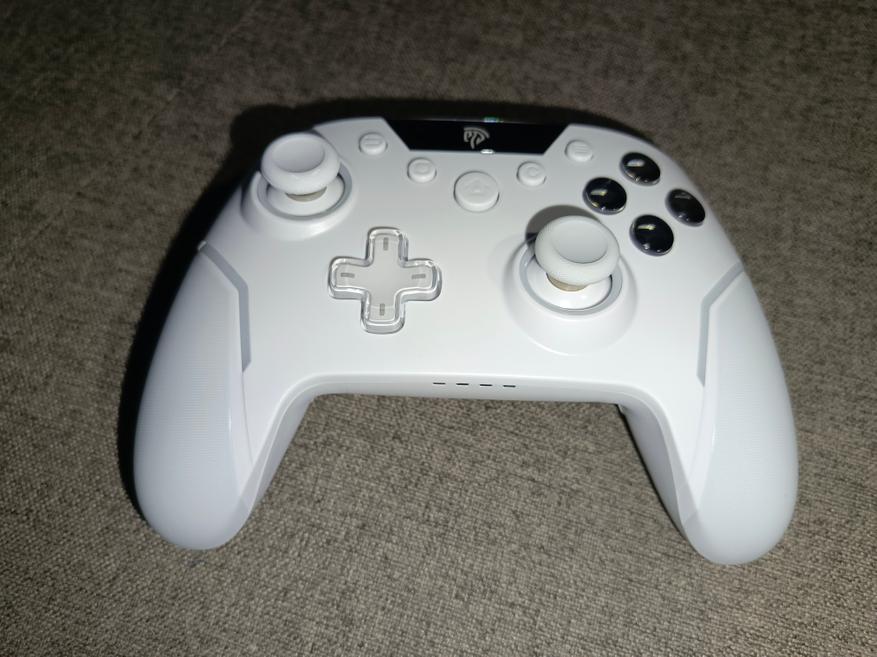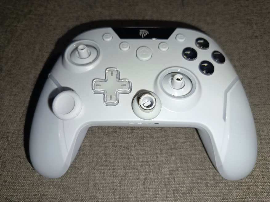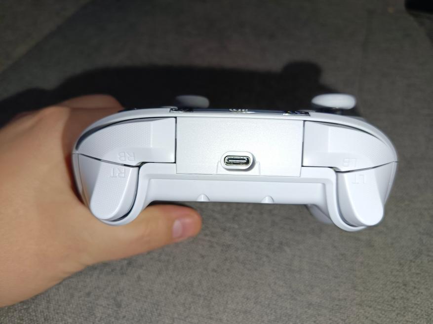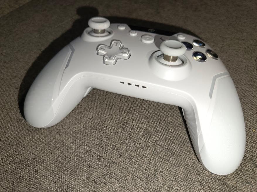 Главная особенность этого геймпада заключается в нижней части корпуса. Четыре лепестка, которые можно запрограммировать в одно мгновенье. Удерживайте кнопку «С» и тот лепесток, который хотите запрограммировать, затем нажмите ту кнопку, которую хотите продублировать, и выйдете из режима программирования тем же путем, как и вошли. Всё, кнопка продублирована. Жалко, нельзя сохранять разные профили под разные игры, как это есть в 8BitDo Ultimate.