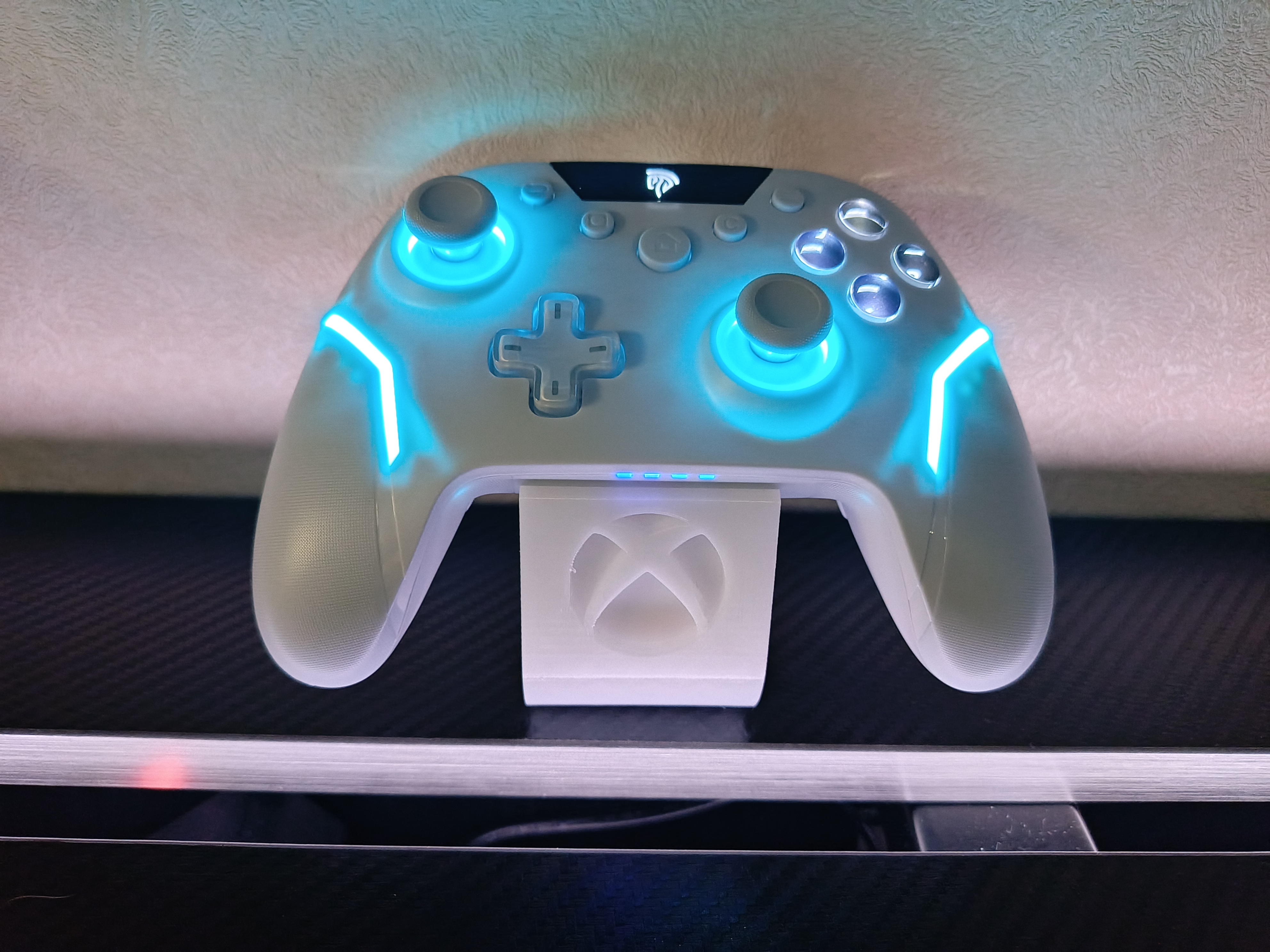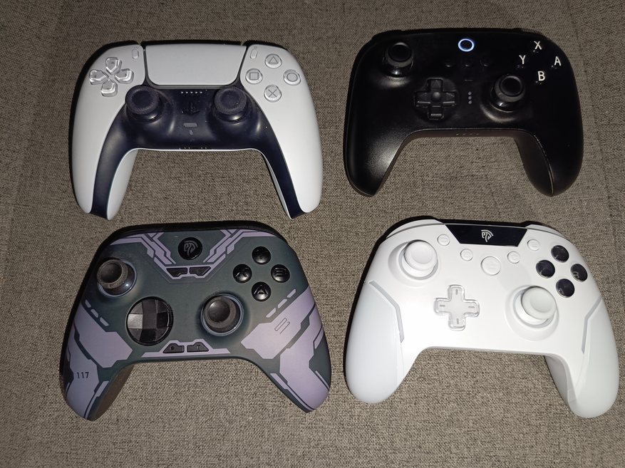 Внешне геймпад очень сильно похож на геймпад от игровой консоли Xbox. Для понимания визуального отличия геймпада от игровой консоли PlayStation я положил геймпад от PS5. Стики сделаны по диагонали в Xbox, а у PS сделаны по нижнему ряду.