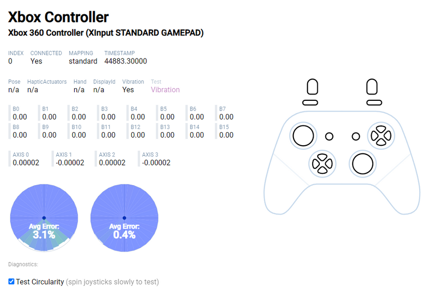 Мертвой зоны практически не наблюдаются. Разница между стиками почему-то разная. Зачастую значения одинаковые, а здесь получилось на левом 3,1%, а на правом 0,4%. В целом это неважно, так как эти значения минимальные и являются отличным показателем.