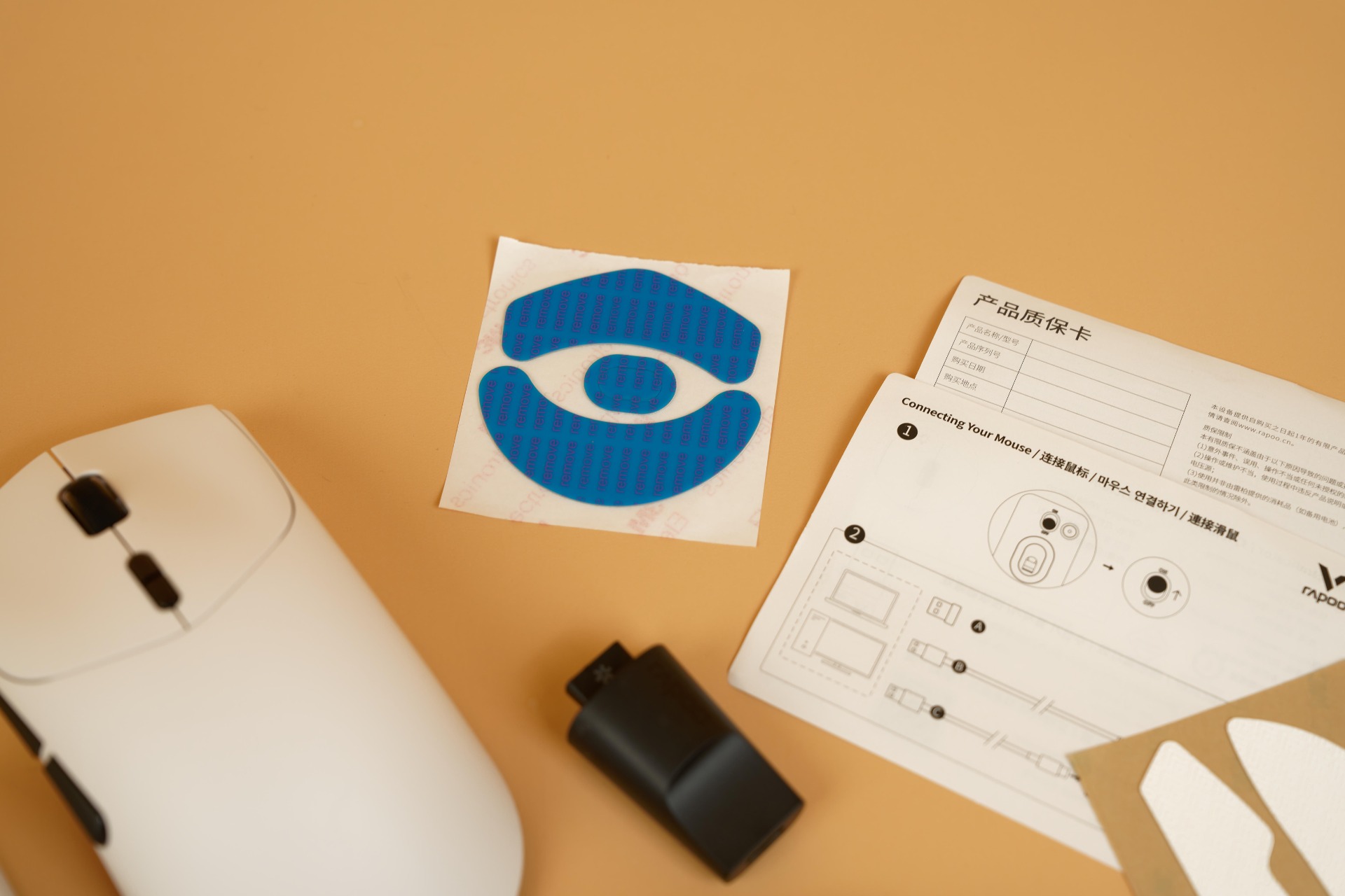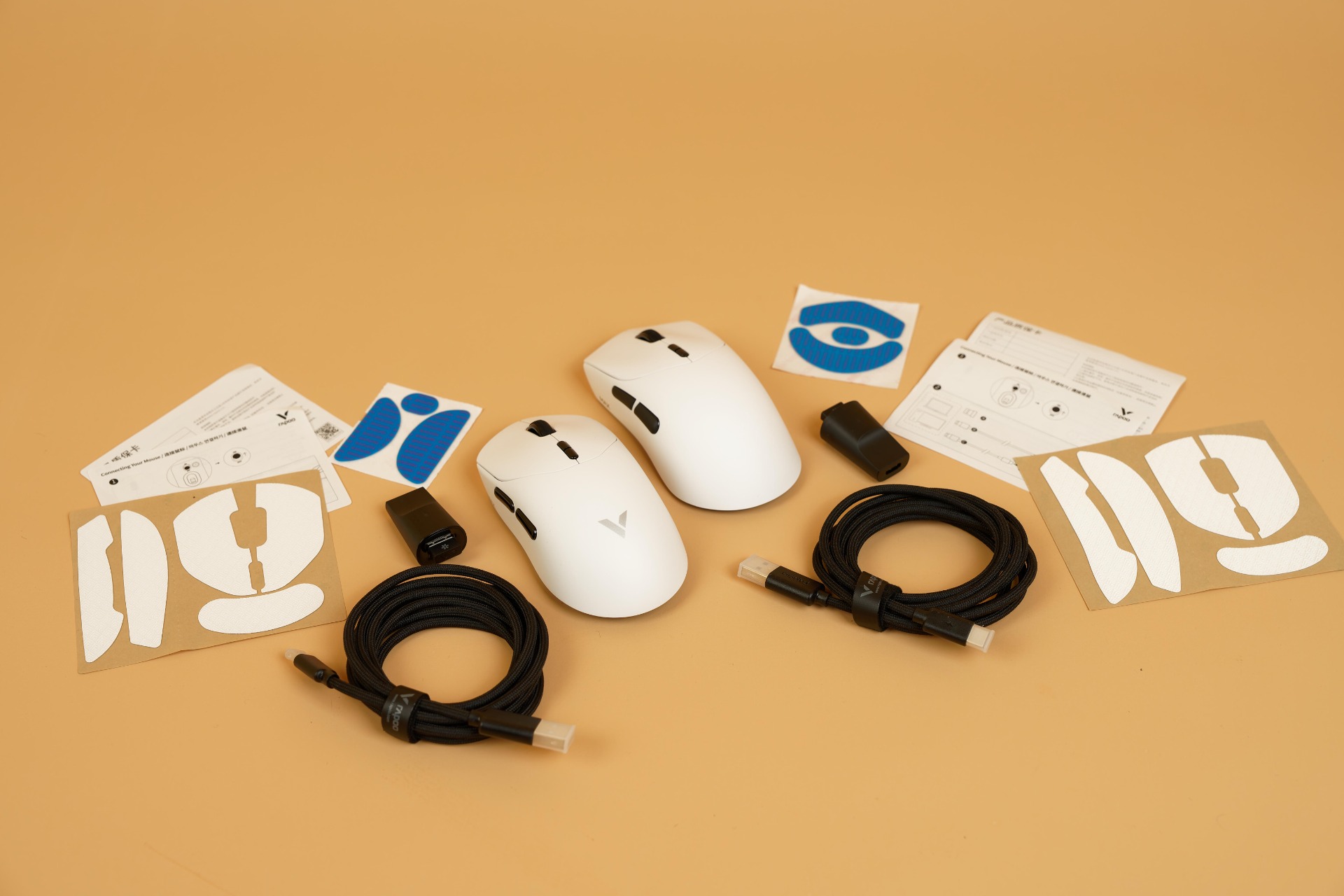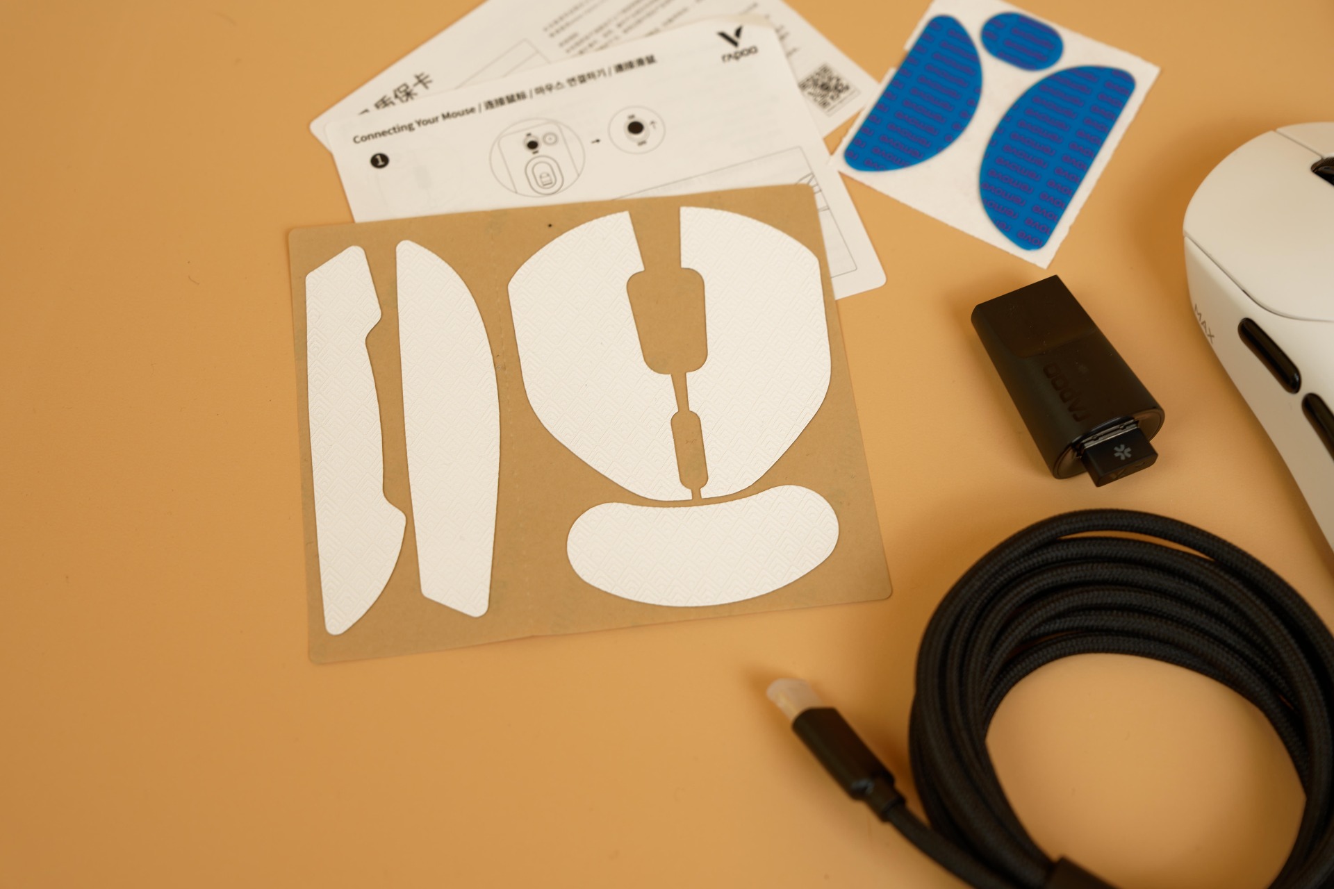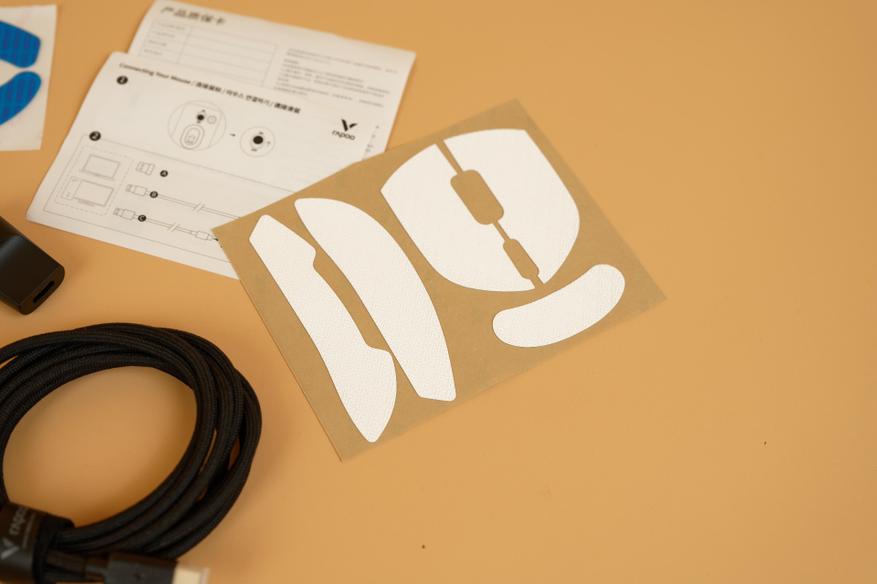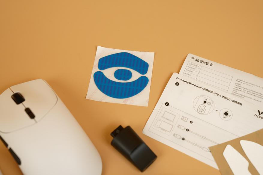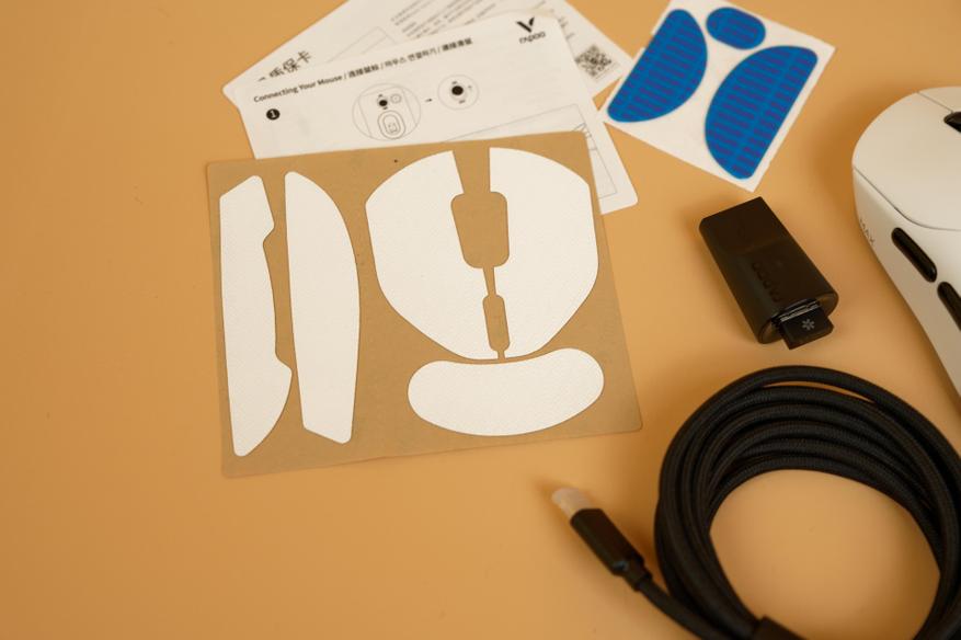 Комплектация данных мышек Rapoo хоть и не изобилует всевозможными аксессуарами, но зато включает всё необходимое для начала использования. В коробке вместе с устройством находятся зарядный кабель, который также подходит для проводного подключения, набор сменных накладок на ножки (глайды) и дополнительные накладки (грипсы), обеспечивающие более надежный захват.