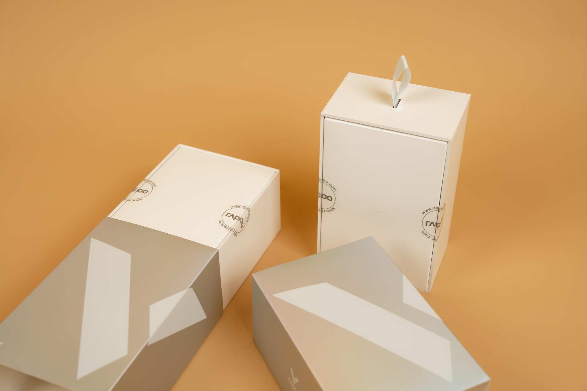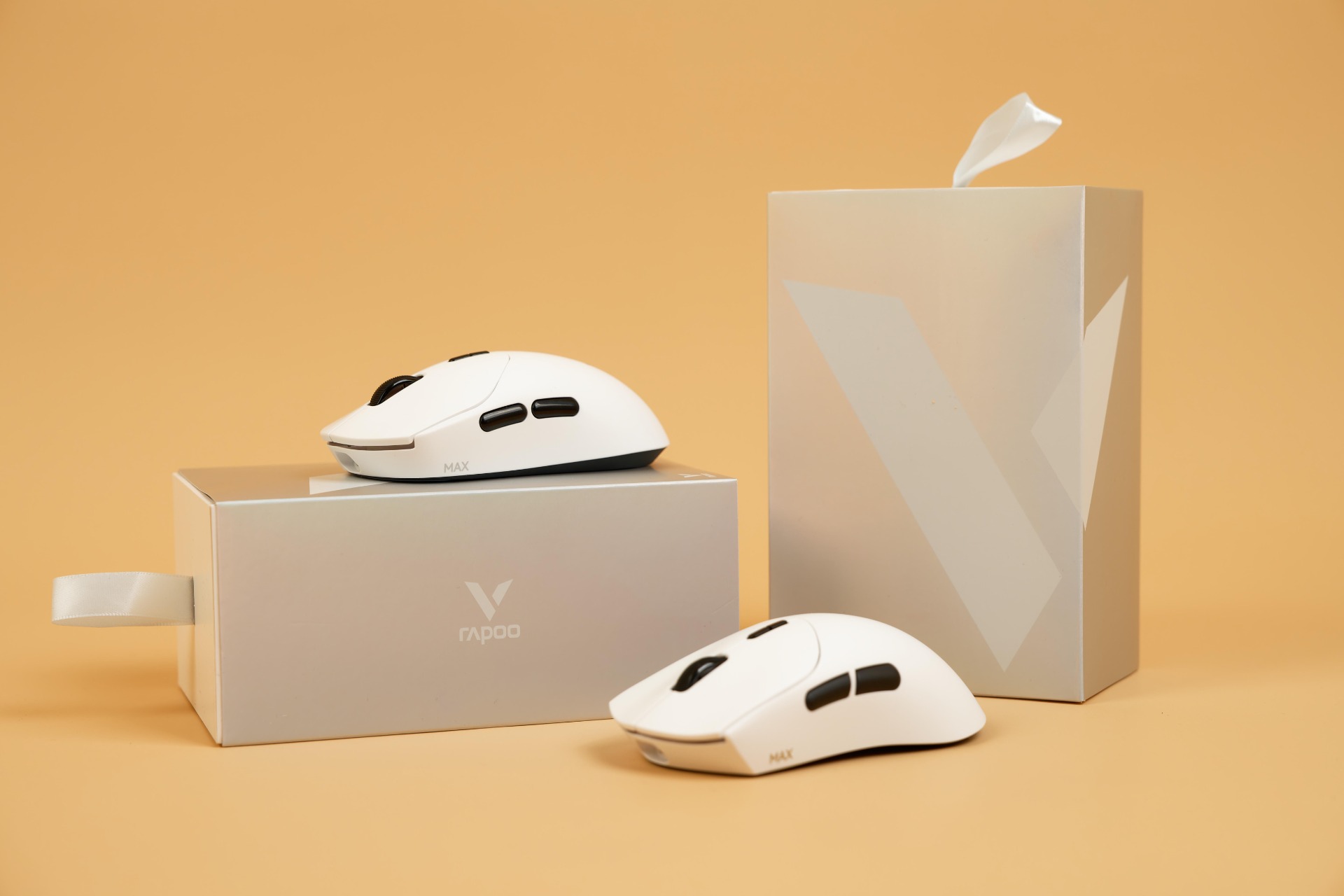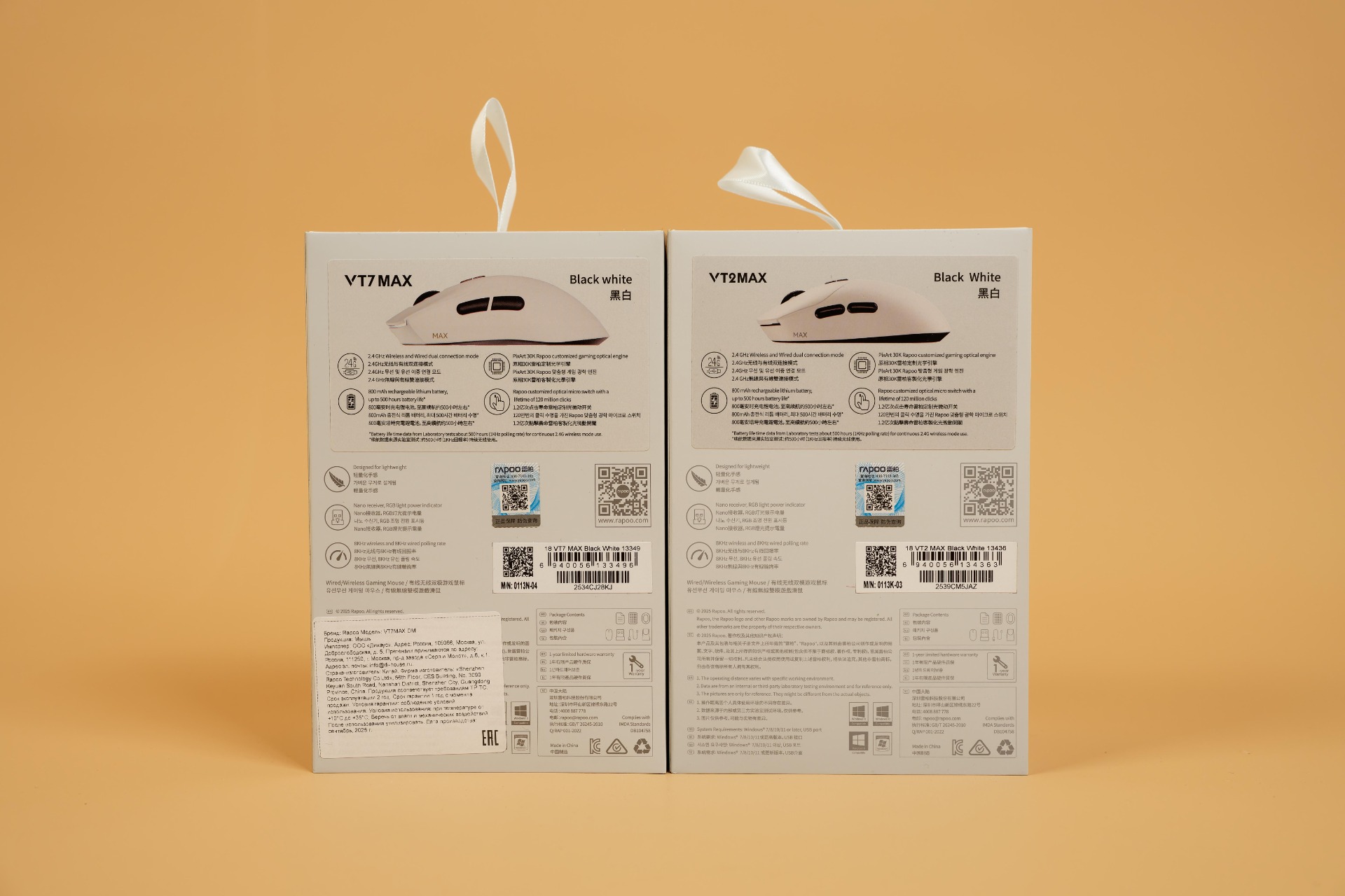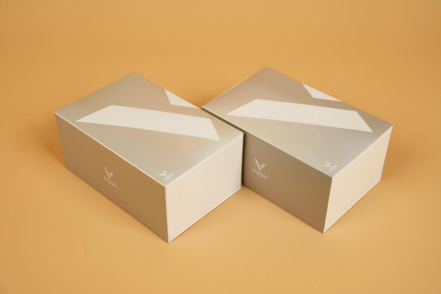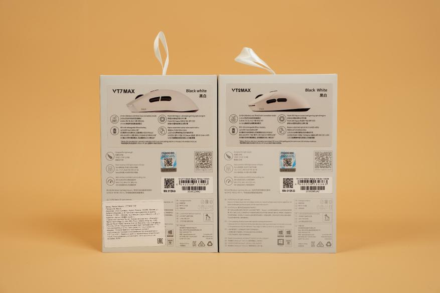 Упаковка игровых мышей Rapoo моделей VT2MAX и VT7MAX выполнена в едином стиле: она представляет собой обложку с перламутровым отливом, под которым находится внутренняя коробка из плотного белого картона. Благодаря одинаковому оформлению упаковок продукция компании легко узнаётся на полках магазинов. Для различия моделей на тыльной стороне обложки размещена наклейка с изображением мыши и списком технических характеристик. Также на упаковке присутствует QR-код, позволяющий проверить подлинность устройства.