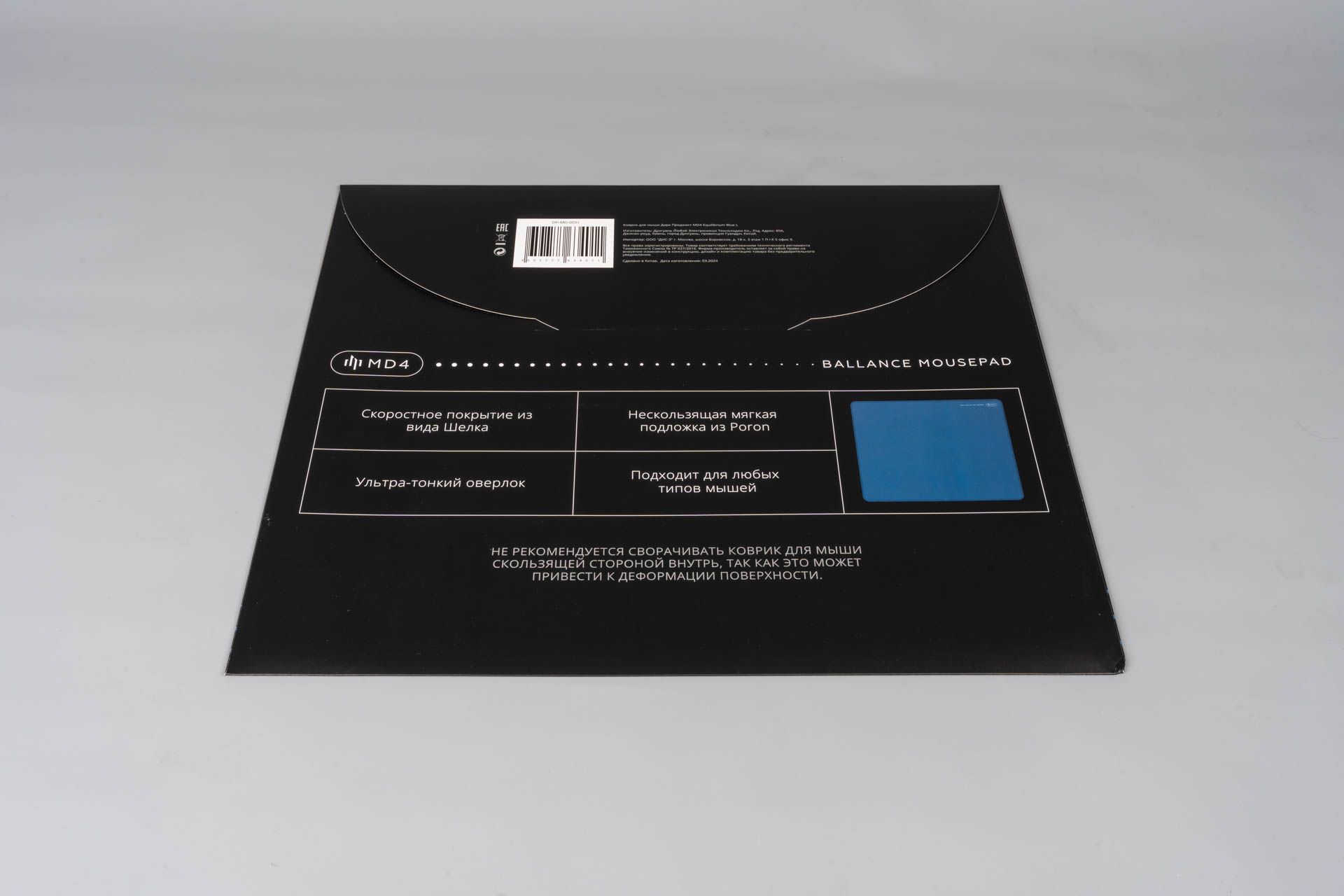 Упаковка ковриков MD4 изготовлена из прочного картона и имеет прямоугольную форму со сторонами 490 х 420 мм, напоминающую конверт. Лицевая сторона упаковки выглядит одинаково для всех моделей, тогда как на обратной стороне можно увидеть как изображение коврика, так и его технические характеристики.