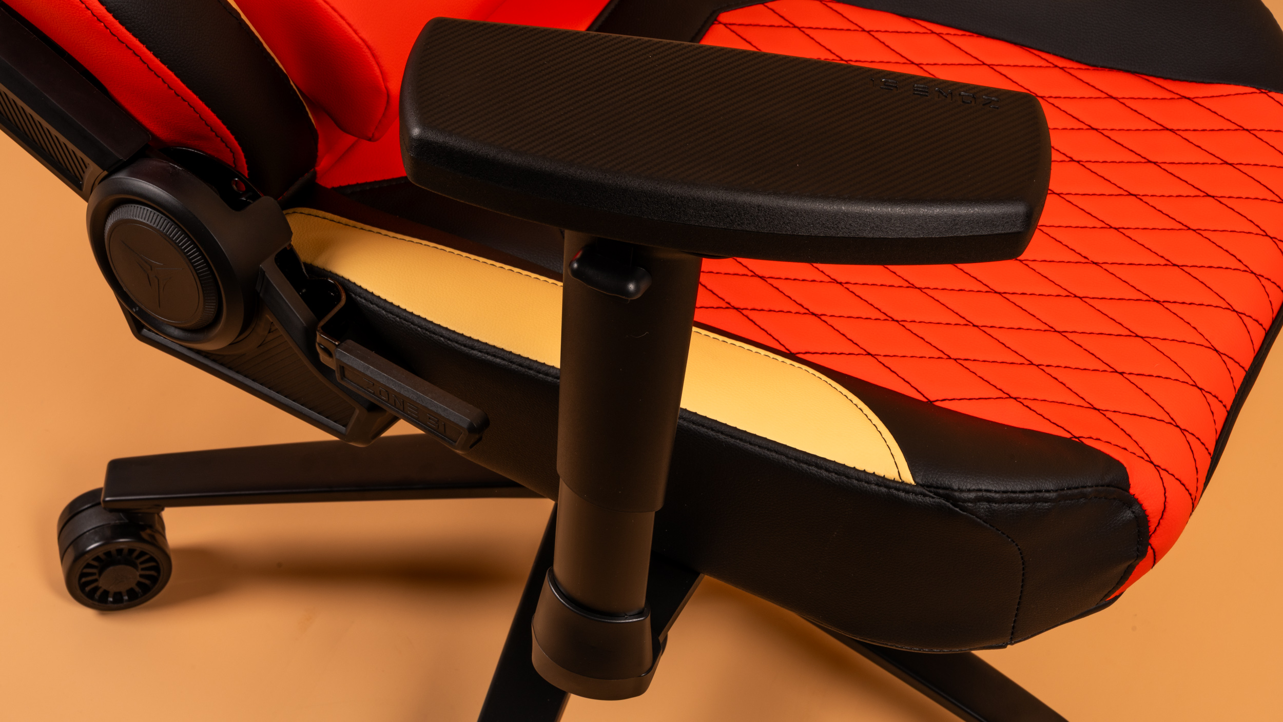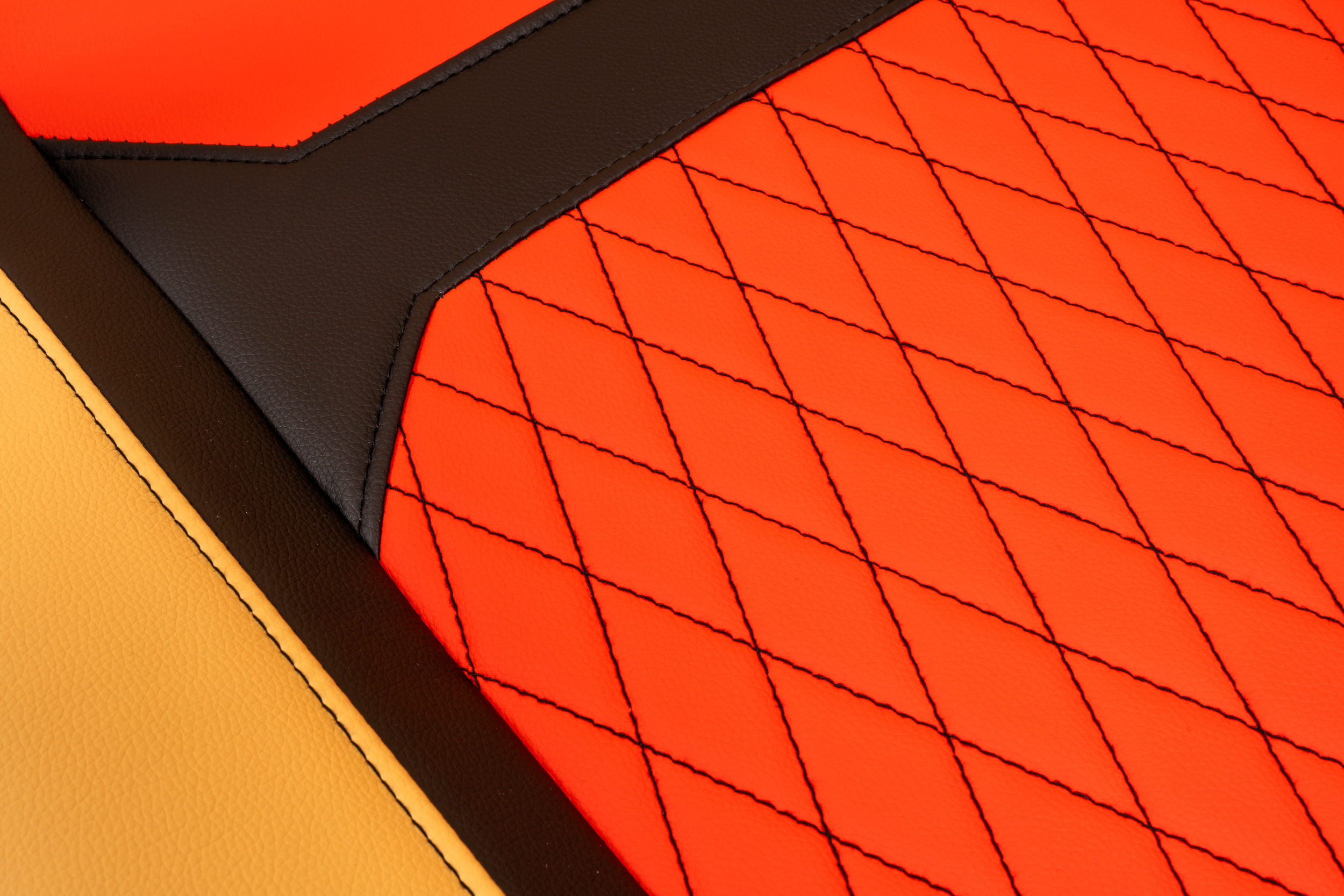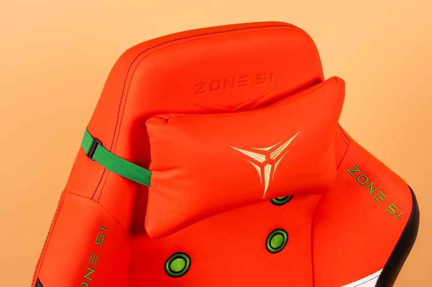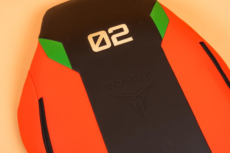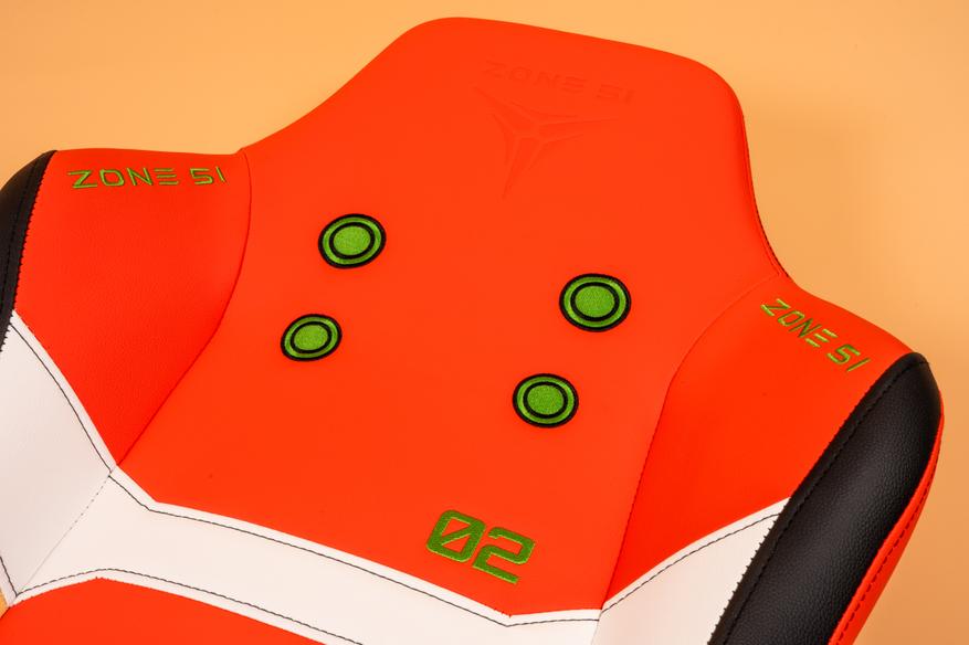 Как и говорилось ранее, спинка и сиденье Zone 51 EVA-02 обтянуто искусственной кожей. Данный материал обладает рядом характерных особенностей. К его достоинствам относится эстетичный внешний вид, созданный за счёт комбинации деталей разного цвета и аккуратной контрастной строчки. Отличное качество пошива подчёркивается ровными швами без дефектов и торчащих ниток. Ещё одно преимущество — простой уход, для которого требуется лишь влажная салфетка. Основной недостаток проявляется в жаркую погоду: при контакте с кожей материал может вызывать эффект «прилипания» из-за повышенного потоотделения, поэтому лучше всего в жаркую погоду надевать шорты или штаны.