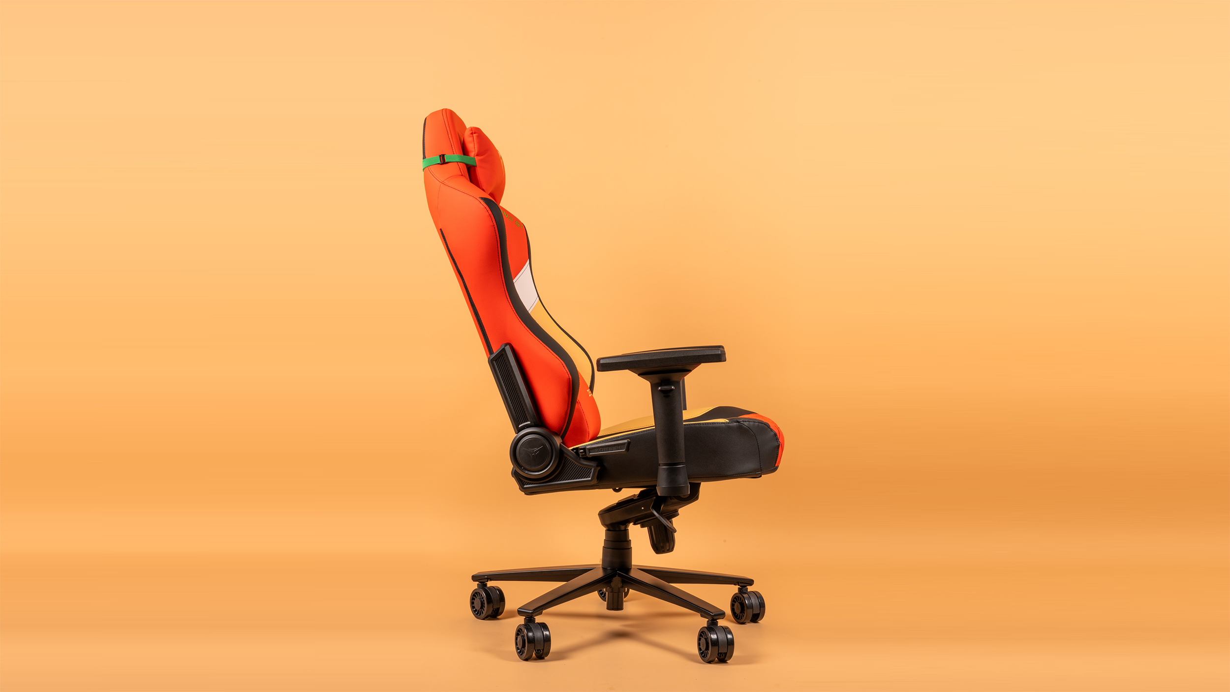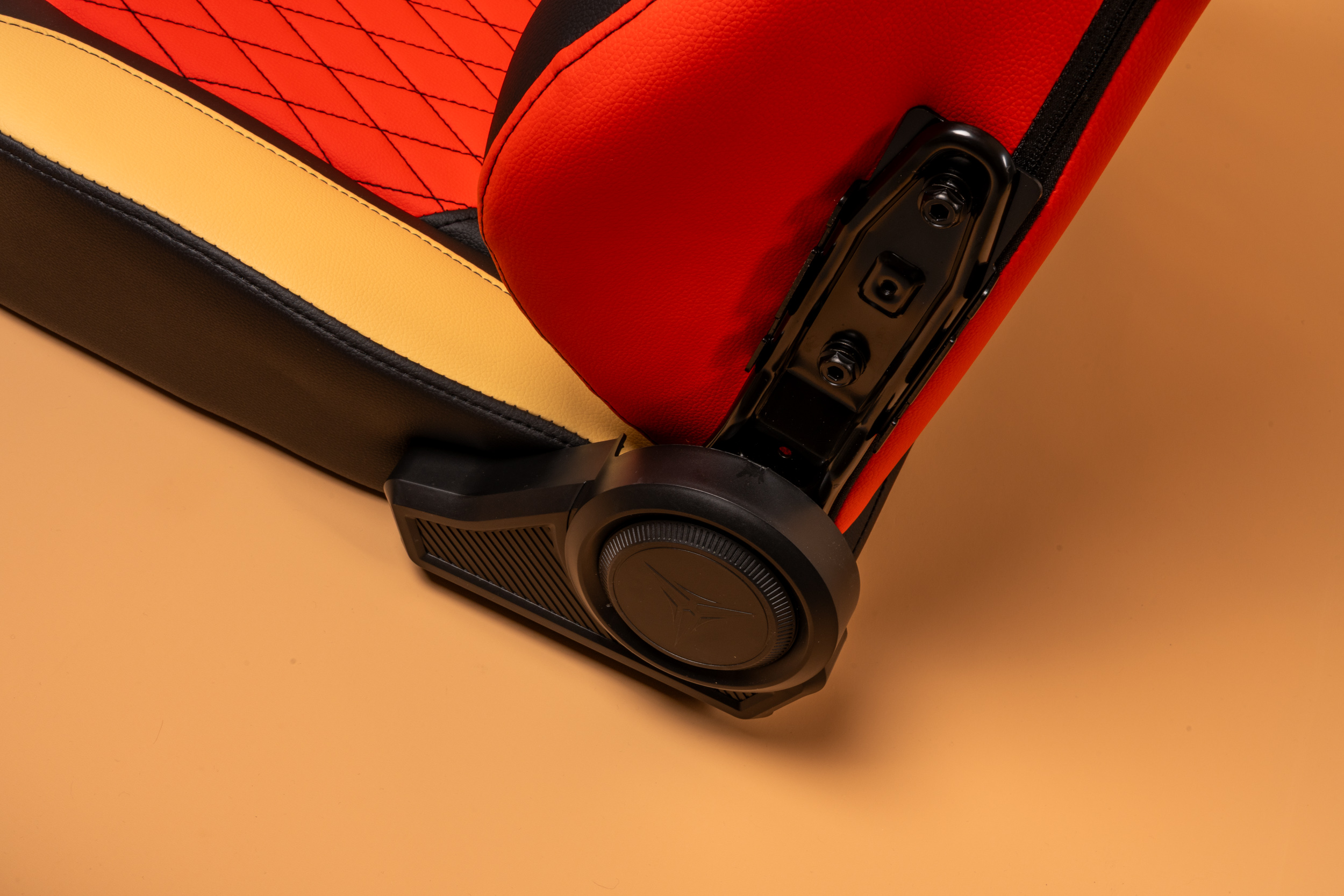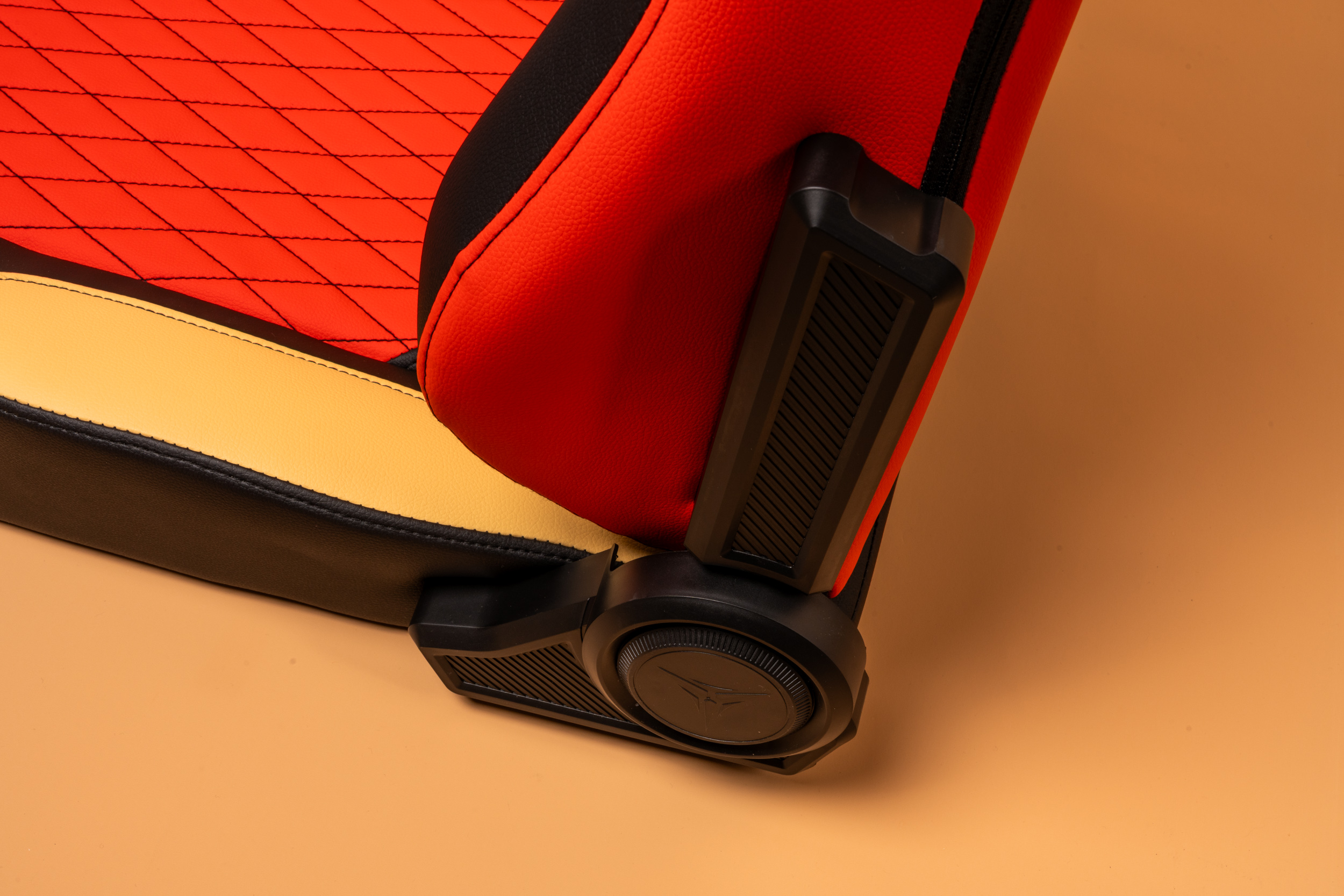 Кресло обладает ярким дизайном, вдохновленным футуристичной эстетикой аниме-сериала. Его цветовое решение построено на сочетании красного, черного и желтого цветов, отсылающих к палитре одного из культовых персонажей. Декор включает контрастную прострочку, вышитые логотипы и тематические графические элементы на спинке, создающие эффект погружения в художественную вселенную.