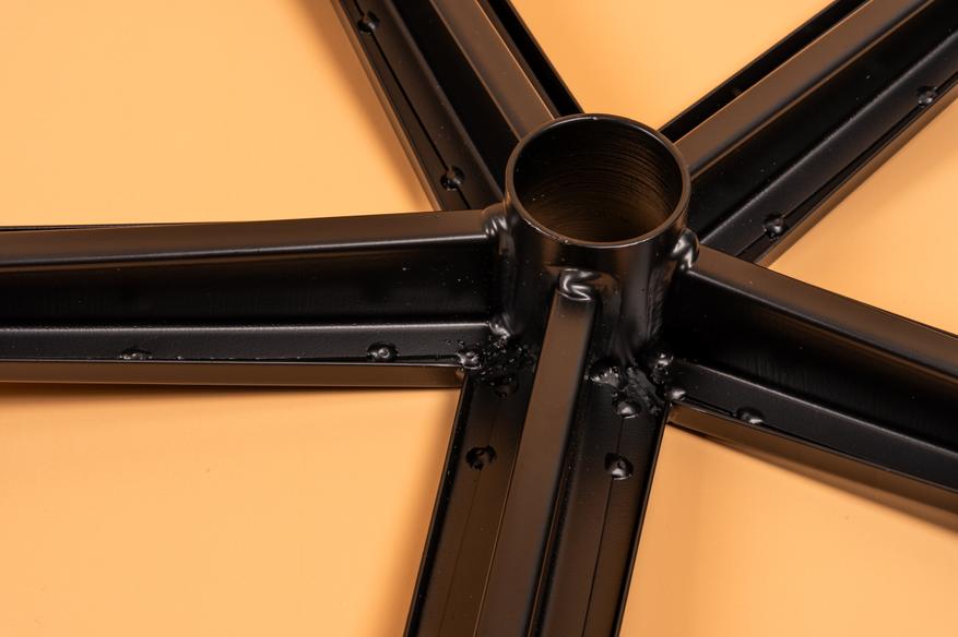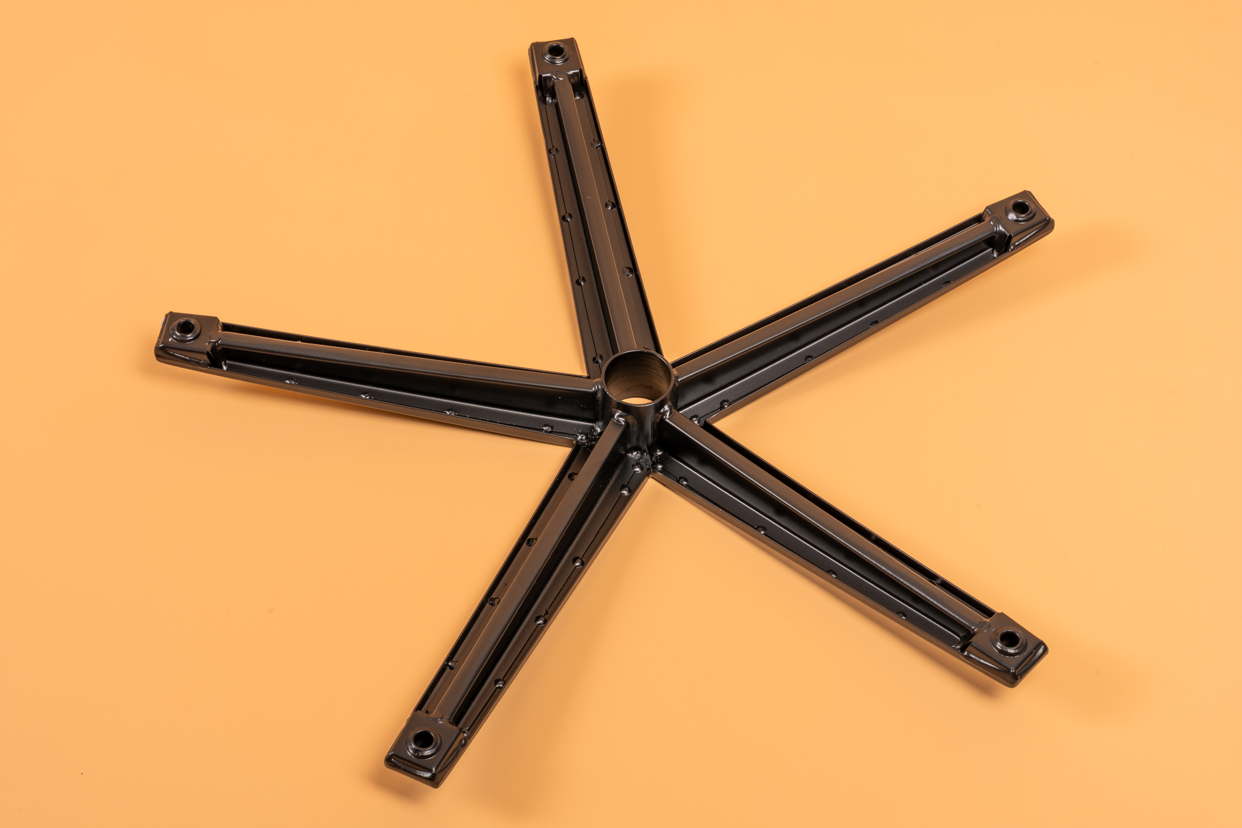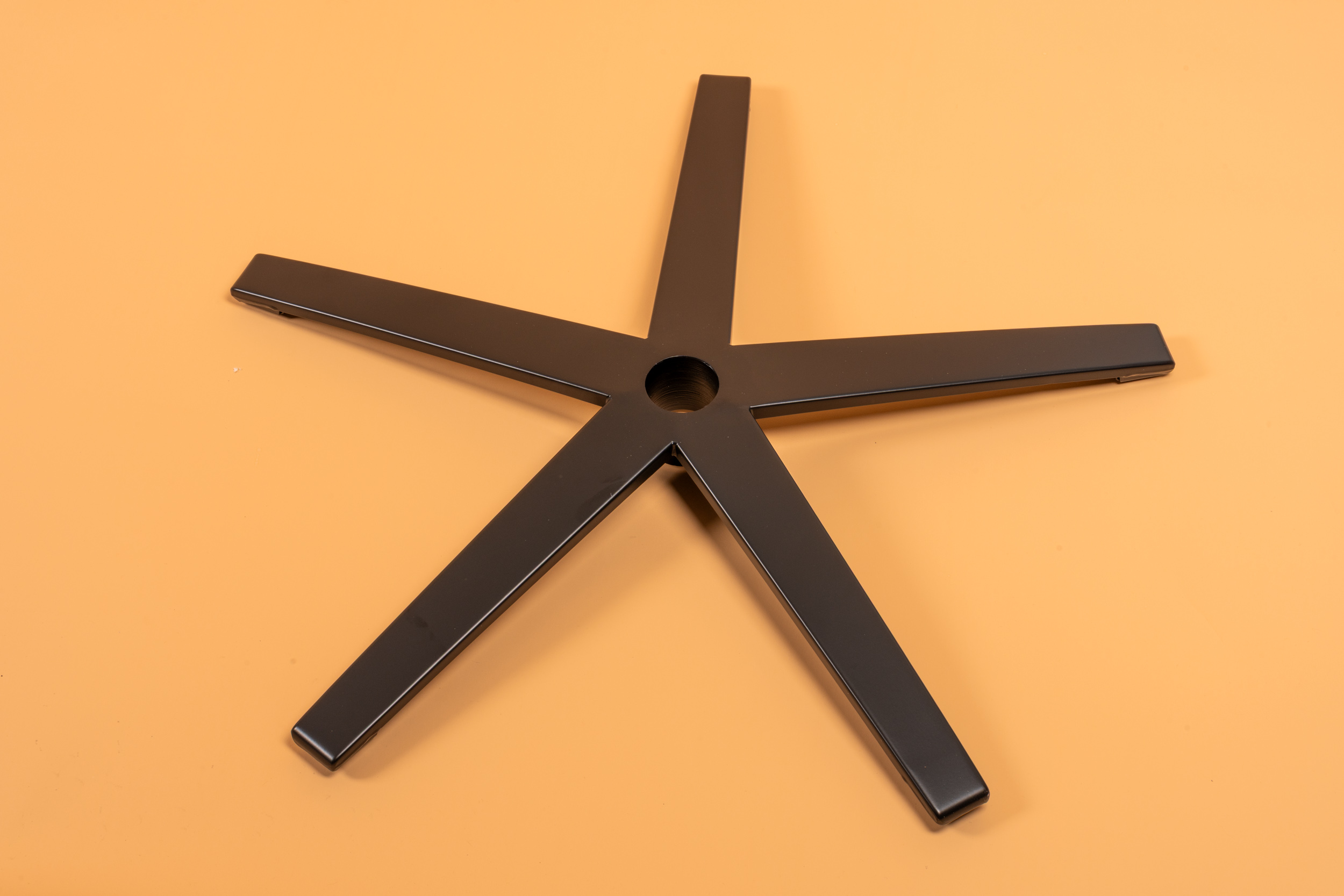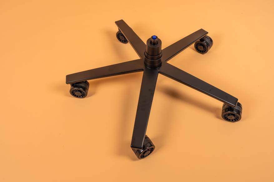 Крестовина игрового кресла Zone 51 EVA-02 выполнена в форме пятилучевой звезды. Металлическая конструкция, окрашенная в строгий черный цвет, усилена сварными швами и ребрами жесткости, обеспечивающими исключительную долговечность. На тыльной стороне каждого луча расположены штатные отверстия для установки роликовых колес.