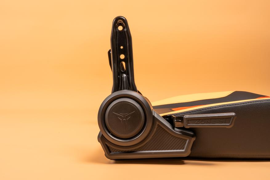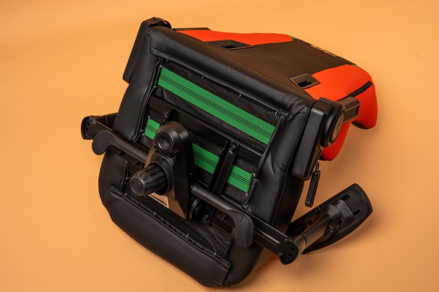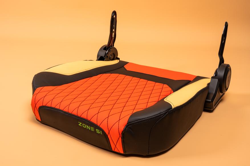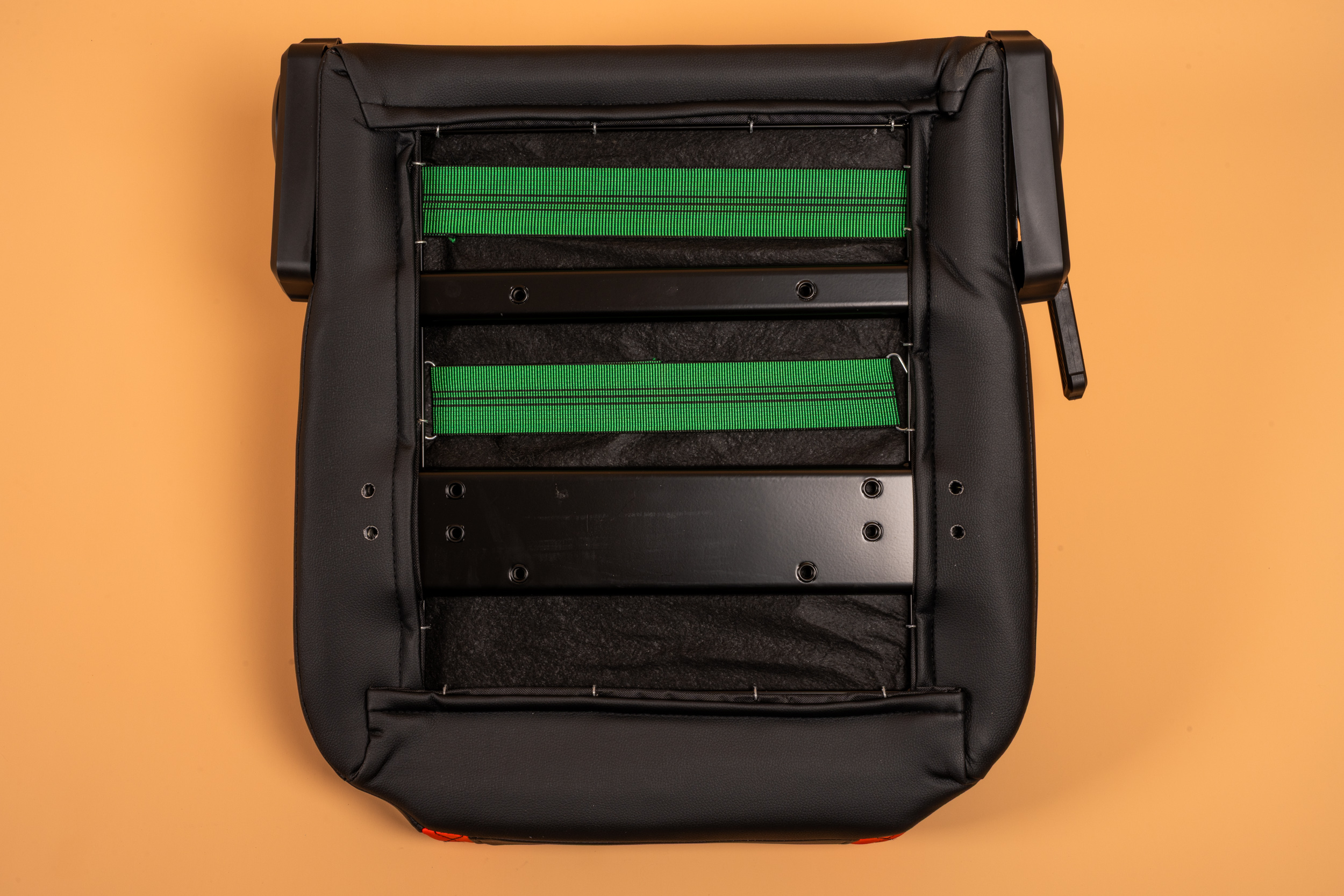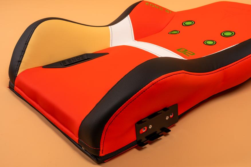 Обивочный материал из перфорированной экокожи, которая, по словам Zone 51, «дышит», предотвращая перегрев, закреплена на каркасе с помощью металлических колец, а швы отличаются ровной строчкой. Для дополнительной стабилизации каркаса на основании сиденья установлены мебельные эластичные ленты. Здесь же расположены направляющие с монтажными отверстиями для установки механизма качания и регулировки высоты.