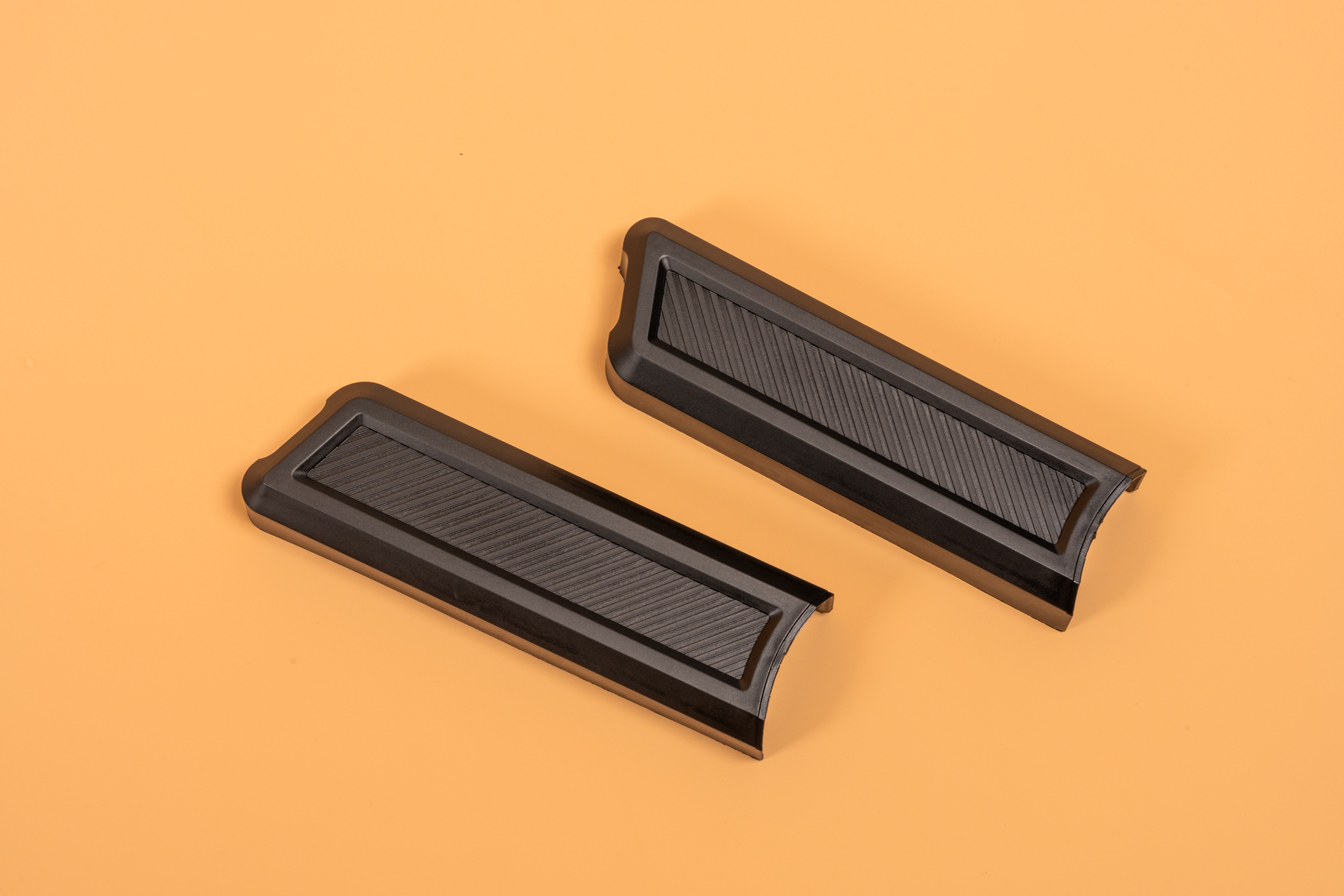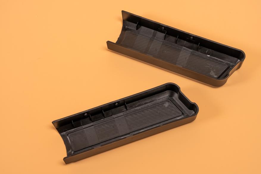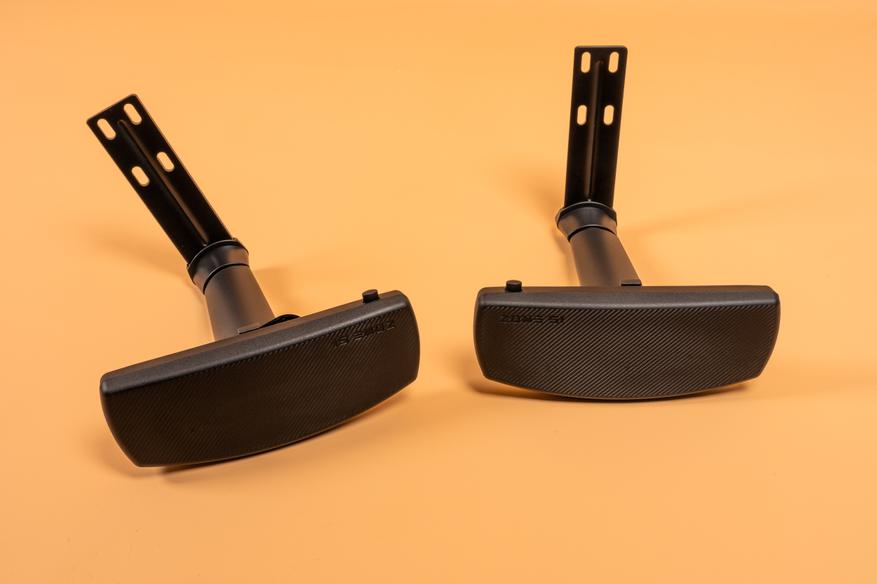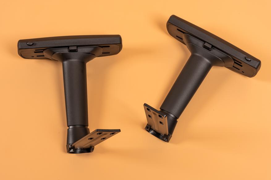 На направляющие при помощи винтов крепятся подлокотники. Их основа выполнена из металла, а внешние панели — из пластика. Конструкция предусматривает регулировку высоты подлокотников.