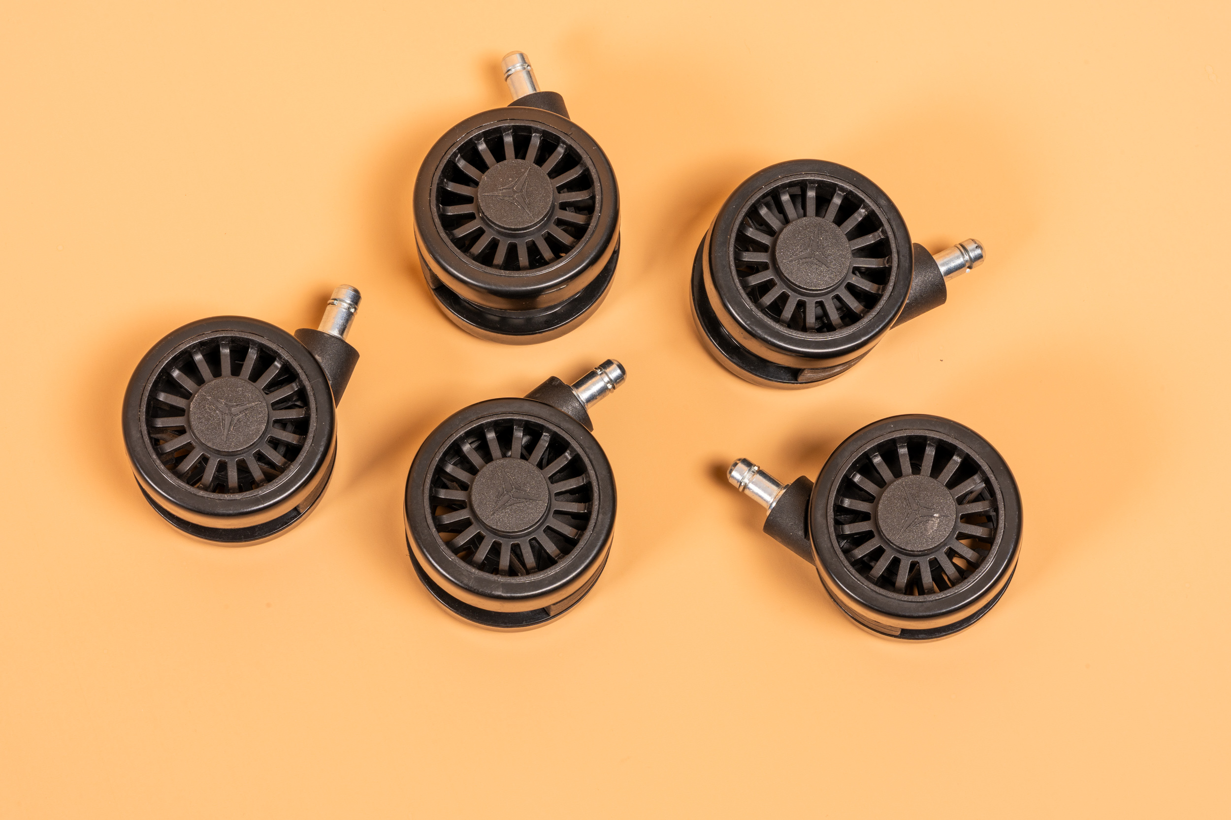 Колеса (ролики) изготовлены из полиуретана и имеют диаметр 75 мм. Данный материал обеспечивает плавное и практически бесшумное катание, а также защищает напольное покрытие от царапин. Установочный шток имеет стандартный типоразмер, что позволяет при необходимости легко подобрать и установить новый комплект колес. При появлении посторонних звуков рекомендуется протереть колеса влажной тканью для удаления скопившейся пыли и загрязнений.