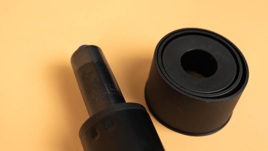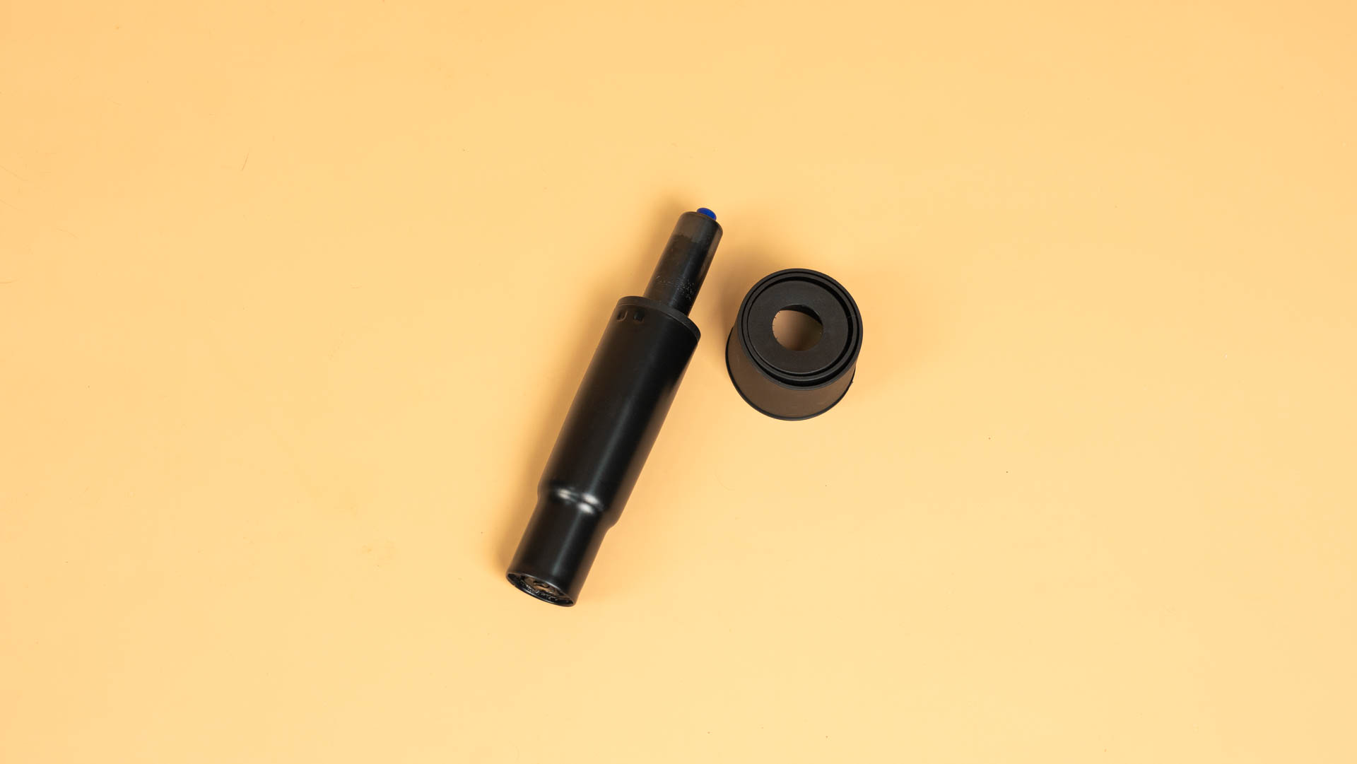 На данном этапе сборки целесообразно установить газлифт. В кресле Yakuza Dragon газлифт четвёртого класса с сертификацией BIFMA, который позволяет выдержать нагрузку до 150 кг и обеспечивает плавную регулировку высоты. Ход штока составляет 65 мм, позволяя изменять положение сиденья в диапазоне от 470 до 535 мм. Производителем газлифта является компания LANT Co., Ltd (Китай). В комплект поставки входит декоративная заглушка для маскировки механизма.