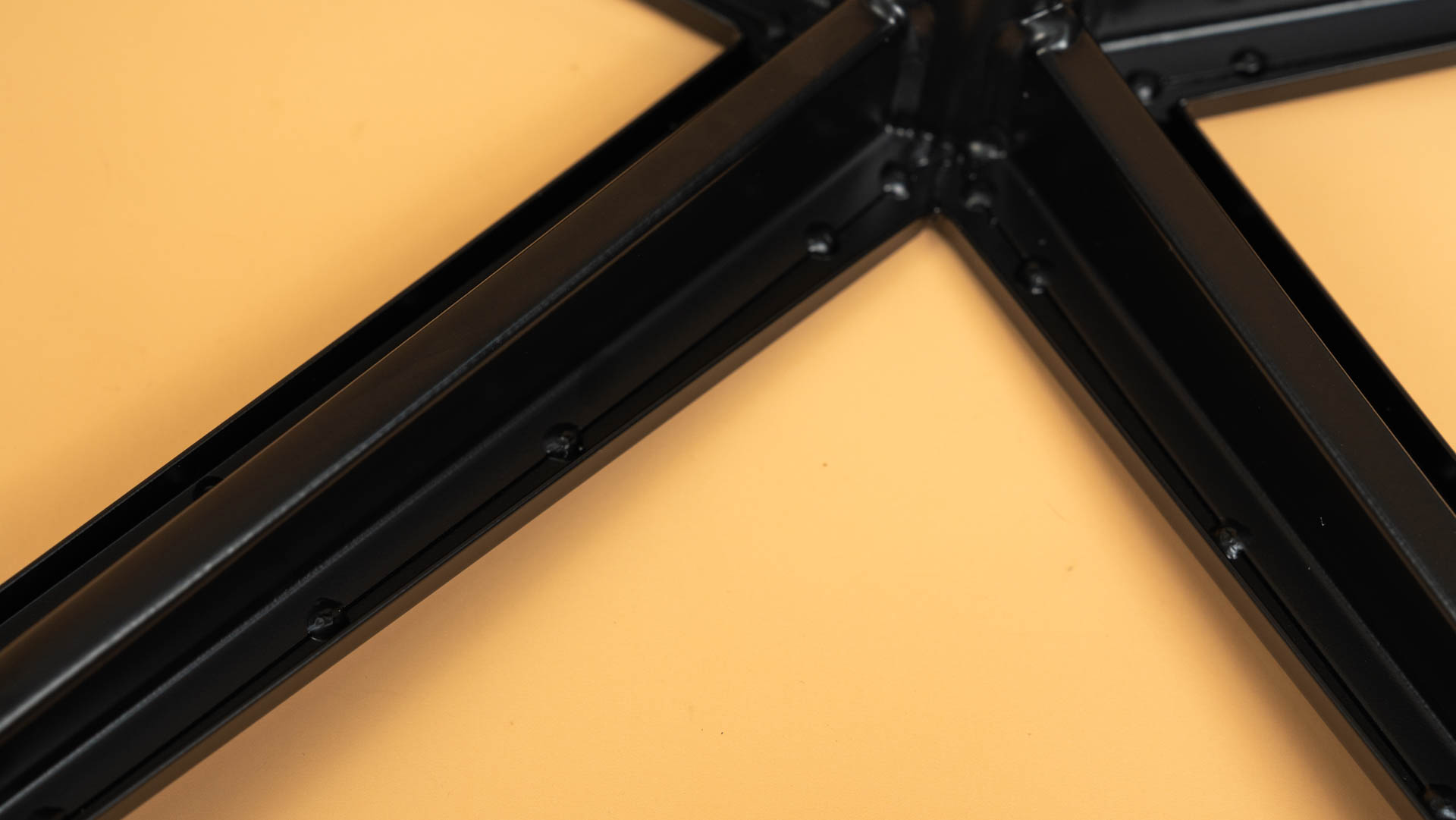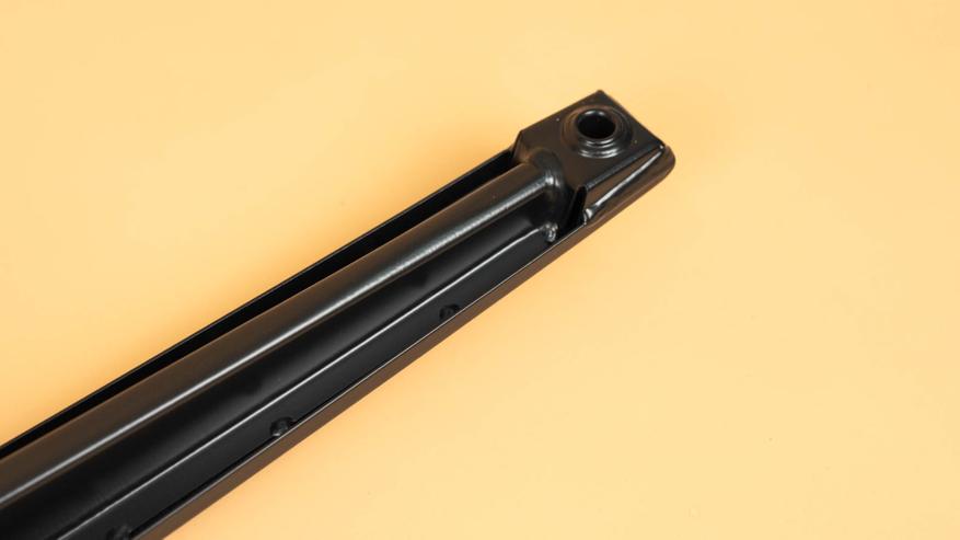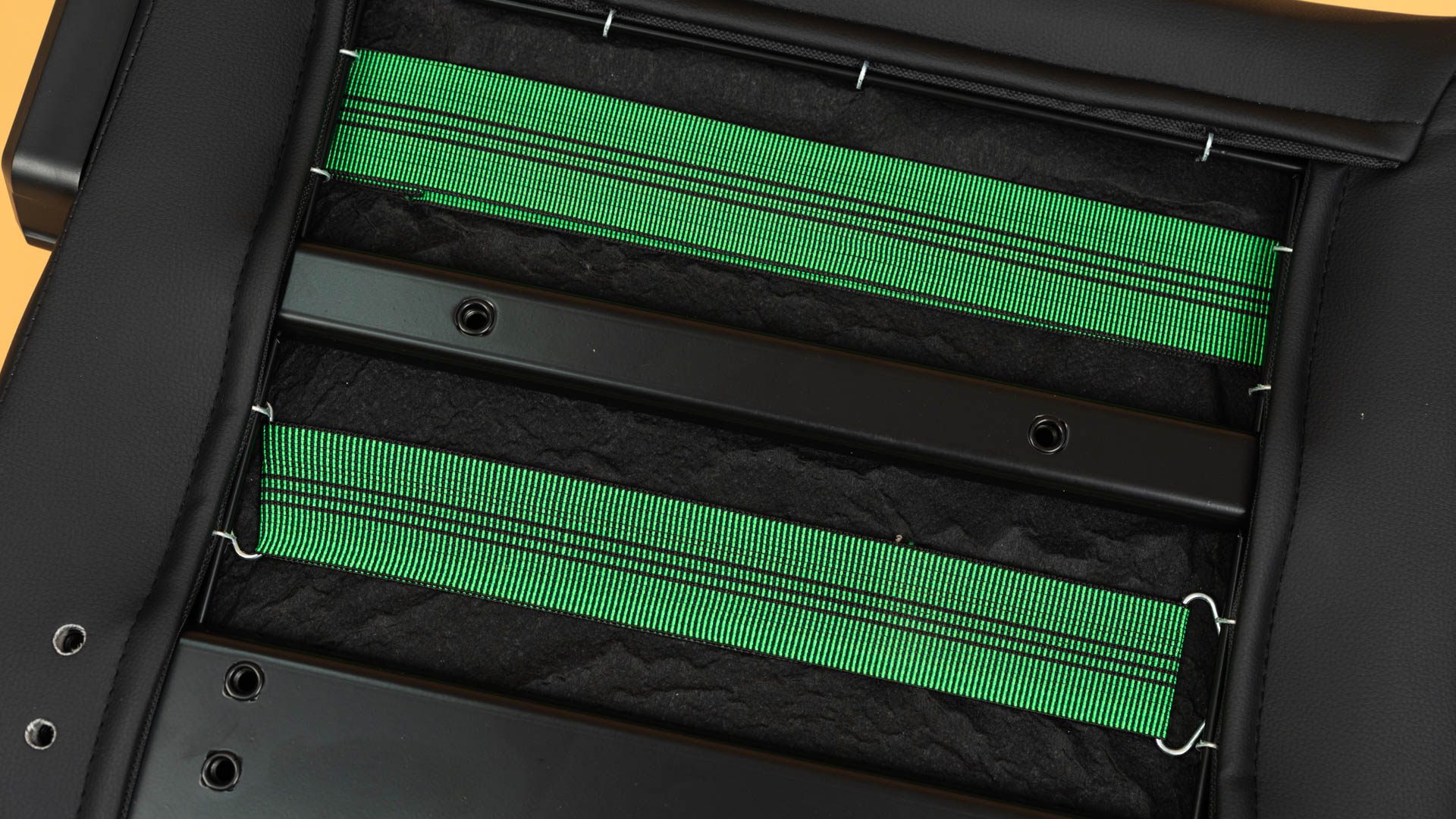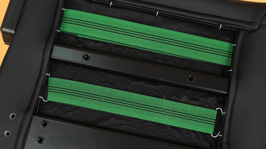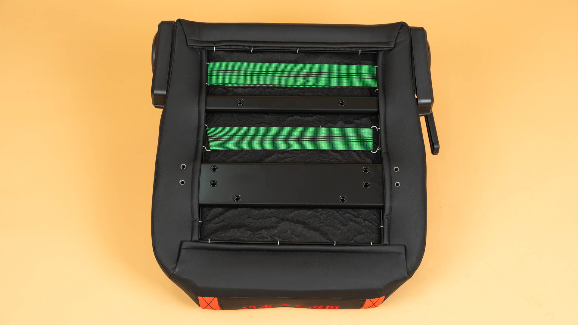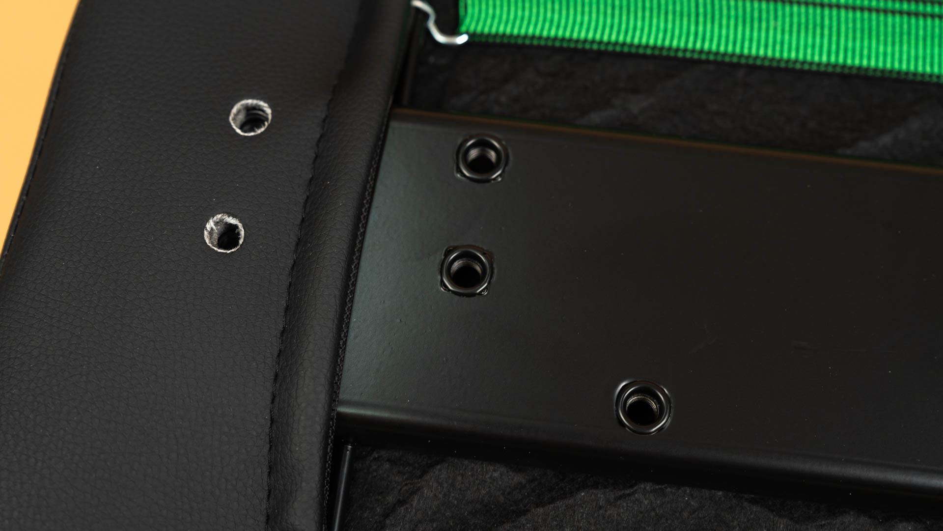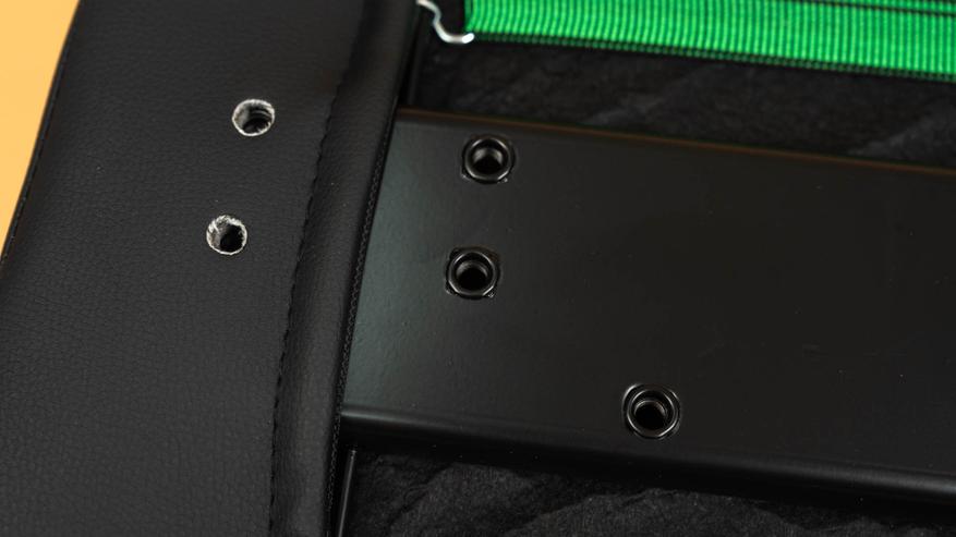 Обивка из перфорированной экокожи закреплена на стальном каркасе с помощью металлических колец. Дополнительную стабилизацию обеспечивают мебельные эластичные ленты. На металлических направляющих сделаны монтажные отверстия для фиксации мультиблока и подлокотников.
