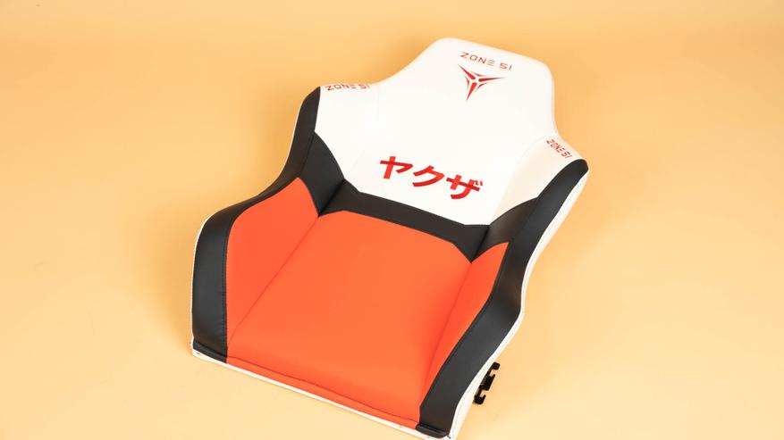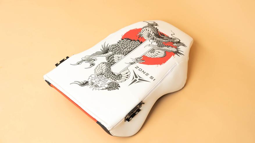 Дизайн спинки выполнен в яркой, контрастной гамме, дополненной белыми вставками и стилистически перекликающейся с сиденьем Yakuza Dragon. Конструкция спинки с выраженной боковой поддержкой, обеспечивающей фиксированную посадку, выполнена по тому же принципу, что и сиденье.