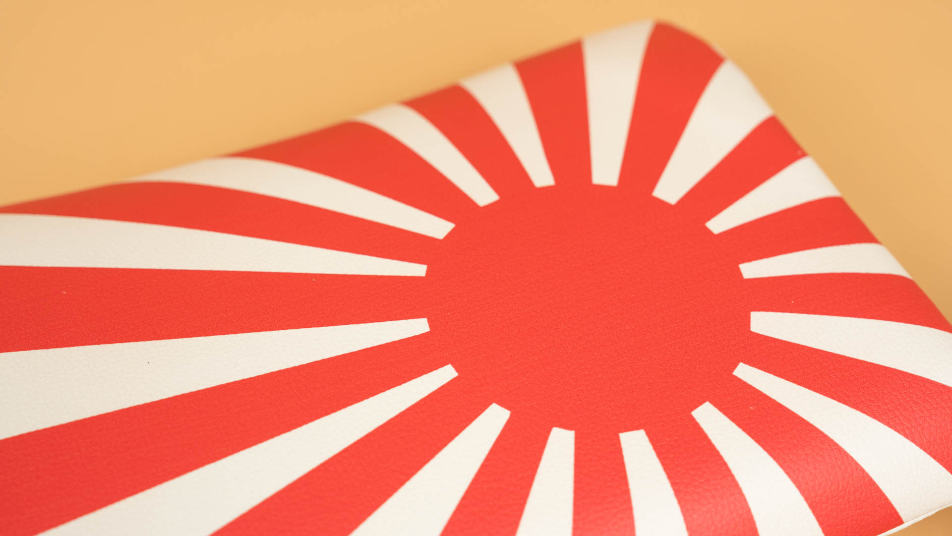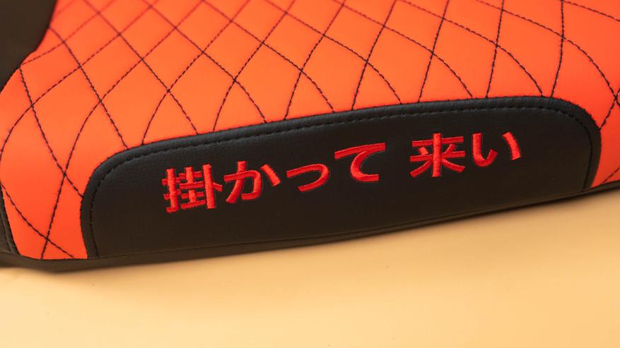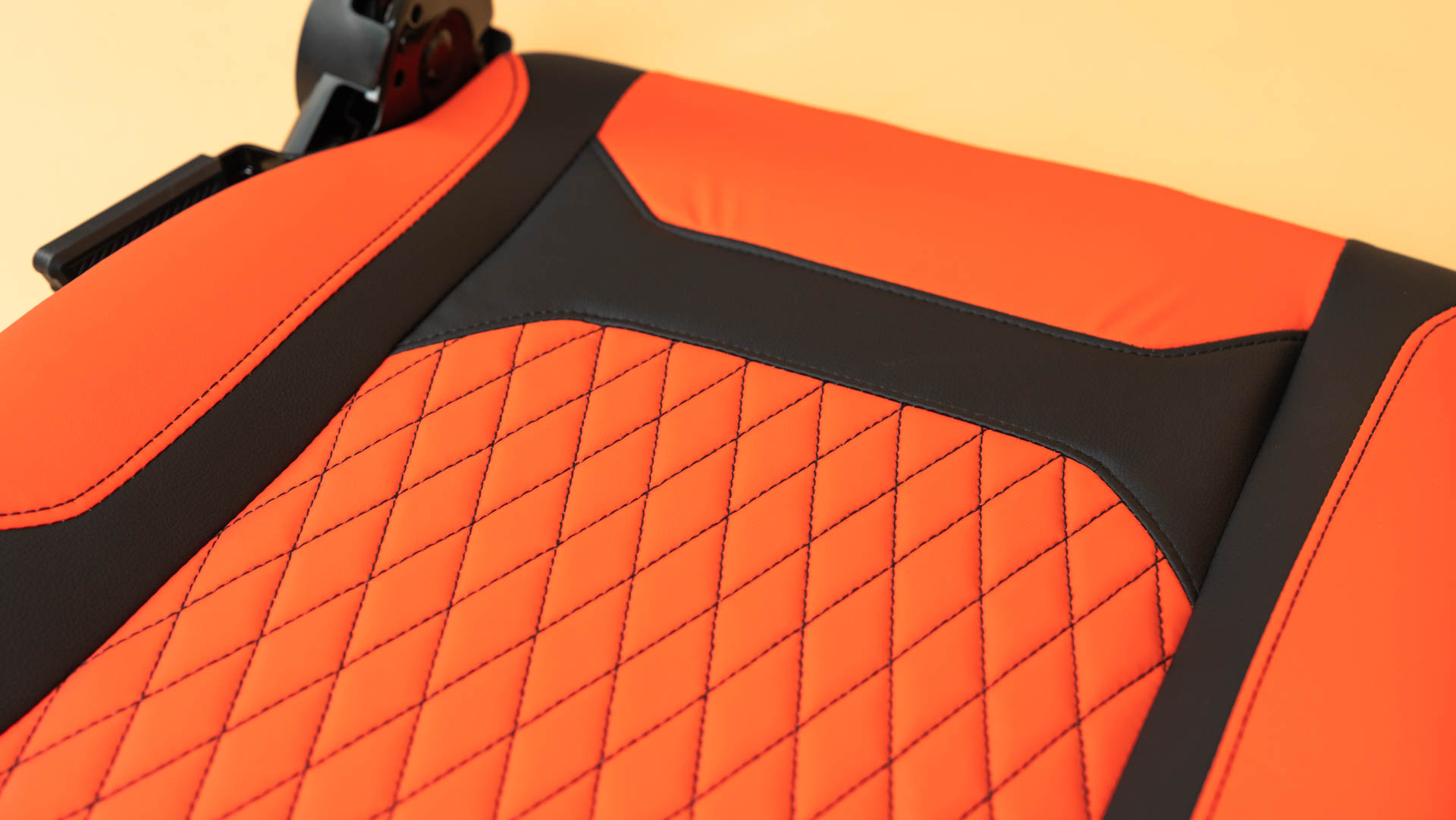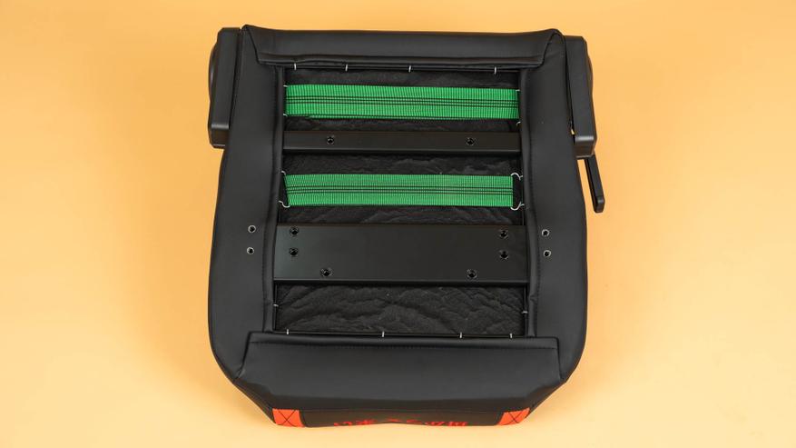 Дизайн сиденья построен на контрасте чёрной и красной экокожи. Визуальный акцент создаёт декоративная прострочка в форме ромбов на поверхности сиденья, дополненная вышивкой на лицевой части спинки. Под обивкой расположен слой наполнителя из формовой пены, обеспечивающий устойчивость к деформации и долговечную упругость.