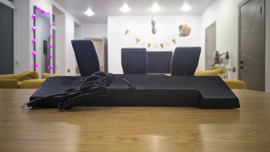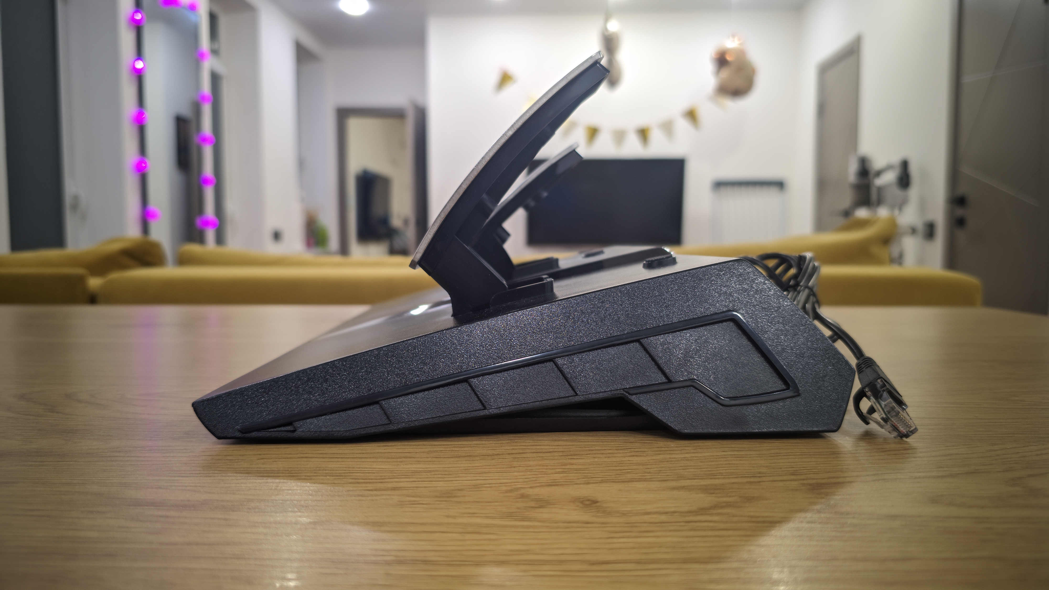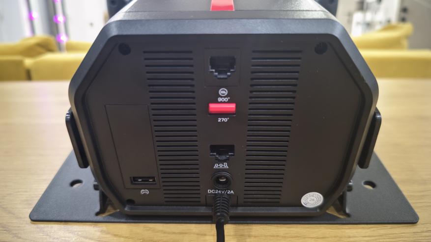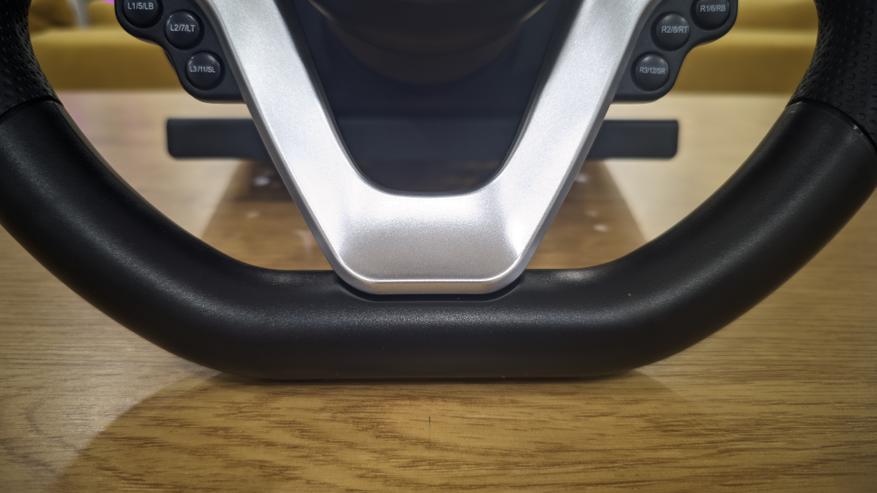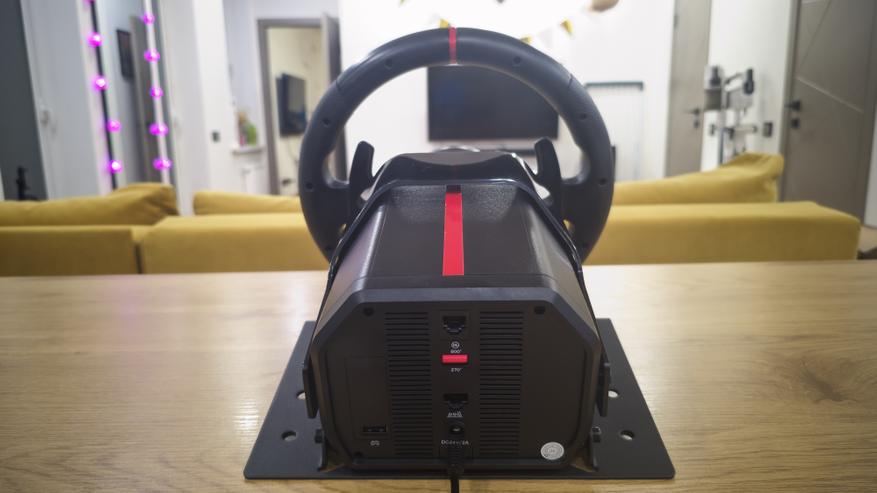 Задняя часть корпуса собрана строго по назначению. Здесь находятся разъемы: педальный блок, коробка передач, USB для подключения к ПК или консоли и питание. Дополнительно имеется переключатель угла поворота, который позволяет быстро адаптировать руль под разные типы гонок — от спокойных симуляторов до аркадных заездов.