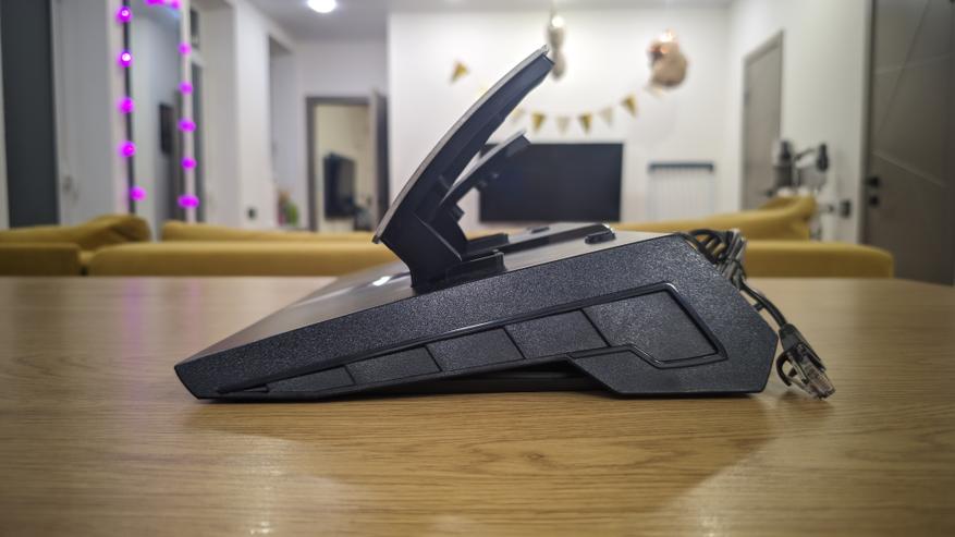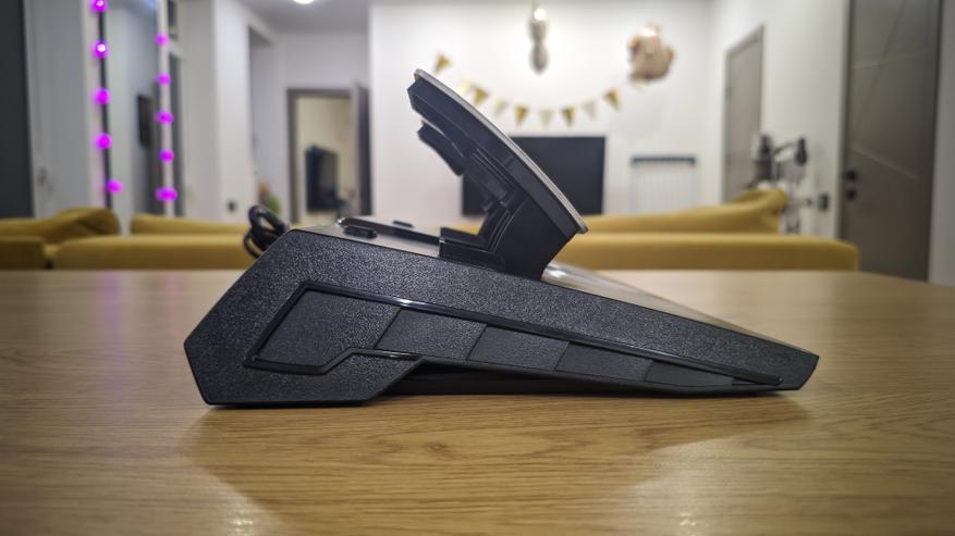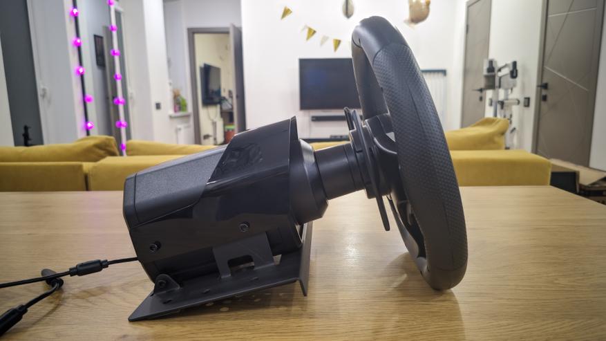 Если смотреть на руль сбоку, заметно, что от обода назад уходит довольно массивный корпус. Он занимает примерно 170 мм по ширине, столько же в глубину и почти столько же в высоту. Боковые панели гладкие. Угол наклона можно менять через узел крепления, который расположен между корпусом и опорной площадкой, диапазон от 5 до 16.6 градусов, три положения, которые фиксируются при помощи винтов.