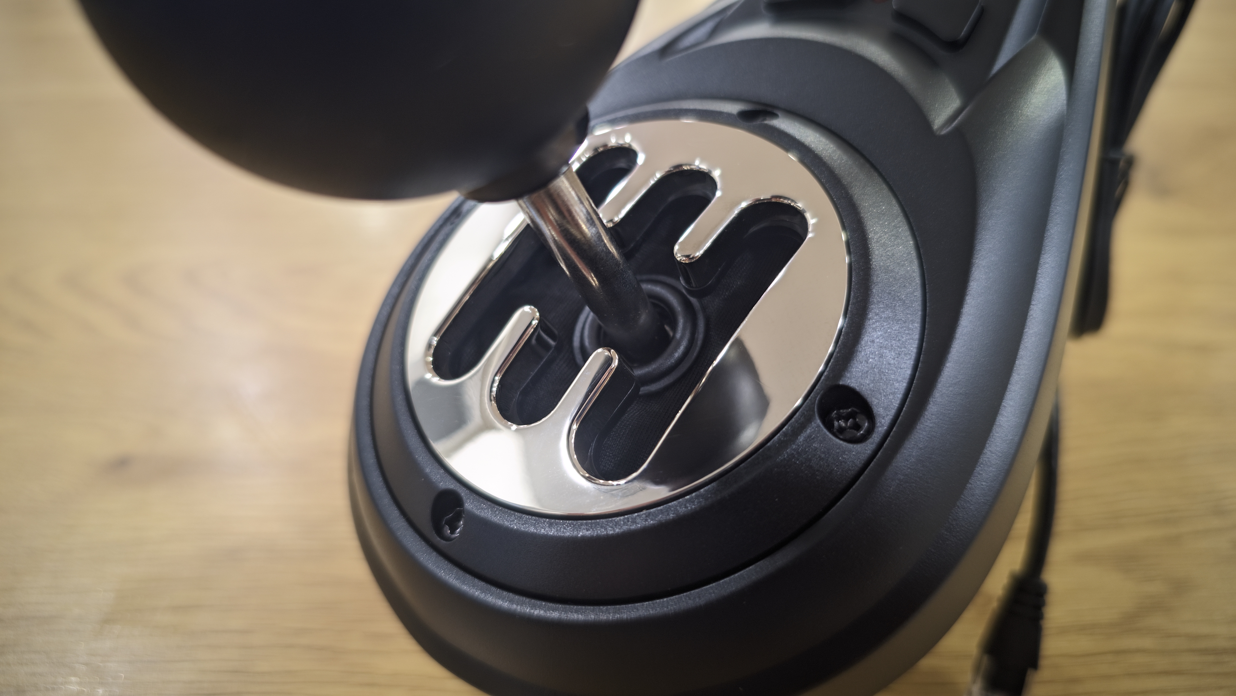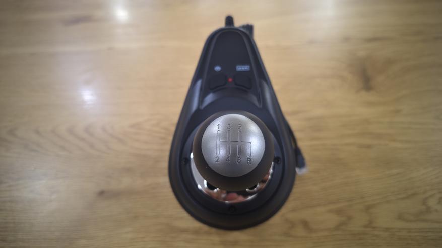 Коробка передач сделана в стиле классического напольного узла, только в компактном настольном каплевидном формате. Сверху расположена хромированная пластина с прорезями под шесть передач и задний ход — вся схема прорезана как у реального автомобиля: 1-6 и R (положение ручки вниз и в позицию 6). Площадка слегка выступает из основного корпуса, края скруглены, а сама пластина закреплена винтами. Рычаг установлен по центру, стойка металлическая, хромированная, а сверху на ней шарообразный набалдашник. Шар сделан из матового пластика. На его поверхности нанесена та же схема передач, что и на металлической площадке, но в более компактном виде. Когда смотришь на рычаг сбоку, стойка кажется довольно длинной, так что хват получается естественный, не прижатый к корпусу. Чуть дальше от водителя, ближе к верхней кромке корпуса, расположены две кнопки: LO-HI и P. LO-HI отвечает за переключение диапазона передач — в этом режиме основная схема 1-6 превращается в 7-12. Рядом находится кнопка P, которая работает как ручной тормоз. Обе кнопки выступают и имеют небольшой ход, между ними расположен светодиодный индикатор.