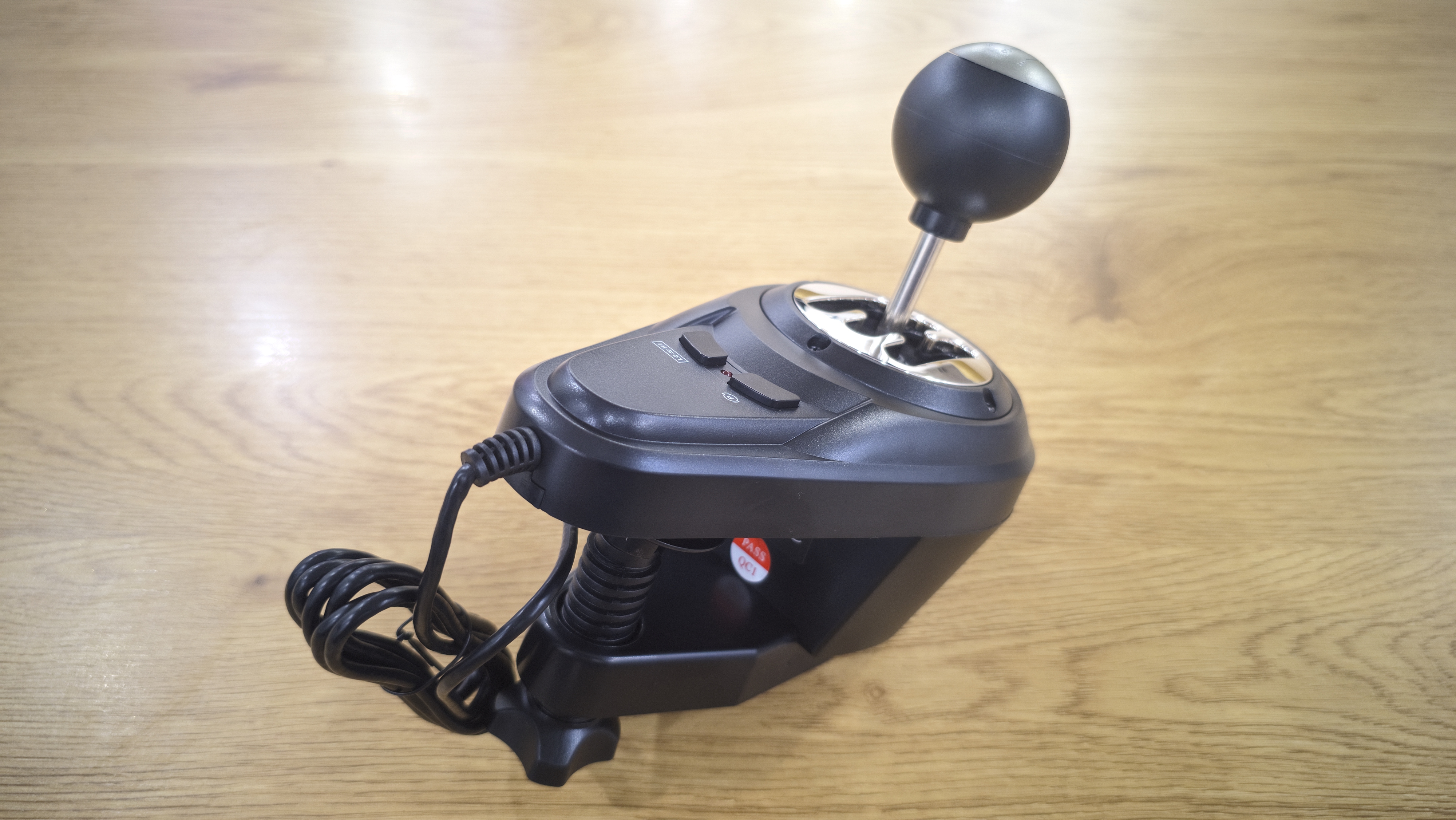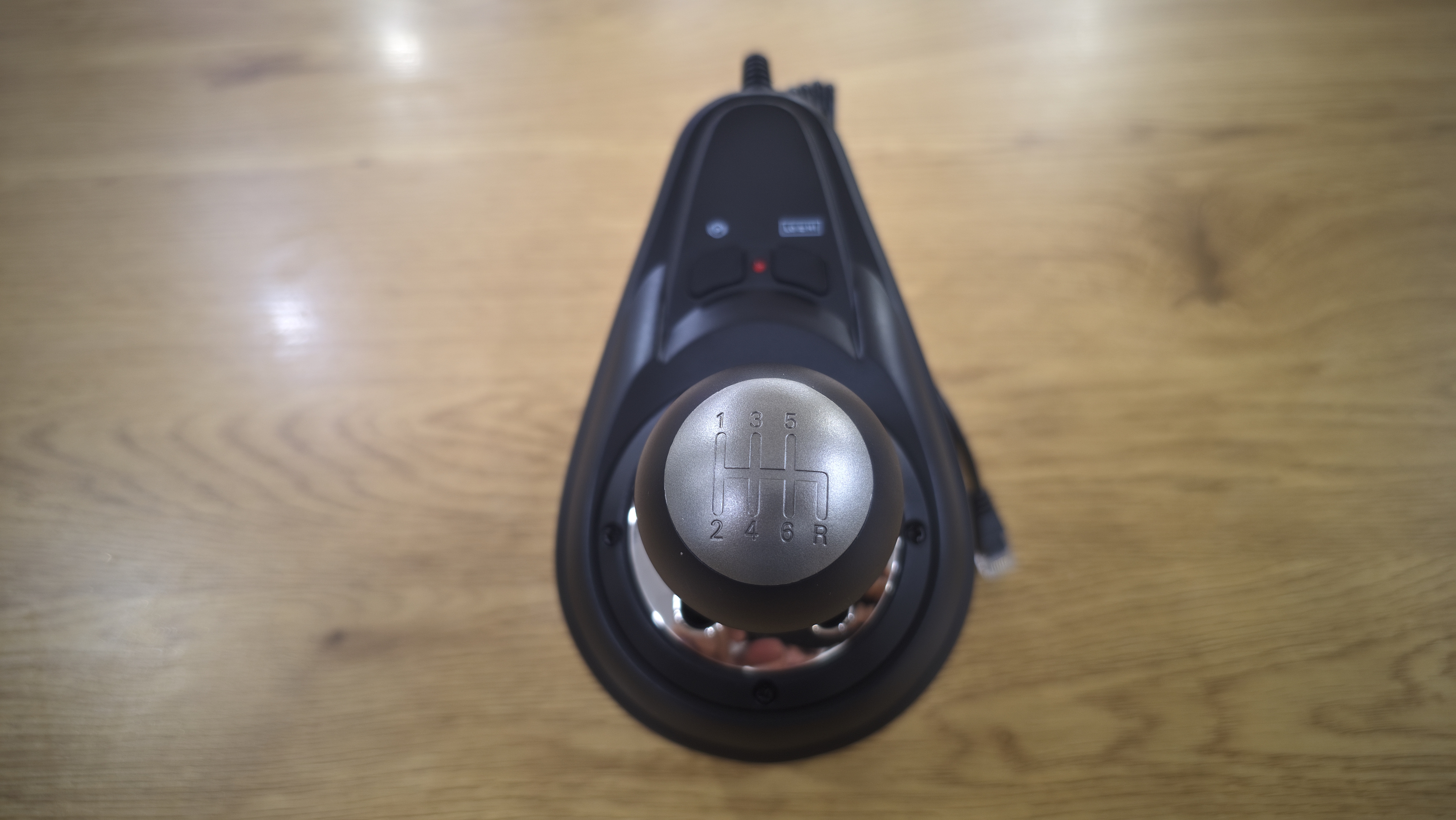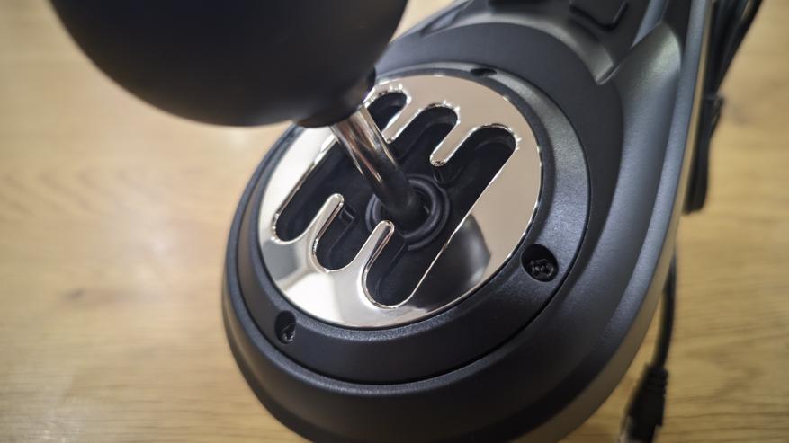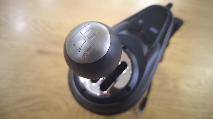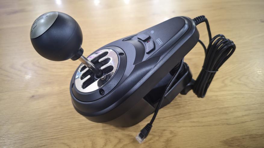 Коробка передач подключается как отдельный модуль и работает только в тех играх, которые поддерживают ручное переключение. Основная схема — шесть скоростей и задний ход. Дополнительно есть кнопка LO-HI, которая позволяет переключать коробку в расширенный режим. Тогда передачи 1-6 становятся 7-12. Световой индикатор сообщает, какой диапазон активен. Также предусмотрена кнопка P, работающая как ручной тормоз, если игра позволяет использовать такую функцию.