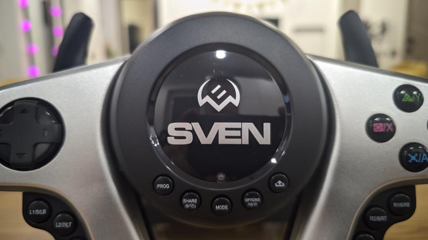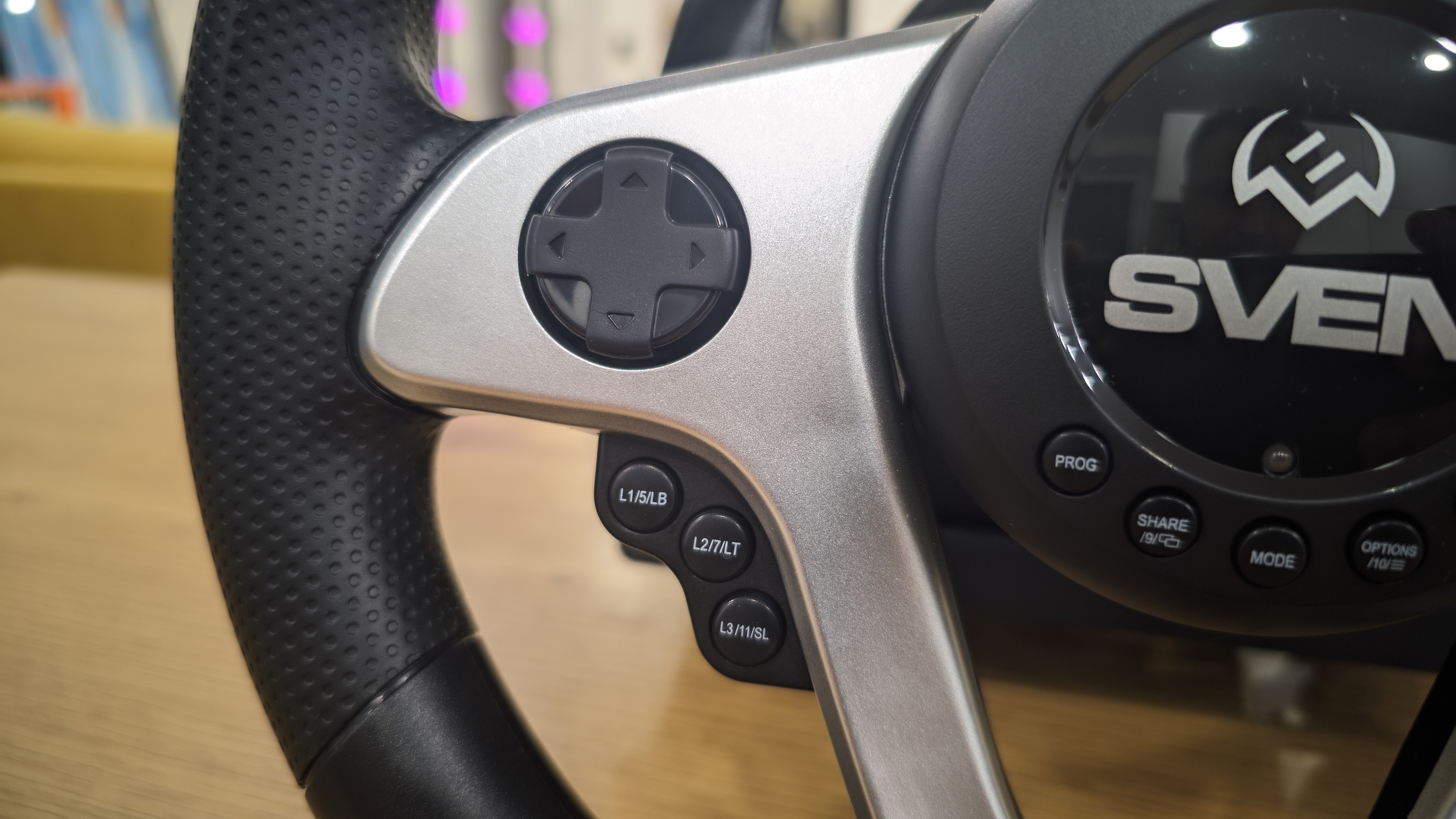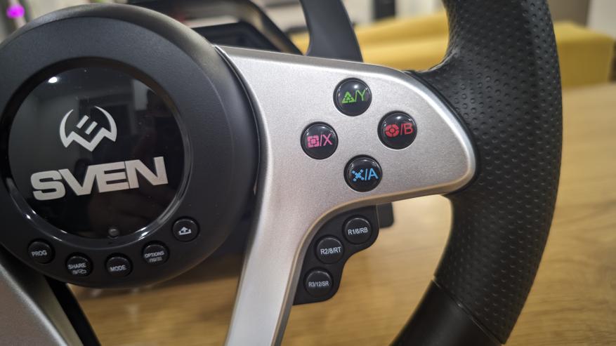 Рулевое колесо Sven GC-W1000 не маленькое и не игрушечное. Внешний диаметр около 280 мм. По ощущениям оно ближе к компактным автомобильным рулям. Обод одинаковой толщины по всей окружности, с мягкими резиновыми вставками в местах хвата. Эти вставки идут по бокам почти от верхней точки до нижних участков, и их фактура заметно отличается от гладкого пластика. В верхней части обода нанесена красная метка, которая помогает ориентироваться, когда руль повернут. Центральный блок крупный. В центре круглой части расположен индикатор режима, который меняет цвет в зависимости от выбранного способа подключения. Ниже находятся системные кнопки — PROG, SHARE, MODE, OPTIONS и еще одна кнопка SHARE. Они сгруппированы вокруг круга на небольшой панели, и расположение сделано так, чтобы к ним можно было дотянуться, не меняя положения рук. Слева размещена площадка с крестовиной. Это восьмиосевой D-Pad, он слегка выступает из панели и отделен от центральной зоны. Под крестовиной идут три кнопки L1, L2 и L3; они стоят по вертикали и подписаны. Справа аналогичная площадка, но вместо крестовины здесь блок из четырех игровых кнопок A, B, X и Y. Они выделяются яркими буквами и расположены так что большой палец ложится на них автоматически. Чуть ниже идут R1, R2 и R3 — правая группа вспомогательных кнопок. Вся раскладка повторяет логику геймпада, только перенесена на руль.