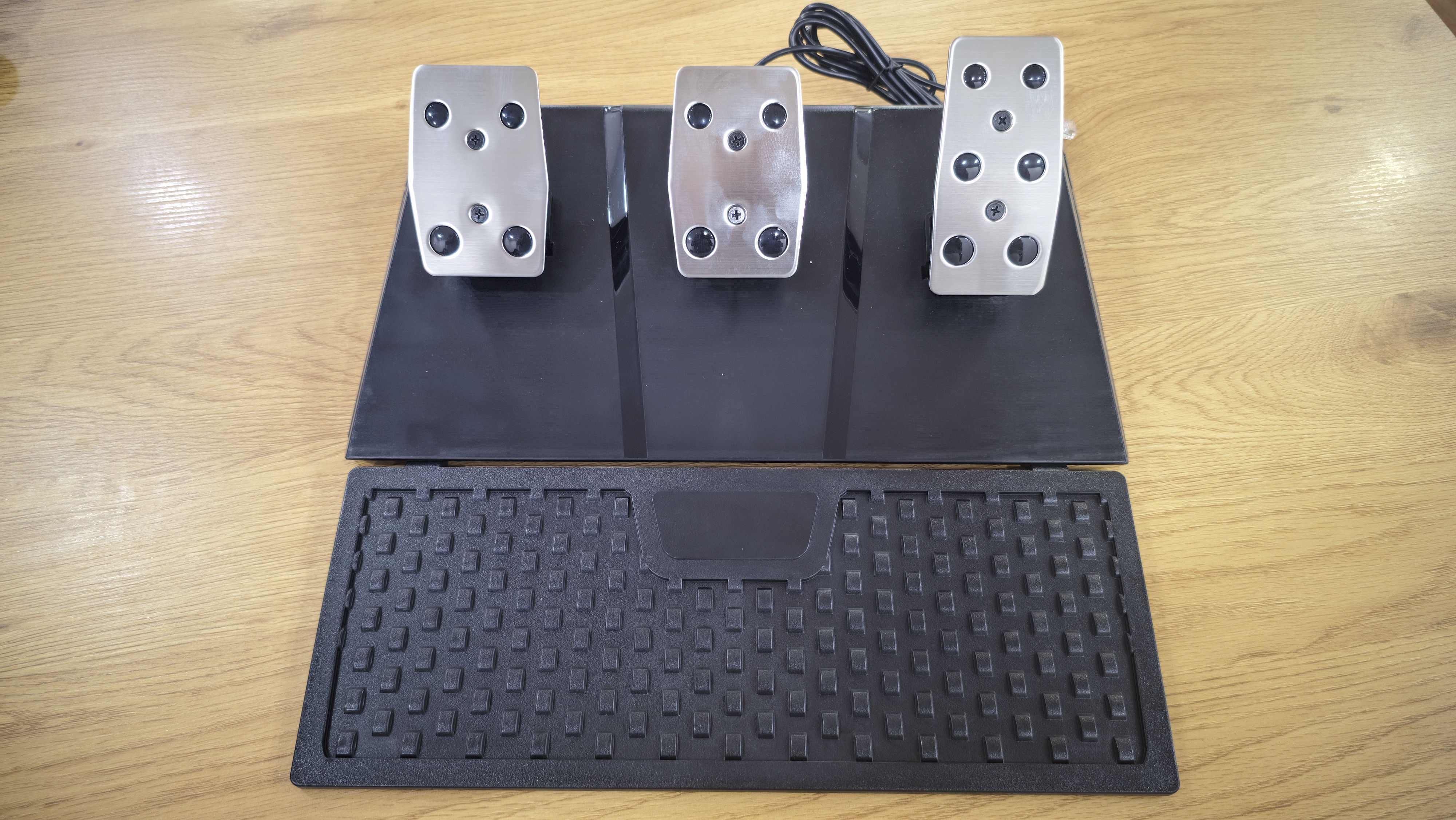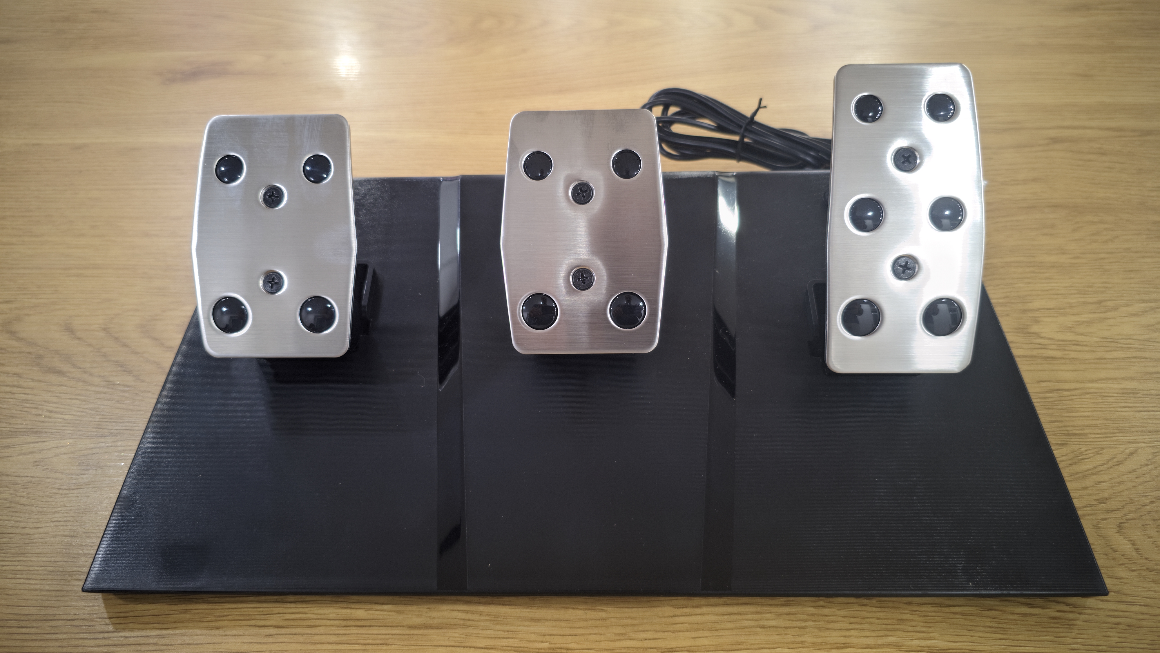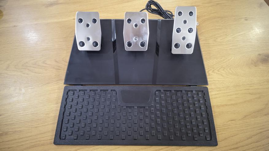 Педальный блок состоит из трех педалей — сцепления, тормоза и газа, которые стоят на общей платформе. Педаль акселератора немного крупнее, расположена на разной высоте и под разными углами с педалями сцепления и тормоза. Все три педали имеют металлические накладки с круглыми декоративными отверстиями. Металл матовый, с легкой горизонтальной шлифовкой, а сами накладки закреплены на пластиковых рычагах. Из-за такой конструкции педали выглядят ближе к автомобильным, а не к игровым.