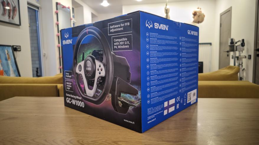Sven GC-W1000 поставляется в картонной коробке, оформленной в фирменном стиле Sven: на лицевой стороне напечатано крупное изображение руля, а рядом вынесены основные возможности устройства. Боковые грани дополнены фотографиями педального блока и коробки передач, а также пиктограммами, показывающими основные функции.