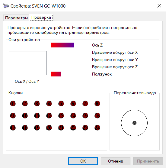Перед запуском игр я начал с базовой проверки через стандартные средства Windows. В окне свойств устройства Sven GC-W1000 корректно определился системой. Поворот рулевого колеса отображался по оси X, педали фиксировались как отдельные оси и реагировали на нажатие по всей длине хода. Все кнопки, включая элементы на руле и сигналы от коробки передач, корректно подсвечивались при нажатии. При этом рулевое колесо в этом режиме ощущалось зафиксированным. Оно не вращалось свободно, что на первый взгляд может выглядеть как блокировка, но на этом этапе это нормальное поведение. Производитель заявляет магнитный энкодер, который обеспечивает точность и отсутствие мертвых зон. В тестах это подтвердилось — руль реагировал плавно и без провалов.