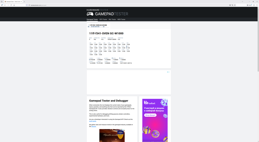 Дальше я проверил комплект через онлайн-сервис Gamepad Tester. Картина здесь оказалась аналогичной. Руль, педали и коробка передач определяются как единое устройство, все оси и кнопки отображаются в реальном времени. При вращении руля меняется значение оси, педали реагируют на степень нажатия, передачи фиксируются как отдельные сигналы. При этом само рулевое колесо снова остается в пассивном состоянии и не дает свободно крутиться, без усилия и возврата в центр.