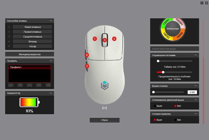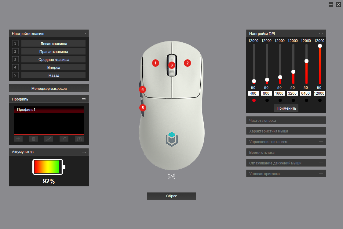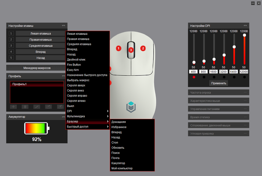Можно выставить свои значения для каждого режима DPI. Помимо этого, можно выбрать частота опроса от 125 до 1000 Гц. Стоит учесть, что чем выше частота, тем быстрее разряжается аккумулятор.