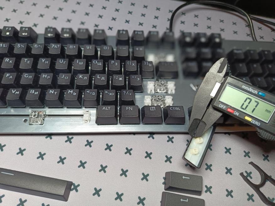 Толщина колпачков всего 0.7 мм, но они изготовлены по технологии двойного литья из PBT пластика. У всех широких клавиш установлена двойная стабилизация.