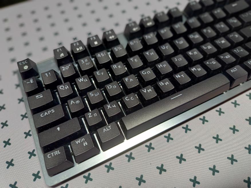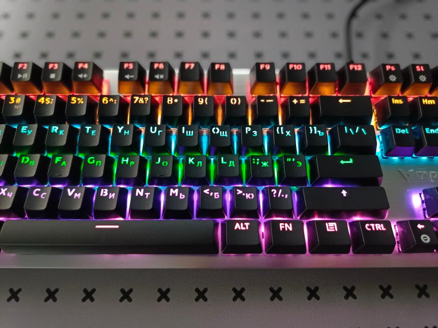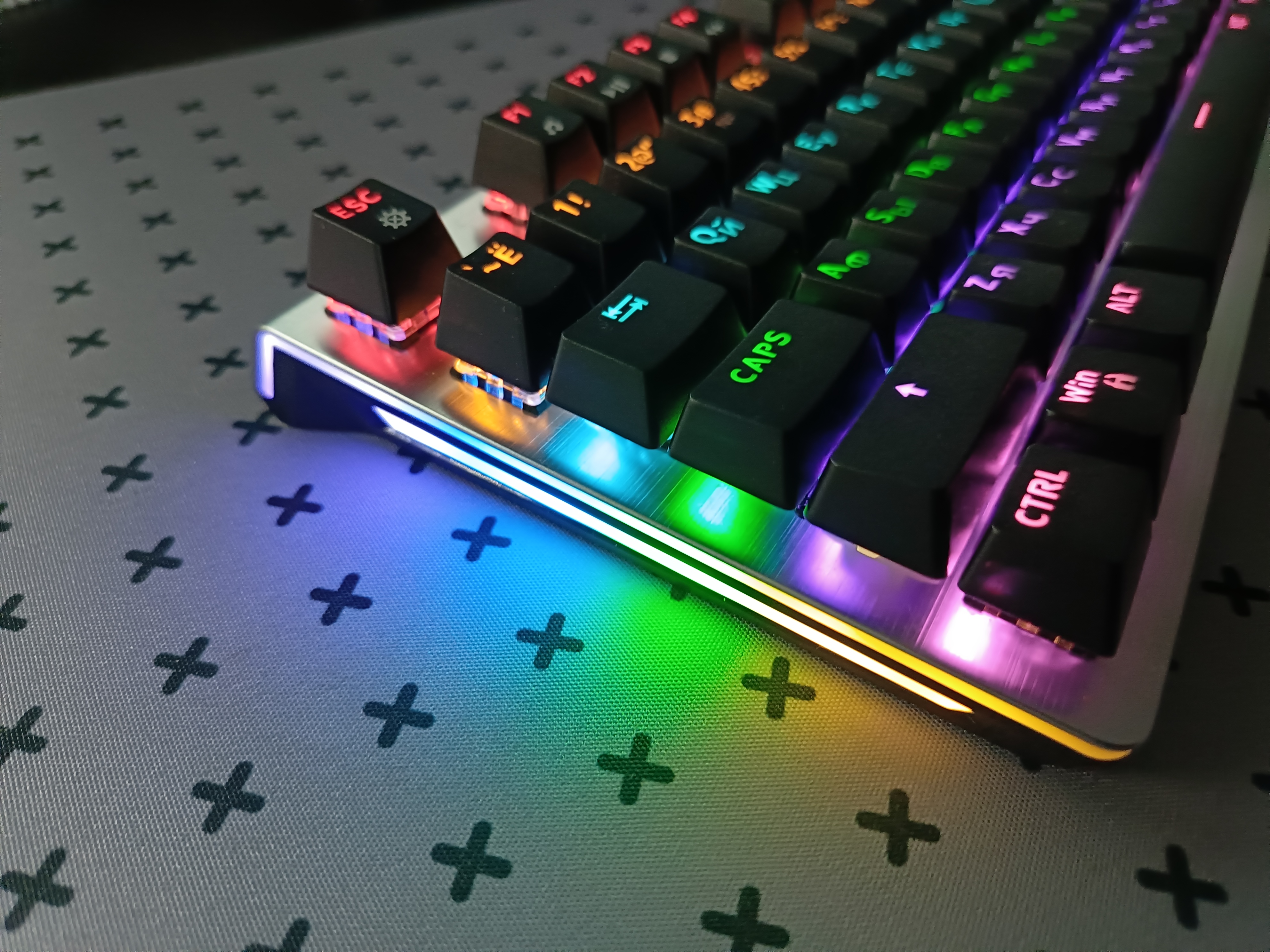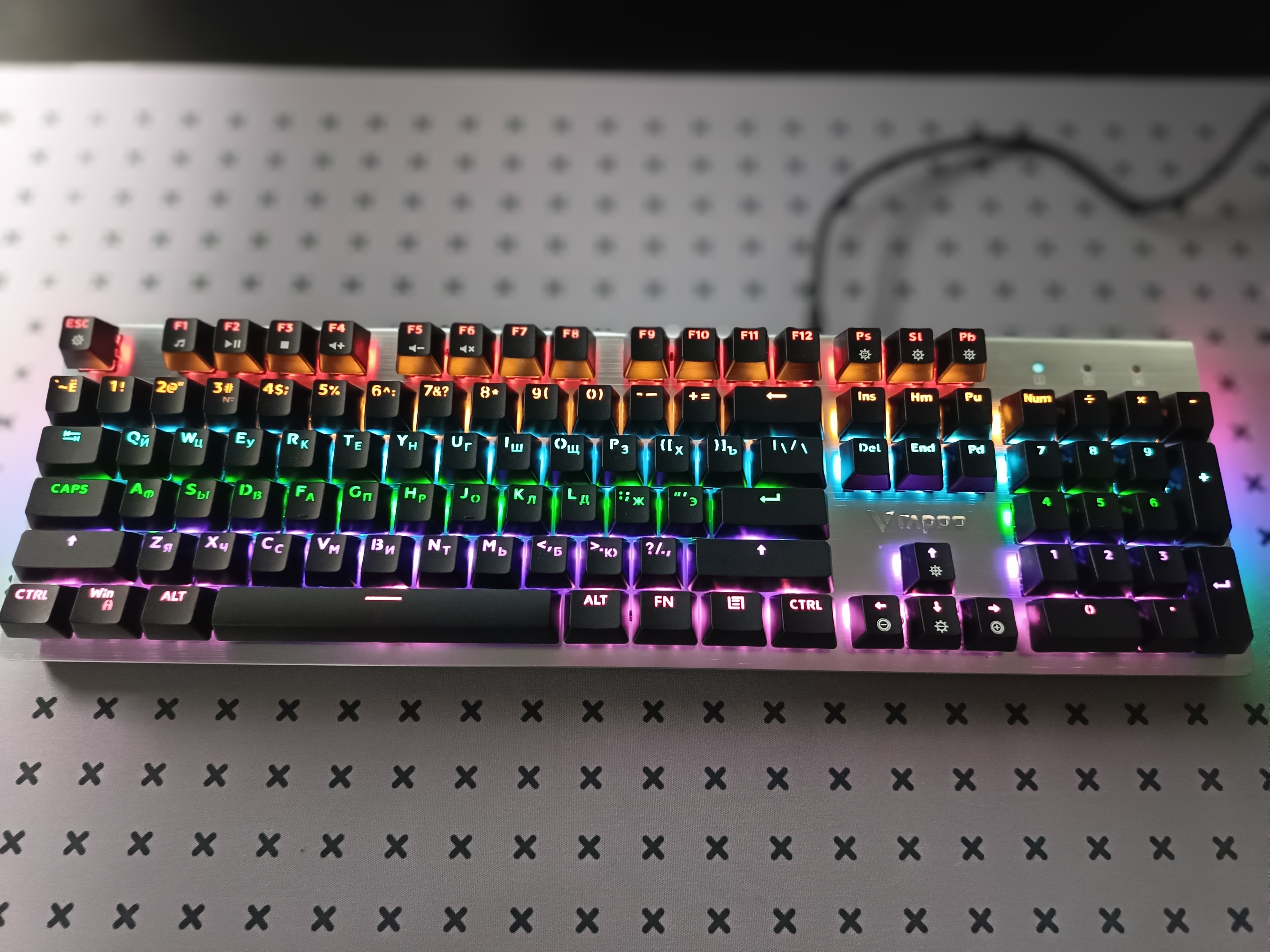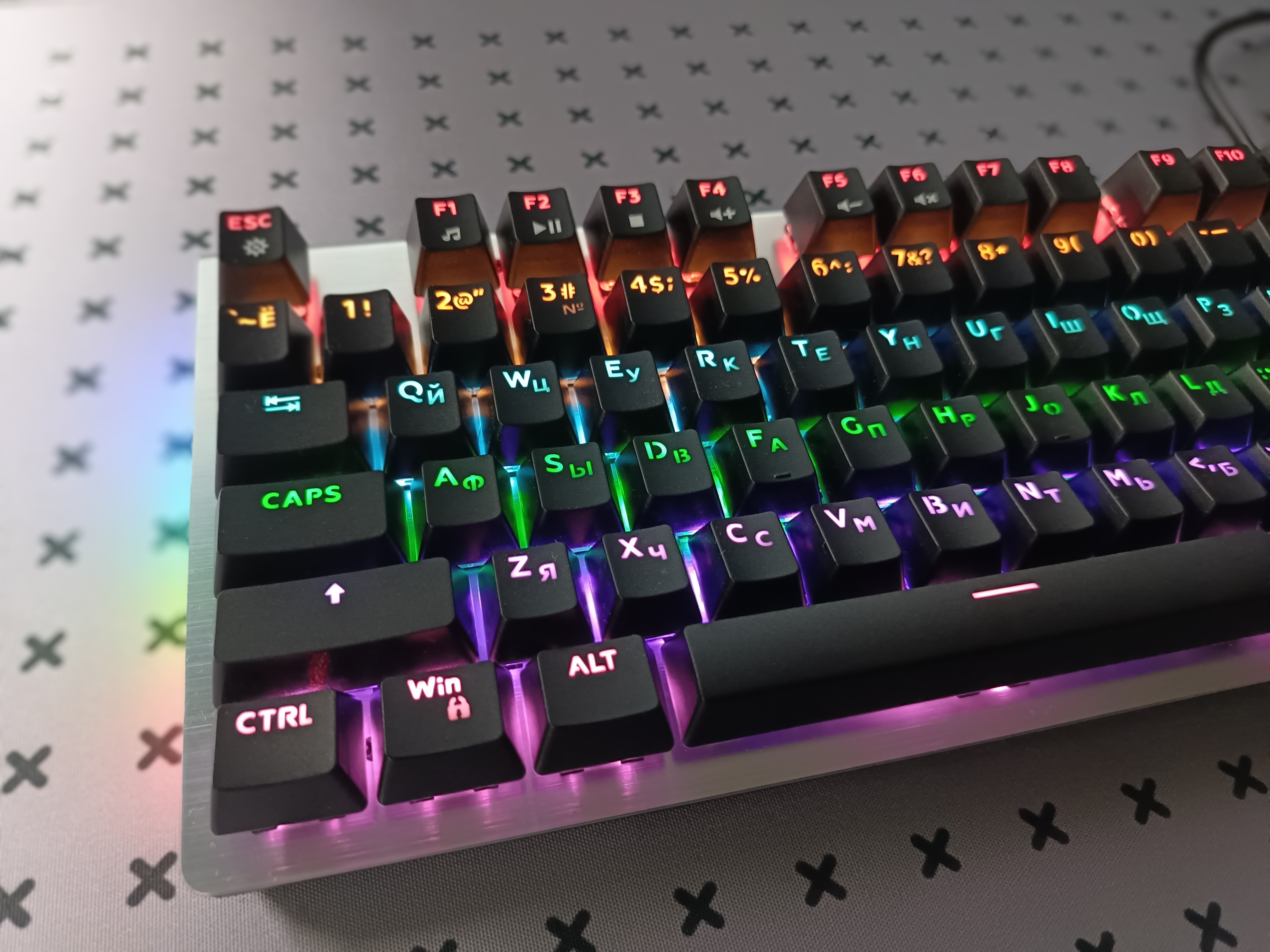 Клавиатура оставила у меня положительное впечатление. За свою цену она предлагает отличное качество сборки, удобную полноразмерную раскладку и яркую двухконтурную подсветку. Металлическая пластина делает её надёжной и устойчивой, а PBT-колпачки порадовали подсветкой символов.