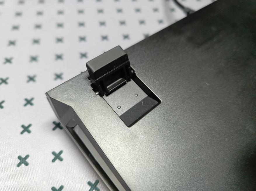 На нижней части расположены откидные ножки, которые позволяют немного изменить угол наклона. На них нанесены резиновые вставки, что предотвращает скольжение по поверхности стола. Ножки одинарные.