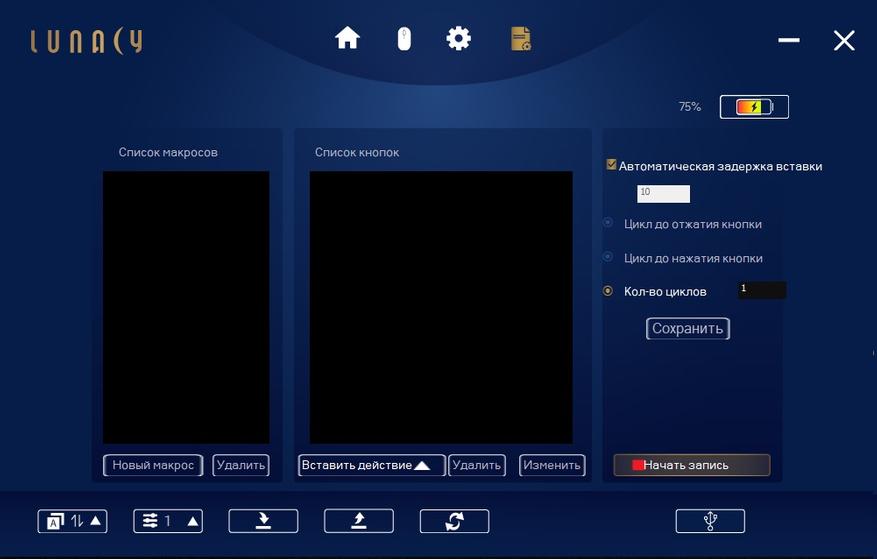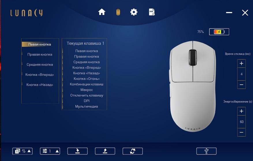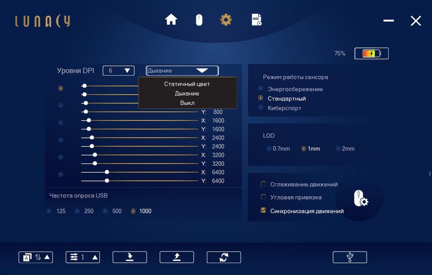 Игровая мышка имеет программное обеспечение, которое при желании можно скачать на официальном сайте компании. Отмечу, что проводное подключение имеет меньшее количество настроек нежели подключение по беспроводной связи. По проводу нам будет доступна только частота опроса до 1000 Гц, по беспроводному подключению (2.4 ггц — комплектный ресивер) частота опроса может составлять до 8000 Гц. В ПО пользователь может выбрать CPI/DPI, частоту опроса, создать макросы, переназначить кнопки на выполнения необходимых команд, выбрать работу сенсора (энергосбережение, нормальный, киберспорт), включить сглаживания движений, включить или выключить угловую привязку, включить или выключить синхронизацию движений. Также пользователю доступно изменение отклика, а также визуальный контроль за остаточным зарядом аккумулятора.