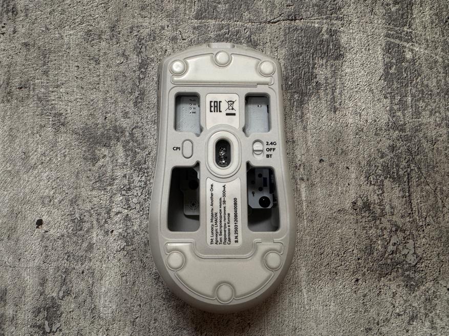 Представлена игровая мышка Lunacy Аnother Оne в белом и черном цвете. Внешний вид не выделяется никакими вставками или сложной конструкцией. Мышка обладает пятью кнопками: на верхней части 2 основные кнопки и конечно же колесико прокрутки, с левой стороны 2 дополнительные кнопки, которые как и у большинства мышек такого классам могут быть переназначены для выполнения нужной команды. На передней части имеется разъем USB Type-C, который используется не только для зарядки встроенного аккумулятора, но и для использования мышки по кабелю. На задней и правой стороне имеется название компании и название модели данного девайса. Мышка полностью сделана из пластика и имеет матовую белую поверхность, на которой загрязнения практически не наблюдаются. Поверхность мышки довольно гладкая и после длительного использования рука может скользить, но для предотвращения скольжения в комплекте имеются «грипсы», которые можно наклеить как на верхнюю часть, так и на боковую сторону. С левой стороны корпуса в нижней части имеется небольшой светодиодный индикатор, который информирует пользователя о выставленном режиме CPI. Красный индикатор — 400 CPI, синий — 800 CPI, зеленый — 1600 CPI, желтый — 2400 CPI, голубой — 3200 CPI, фиолетовый — 6400 CPI. Также индикатор может сообщать пользователю о некоторых изменениях таких как: мигающий красный цвет — заряд аккумулятора ни низком уровне, мигающий желтый — выполняется зарядка аккумулятора, статичный зеленый цвет — зарядка полностью завершена.