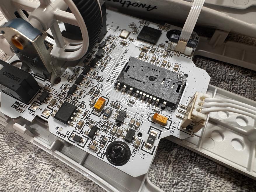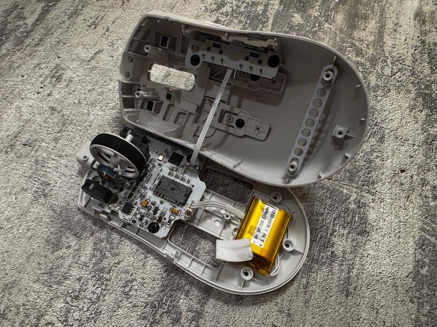 Для того чтобы разобрать мышку нам понадобится снять верхнюю тефлоновую накладку, снять несколько тефлоновых круглых накладок под которыми и располагаются винты крепления. Внутри мышки установлен mcu контроллер pixart par2862 и топовый сенсор PixArt PAW3950, который имеет частоту опроса 125 — 8000 Гц (по умолчанию из коробки установлена частота опроса 1000 Гц. Скорость отклика 1 мс. За беспроводную работу отвечает Литий-ионный аккумулятор на 500 ма·ч, который сможет поддерживать работу мышку 100 часов в режиме (1000 гц; 2.4 ггц), 40 часов в режиме (8000 гц; 2.4 ггц) и до 170 часов в режиме (bluetooth). Основные переключатели тут omron optical, которые имеют ресурс 70 млн, боковые переключатели huano blue с ресурсом 20 млн, в колесике остановлен huano black с ресурсом 10 млн.