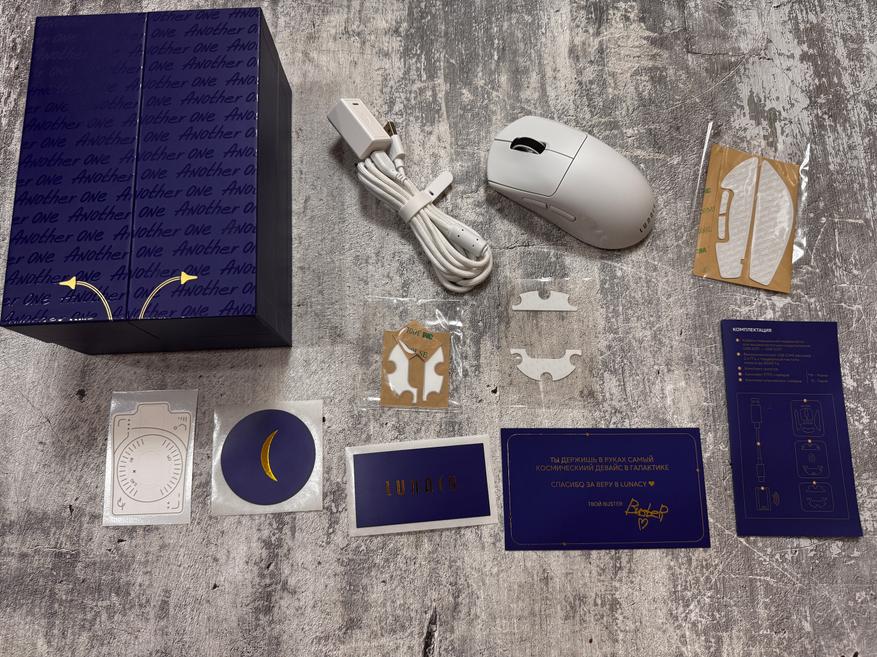 Поставляется игровая мышка Lunacy Аnother Оne в картонной коробке синего цвета с золотыми надписями с двух сторон. На коробке по стандарту мы можем увидеть название модели и технические характеристики. Внутри коробки мышка уложена в форменный ложемент из мягкого материала. Определенно стоит отметить — индивидуальность и подачу мышки. Верхняя часть крышки коробки разделена на 2 части и после раскрытия мышка поднимается в своем ложементе. Определенно дизайнеры и маркетологи приложили руки к созданию данной коробки, чтобы произвести впечатление на покупателя. Внутри коробки находится: мышка Lunacy Аnother Оne, кабель USB Type-C, документация, дополнительная макулатура, аксессуары (глайды, грипсы), ресивер.