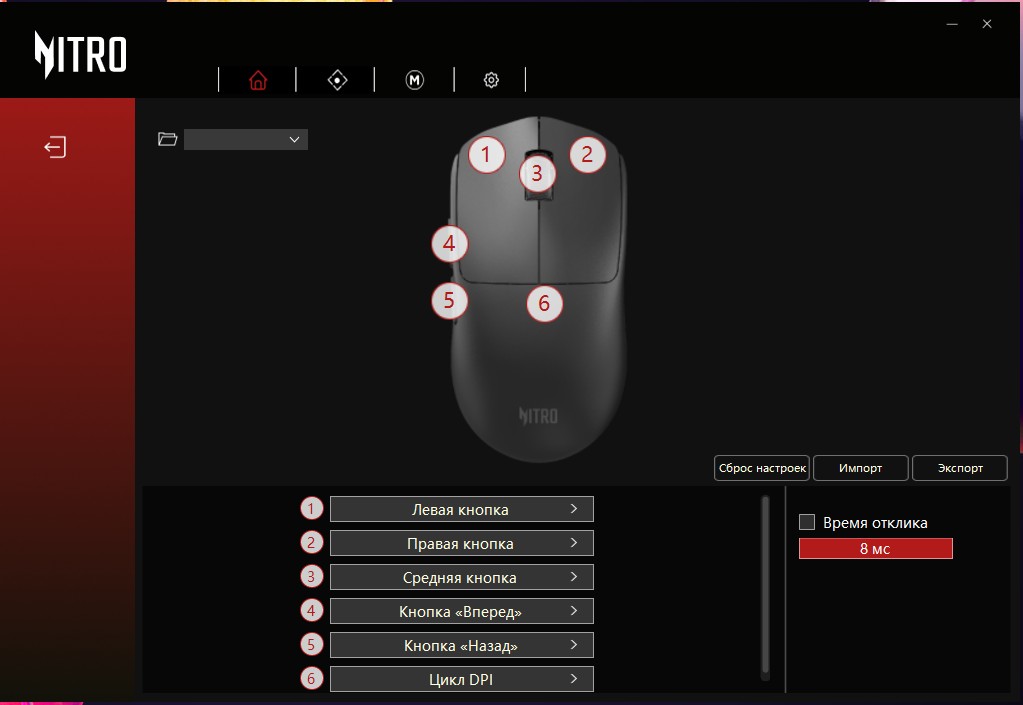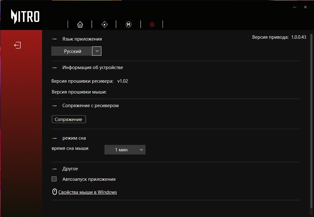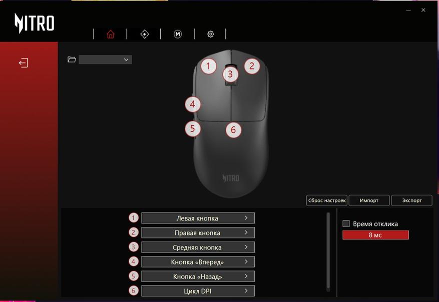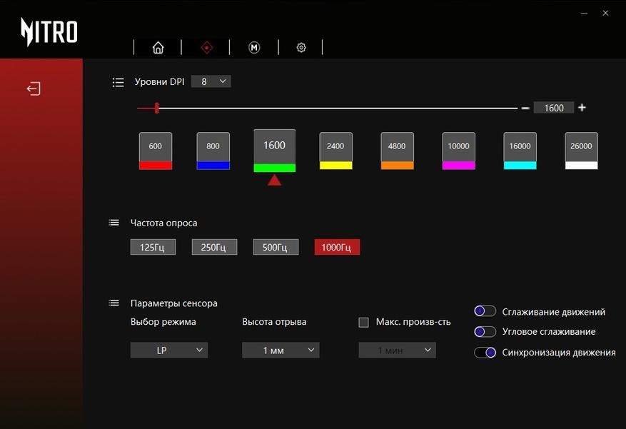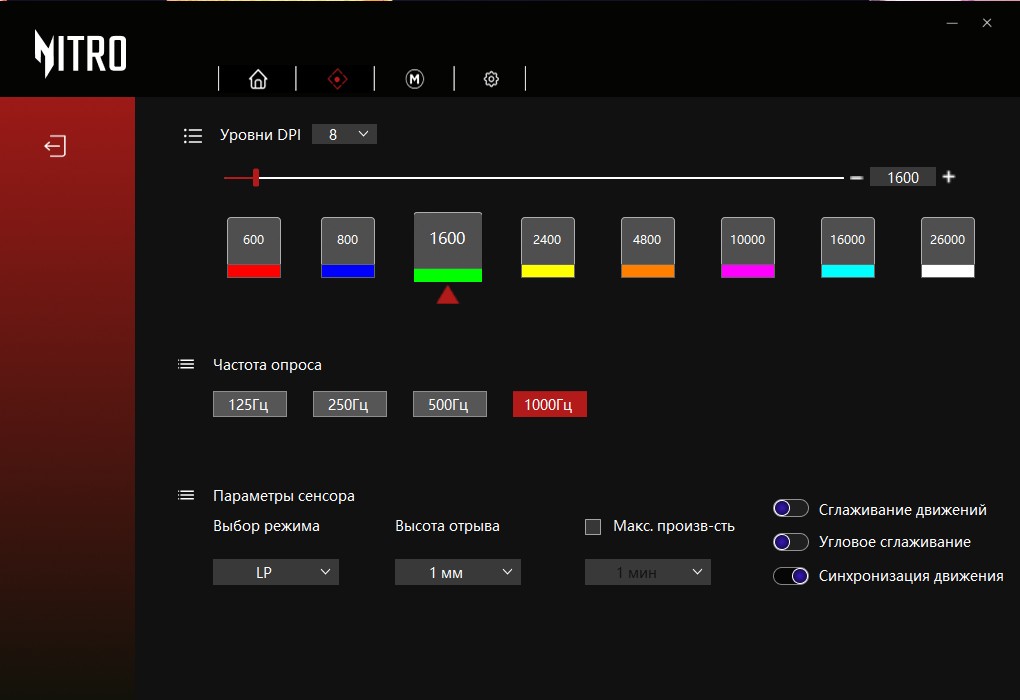 Для игровой мыши Acer Nitro OMR402 с официального сайта компании можно скачать программное обеспечение Nitro, обеспечивающее дополнительные настройки над мышкой. Интерфейс программы интуитивно понятный и отличается минималистичным дизайном, что позволяет быстро освоиться и получить доступ ко всем необходимым функциям.