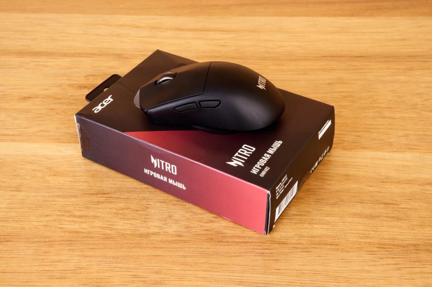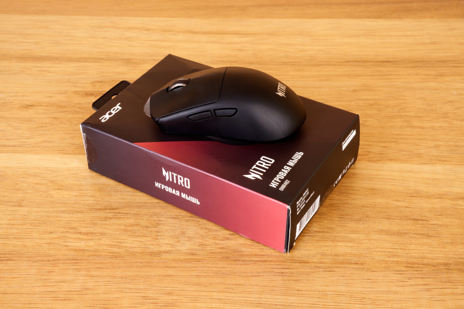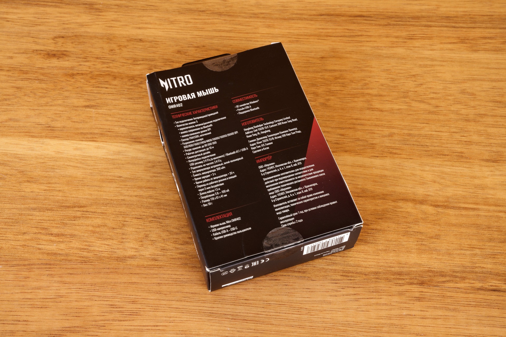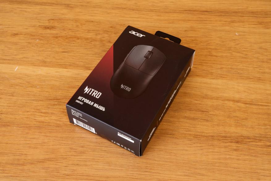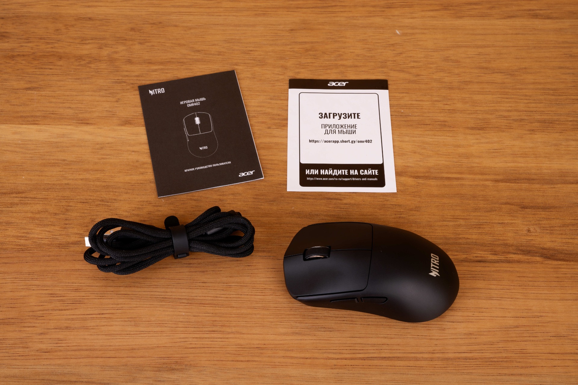 Acer Nitro OMR402 поставляется в лаконичной упаковке из плотного, но легкого картона, украшенной яркой полноцветной печатью. Это тот случай, когда внешняя простота скрывает внутреннее наполнение. Производитель не стал тратить место на ненужные аксессуары и горы бумаг, ограничившись самым необходимым, а именно: мышь, бумажное руководство пользователя и кабель для зарядки и проводного подключения.